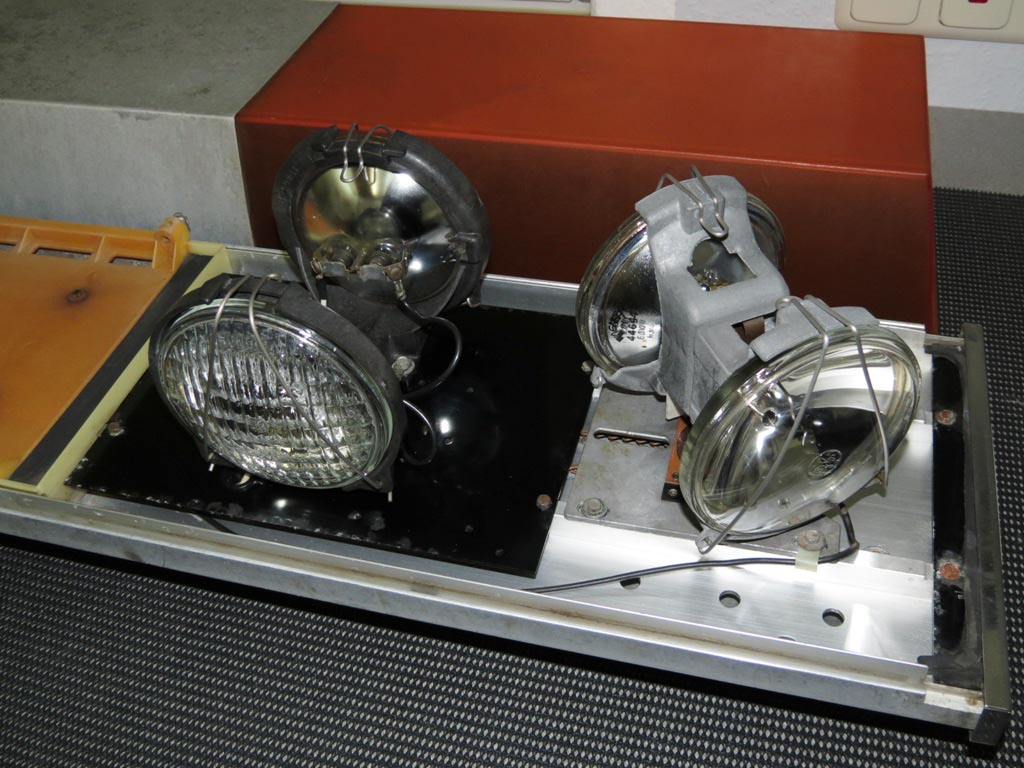 Model 12EF, Serie A3, 12 Volt Der Balken kommt aus den USA und war, zusammen mit zwei ebenfalls gelben „Lollipop“-Lights und zwei Arbeitsscheinwerfern, auf einem Abschleppwagen im Einsatz. Maße (in etwa):