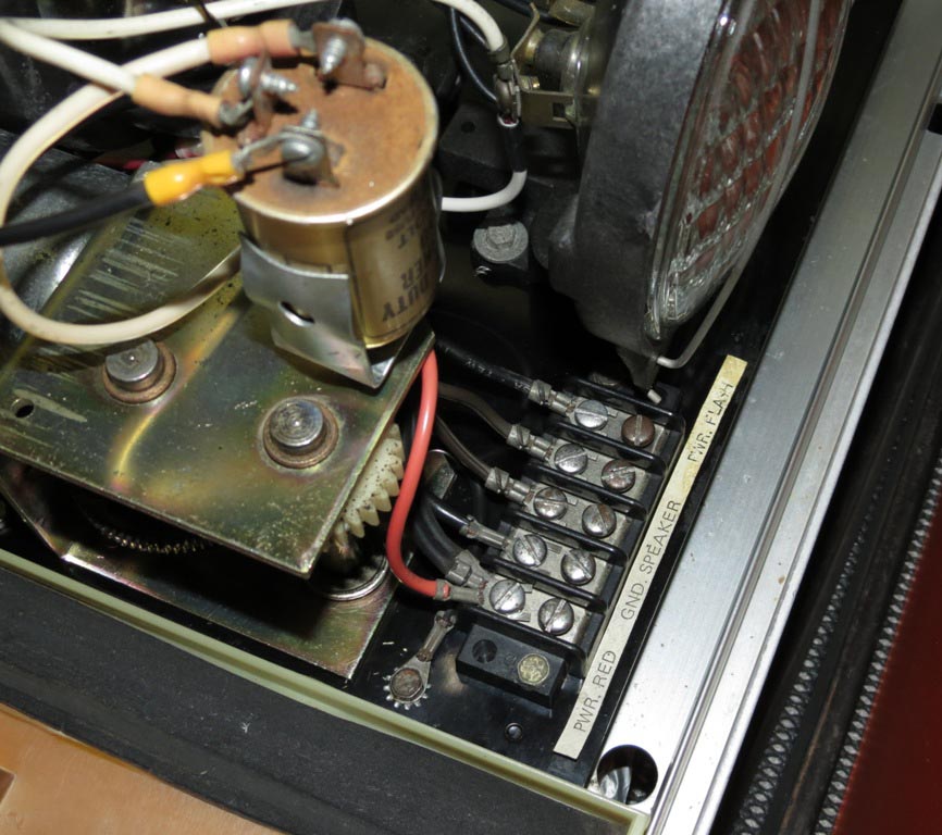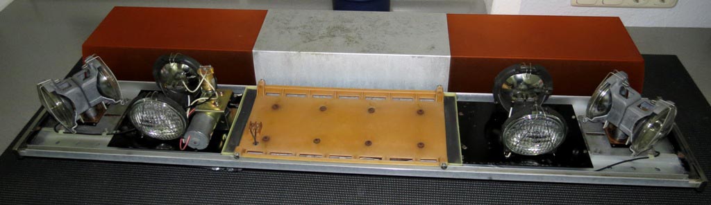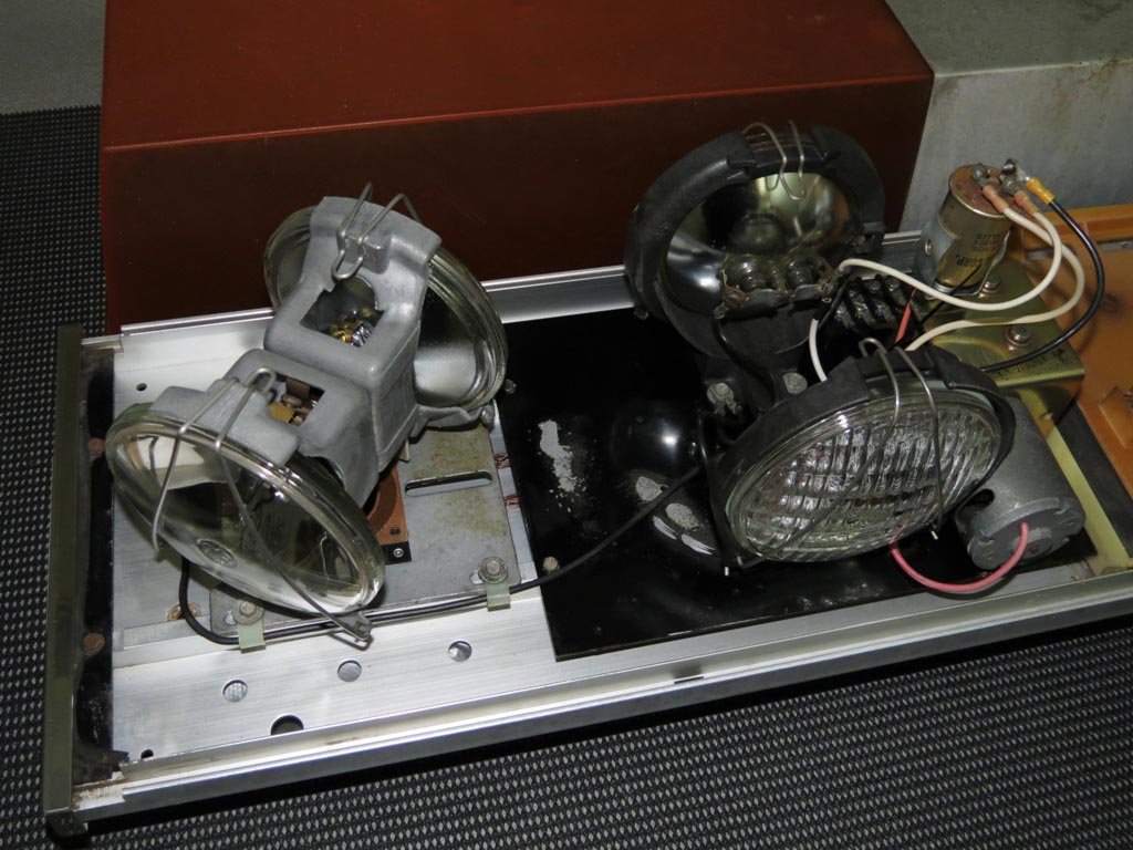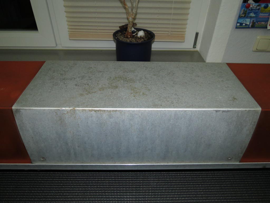 Der Balken ist soweit komplett und unverbastelt. Aber wie von einem Abschlepper-Balken fast nicht anders zu erwarten war, ist er ziemlich verdreckt und die Hauben bzw. die Lautsprecherabdeckung sind stumpf und leicht vermost. Wegen der direkten Befestigung (ohne Abstandshalter) auf einem Bügel über Ladefläche wurde an der Unterkannte der Endkappen ein Stück ausgeklinkt. Ansonsten sind außer ein paar kleinerer Dellen in der Alu!-Lautsprecherabdeckung äußerlich keine Schäden zu erkennen. Das er regelmäßig (und des öfteren) in Betreib war, kann man gut an den ziemlich kurzen Schleifkohlen der Dreher und der sich gelängten Ketten (läßt sich nicht mehr spannen) merken. nach dem Auspacken Der erste Funktionstest war alles andere als erfolgreich. Es bewegte sich nur einer der beiden Doppeldreher und von den insgesamt 8 PAR36 Leuchten haben nur 3 ihren Dienst versehen. Nach dem durchmessen der Leuchten (alle OK) war klar das es an der Verkabelung liegt. Schlechte Masseverbindungen und Kabelbrüche waren die Ursachen für die Fehlerhafte Funktion. Anders als vermutet, ließen sich beim zerlegen alle Schrauben relativ leicht lösen. Ein paar Ansätze von Korrosion sind vorhanden. Dafür, das der Balken vermutlich viel Zeit im Freien verbracht hat, hält es sich erfreulicher Weise in Grenzen. Bei den Hauben und der LSP-Abdeckung bin ich mir noch nicht sicher, ob ich die polieren oder doch lieber so lassen soll. Da keine nennenswerten Kratzer vorhanden sind und sie recht gleichmäßig gealtert (verwittert) sind, gefallen sie mir im derzeitigen Zustand eigentlich. Aufbau/Technik: Die Basis bildet ein stranggepresstes, eloxiertes Alu-Profil (Frame), auf dem die weiteren Komponenten montiert werden. Die beiden Lampenhalter, die Endkappenhalter sowie die LSP-Montageplatte sind direkt montiert. Die Motor/Getriebeeinheit und die Lampenhalter (der Flasher) werden mittels einer Grundplatte auf dem Frame montiert. Die Hauben werden außen von den (mit den Typenschildern versehenen) Endkappen und innen von der LSP-Abdeckung, die bei den Economy-Modellen aus Alu ist, gehalten. Die beiden Lampenhalter, die sich gegenläufig drehen, werden über Antriebsketten von einem gemeinsamen Motor angetrieben und sind somit miteinander synchronisiert. Die Ketten werden über ein Schneckengetriebe angetrieben und können mittels Langlöchern in den Grundplatten der Lampenhalter gespannt werden. Da sich die Lampenhalter (mit je zwei PAR36 Leuchtmitteln) mit drehen sind zur Spannungsversorgung der Leuchtmittel (pro Lampenhalter) ein Schleifring und zwei Kohlbürsten notwendig. Anders als bei den „normalen“ F-Versionen, sind bei den Economy-Modellen 4 Par36 Leuchten als Blinkleuchten verbaut. Durch die zusätzlichen Lampenhalter ist neben dem Motor, wo eigentlich (bei den anderen Modellen) der Klemmblock verbaut ist, kein Platz mehr für den Klemmblock. Aus diesem Grund ist dieser vor dem Getriebe/Motor verbaut worden. |