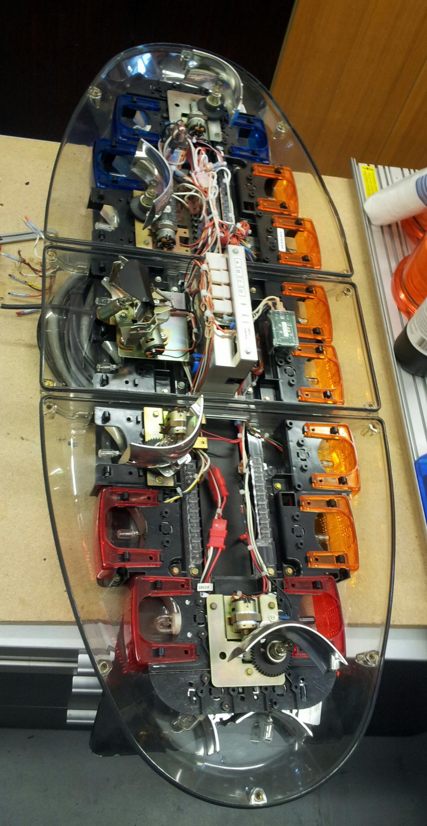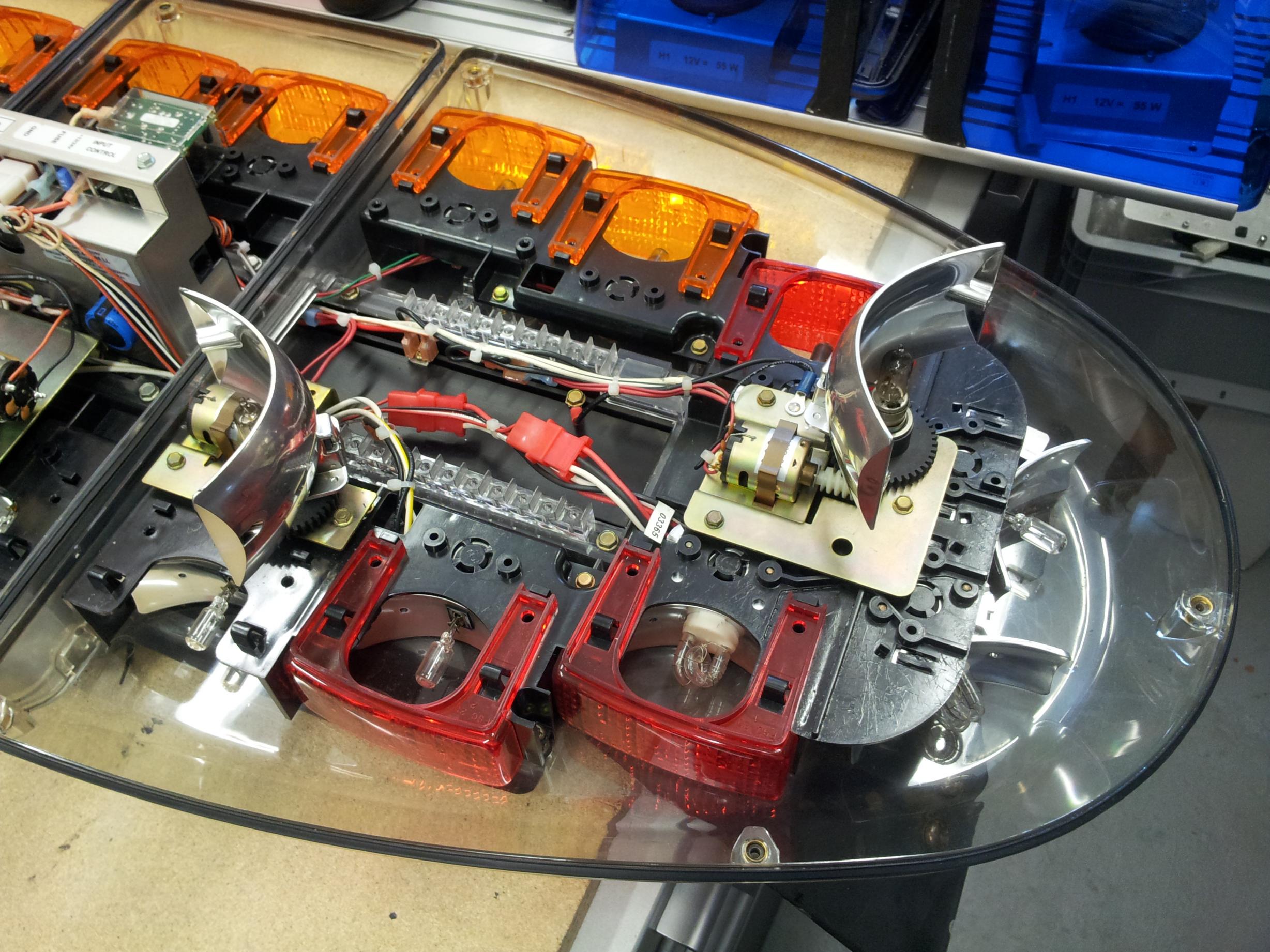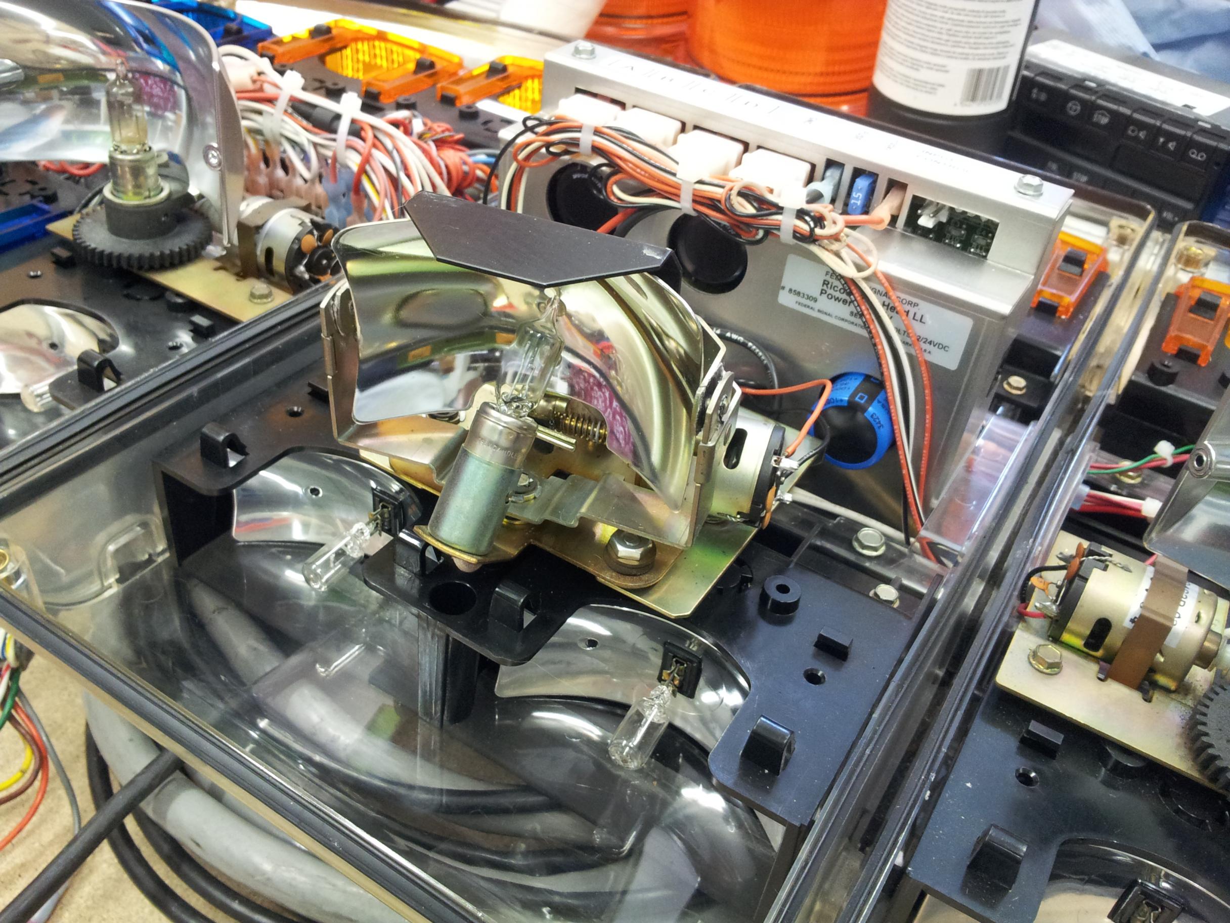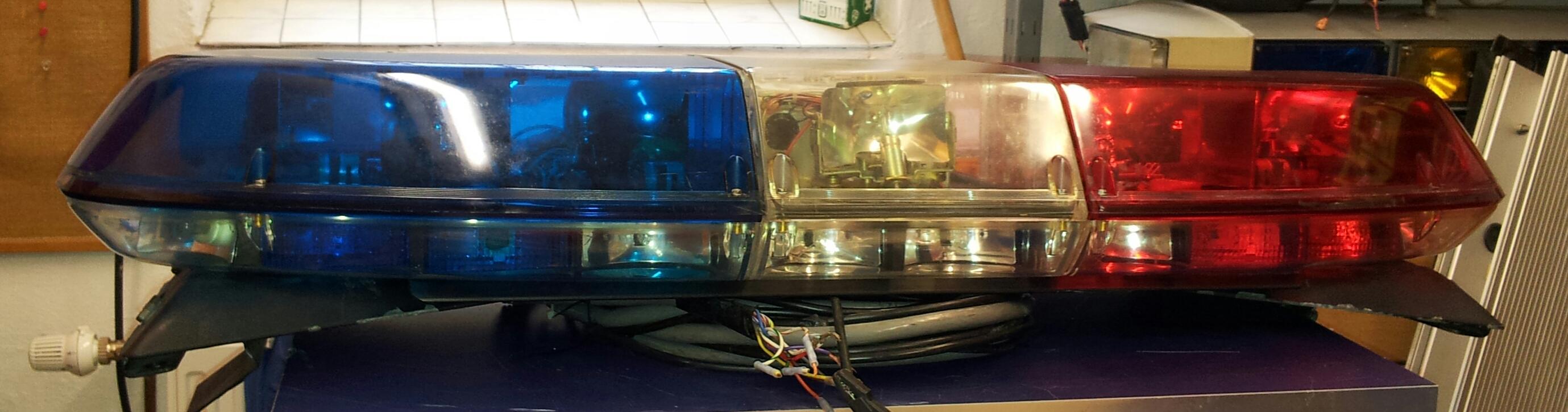 Federal Signal Ricochet Vista - 48" lang - original vom Los Angeles Police Department Diese Version war der unmittelbare Vorgänger der FedSig Arjent beim LAPD. Er verfügt über das Maximum an machbarer Ausstattung und ist wie auf den Innenaufnahmen zu sehen in fast neuwertigem Zustand. Die Ausstattung setzt sich wie folgt zusammen: - 2 langsame Dreher - 2 schnelle Dreher - center traffic clearing light - 4 Takedown Scheinwerfer a 35 watt - alleylights links und rechts, auch blinkend zu schalten - je 1 steady burn light in Rot und Blau nach vorn - intersection strobes links und rechts - je ein blauer und roter Strobe vorn links und rechts - je ein roter und blauer Halogen flasher nach hinten - 6er Halogen Signalmaster Die Strobes werden von der mittig hinter dem TCL verbauten Ricochet Power Supply betrieben. |