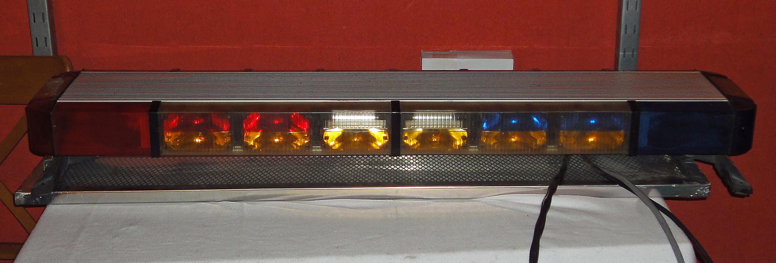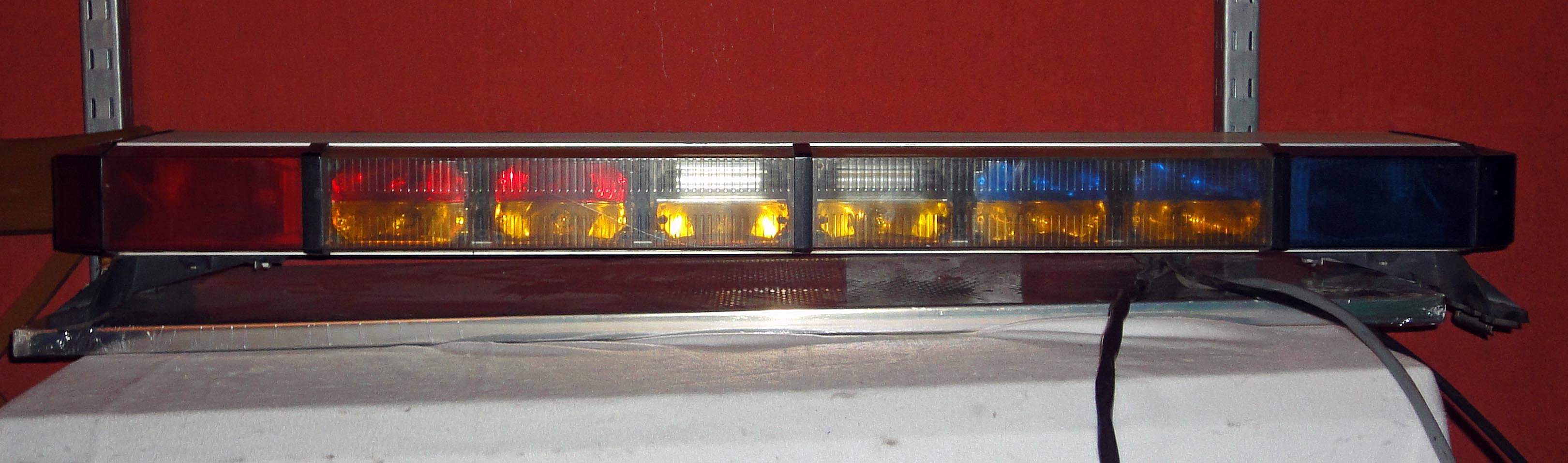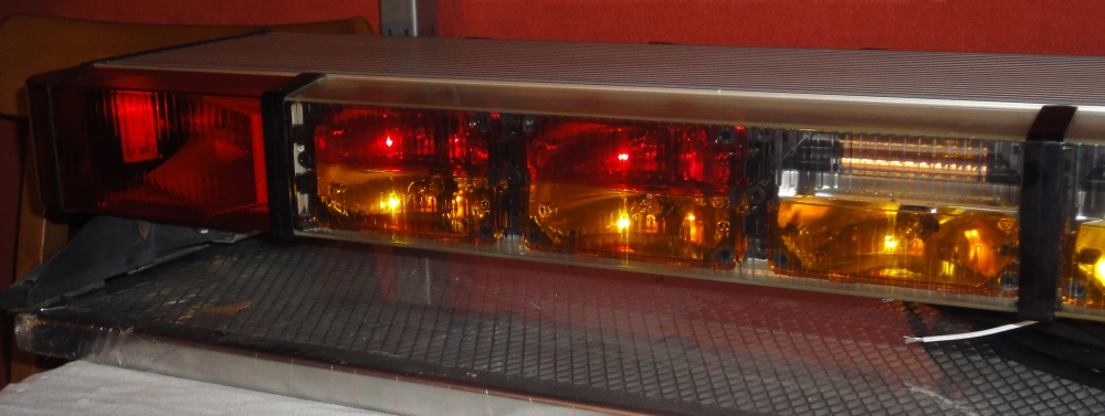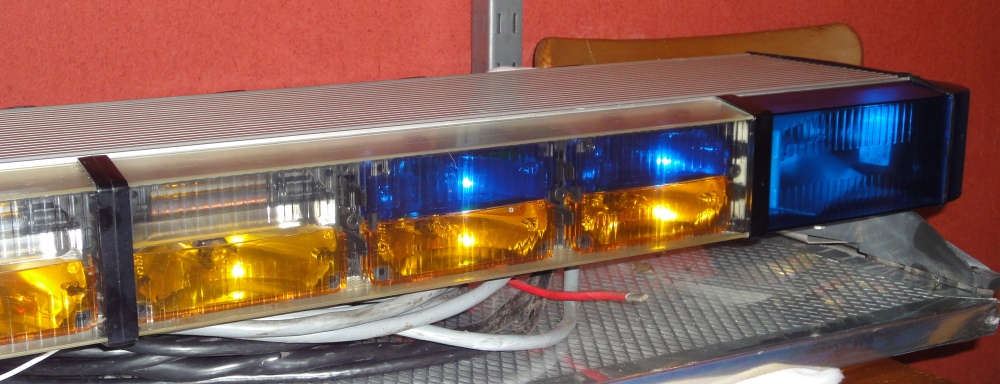 Whelen Edge Ausstattung: Frontseitig: Cornerstrobes, 2 Halogenflasher in Rot und Blau sowie 2 klare Halogenflasher und 1 Piercer in Rot und Blau. Rückseitig: Cornerstrobes, und ein geteilter Aufbau in der oberen Hälfte Blaue und Rote Halogenflasher, in der unteren Hälfte ein Arrowstick. Die Filter liegen innerhalb klarer Hauben, die mittleren Leuchten des Arrowstick sind nach oben nicht zu der klaren Hälfte abgegrenzt, so das bei Betrieb des Arrowstick in der Mitte Gelb ind Weiß leuchtet. Auch diesen Aufbau habe ich noch nie gesehen. Ursprung des Balken ist noch nicht geklärt. |