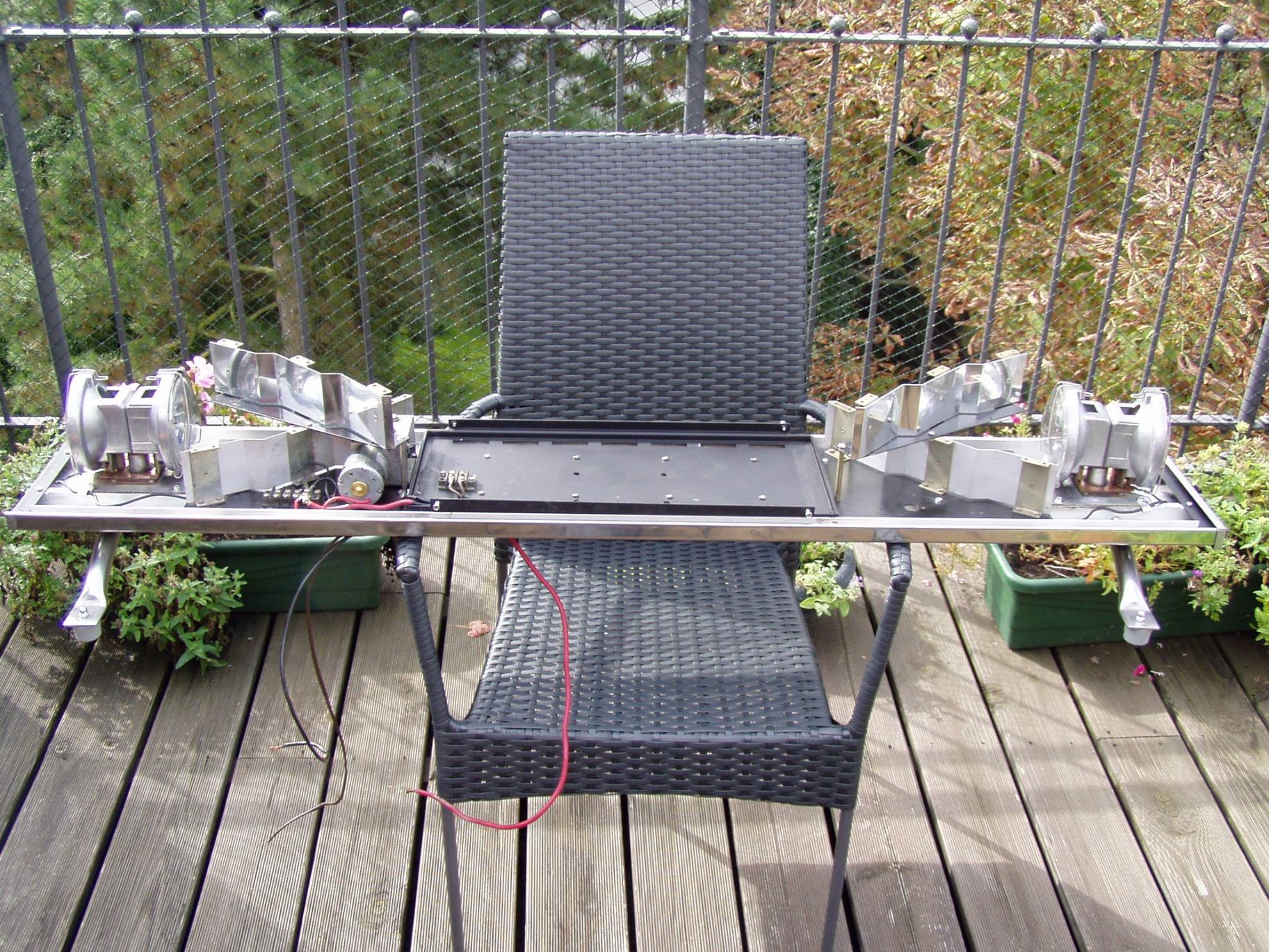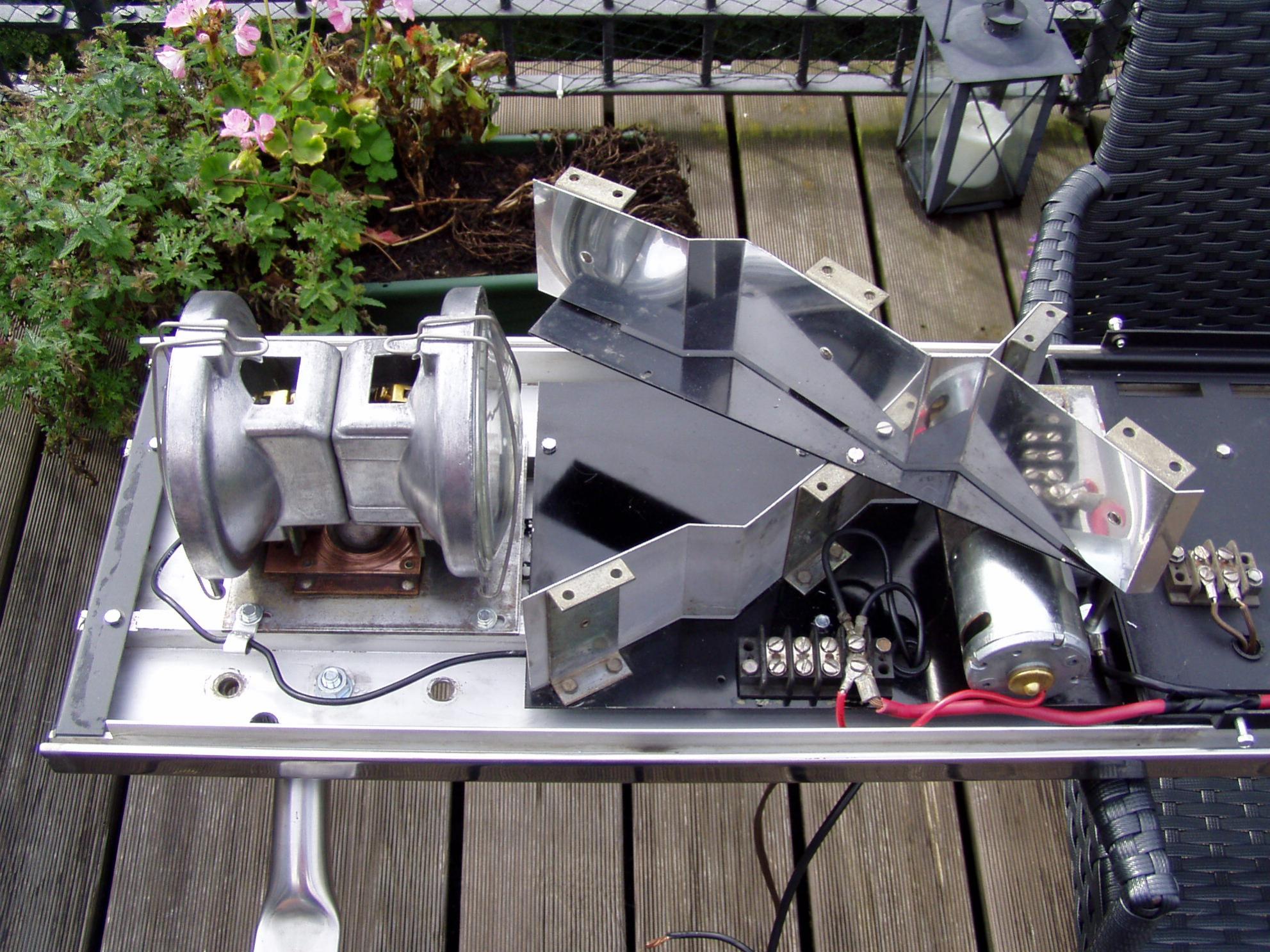 Entweder klar mit farbigen sealed beam oder rot/amber oder rot/blau. Die eine rote Haube wäre notfalls aufzuarbeiten. Hat aber bereits die kleinen Spannungsrisse. Die andere blaue Haube ist eine Code3 SD Haube und bedarf etwas mehr Mühe... ---------- So isses. Nun geht alles links unten bei dem Stopfen raus... |