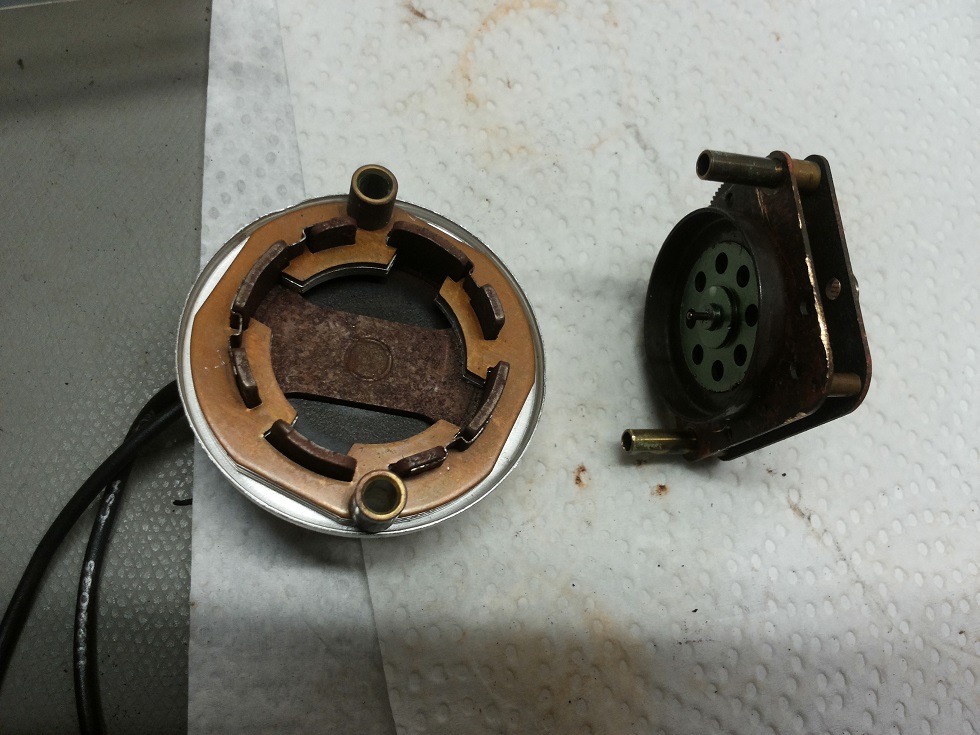 ![]() ![]() Heute ist mir die Lampe wieder in die Finger gekommen und ich hab mich kurzerhand dazu entschlossen, sie jetzt endlich mal in Betrieb zu nehmen. Betriebsspannung ist 120V, habe mir deshalb eben einen 230V/120V Umrichter bestellt. Als ich die Leuchte zum reinigen und überprüfen zerlegt habe ist mir aufgefallen, dass die Antriebswelle des Motors lose war und kein Drehmoment zum Getriebe übertragen konnte. Habe den Motor zerlegt (leider nicht zerstörungsfrei) die rostigen Teile weitgehend gesäubert und erstmal trocken zusammen gesetzt. (Auf dem Bild fehlt noch die Geäuseschale für das Getriebe) Unterhalb des Getriebes ist eine scheinbar magnetisierte ferromagnetische Halbschale montiert, in dessen Mitte ein eine Nabe aus Aluminium gepresst ist. Diese taucht nach der Montage in das magnetische Drehfeld des Spulenkörpers ein und überträgt das Drehmoment zur Getriebewelle. Jetzt warte ich auf den Wandler und bin gespannt, ob die Leuchte hinterher funktioniert