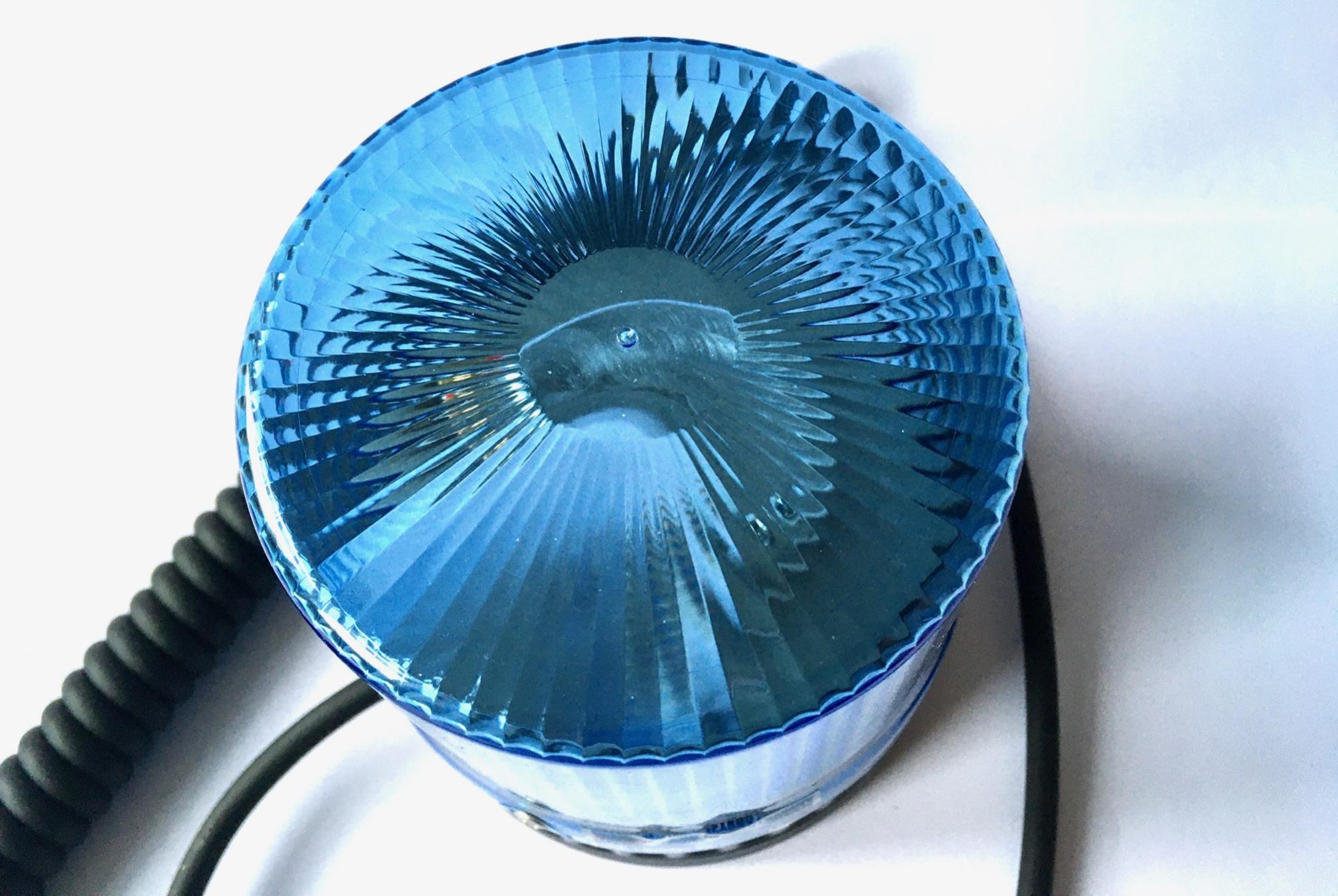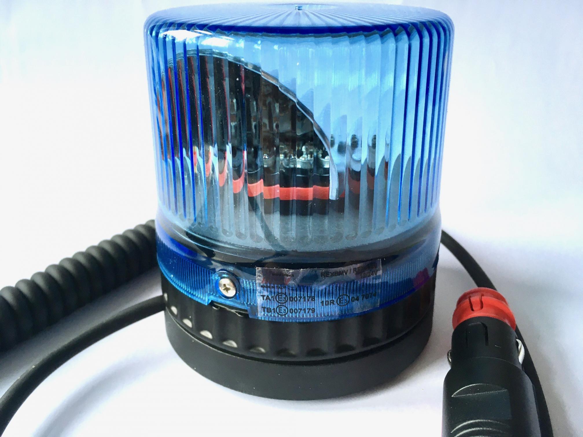 Spannung 12-24Volt 3x 3 W LED LED Farbe blau Drehspiegelfunktion mit Treibriemenantrieb Magnetmontage mit zwei Neodymmagneten und Saugfüßen Anschluss an Zigarettenanzünderstecker Abmessungen ca 9x10cm Zulassung nach ECE R 65 |