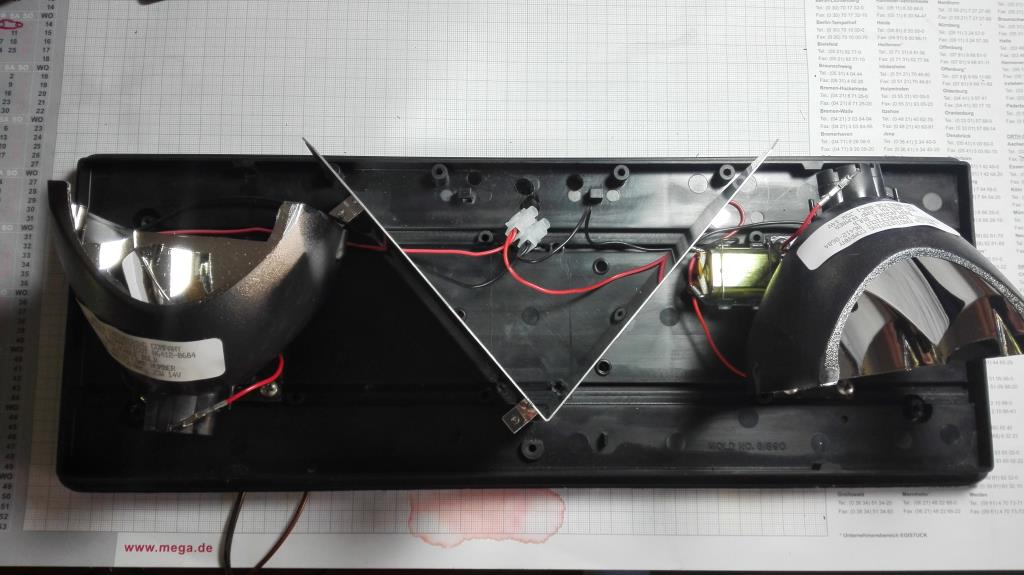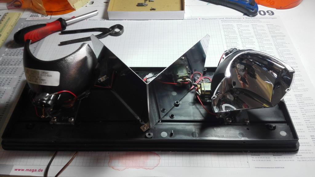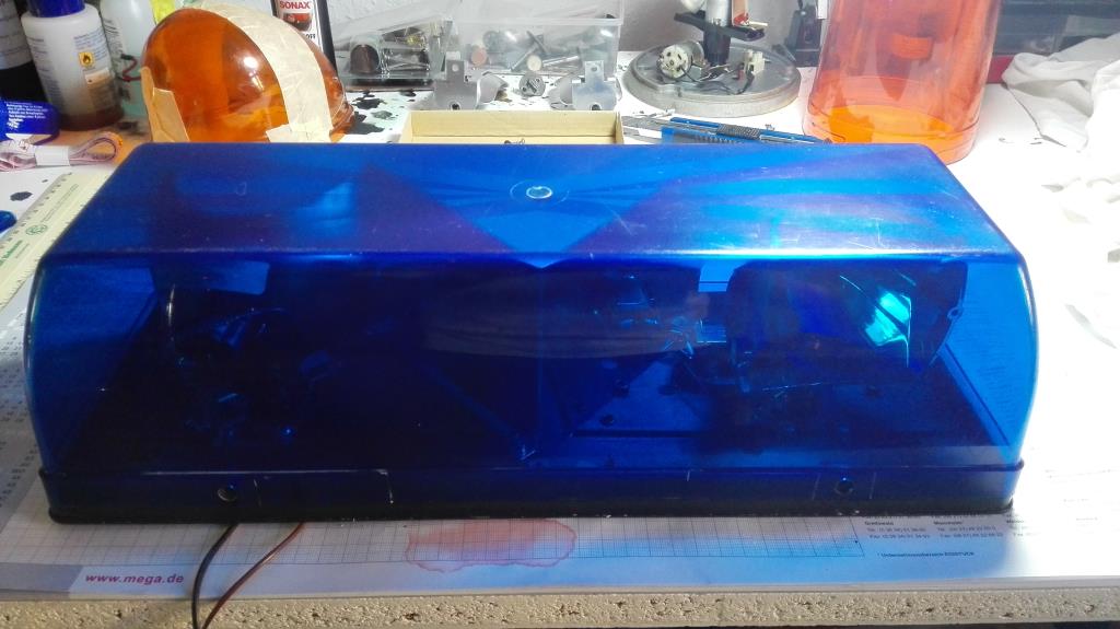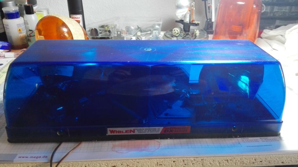 Typ: Responder II DX Volt: 12V Produktionsjahr: unbekannt Hab bei ebay KA eine Whelen Mini lightbar ergattert. Eigentlich nur, weil recht billig (60€) und Made in USA. Aber das Ding ist eigenlich nur Plastik. Ich bin mir nicht sicher, ob das nicht ein Fernost Teil ist, was bei Whelen umgelabelt wurde. Es hat 2 Drehspiegel, die per Schneckenantrieb bedient werden. Als Leuchtmittel dienen 2x 35W Birnen. Dazu kommt noch ein V-Spiegel, der das Licht nur nach vorn bündelt. Interessant ist bei den verchromten Plastikreflektoren, das diese sehr tief geformt sind. Man kennt sonst nur recht flache Körper. Die Haube ist ohne Risse oder Spannungsnetze, aber einige tiefe Kratzer. Ich werde sie gegen eine neue austauschen. Eventuell schwebt mir auch eine split Haube vor. |
