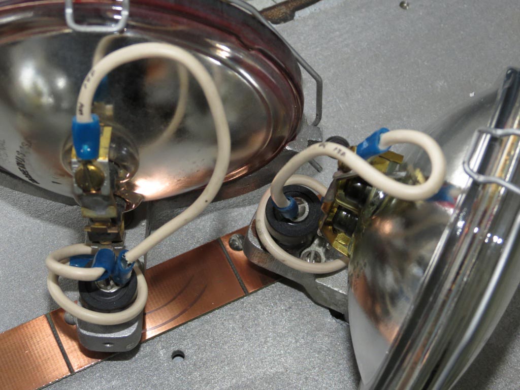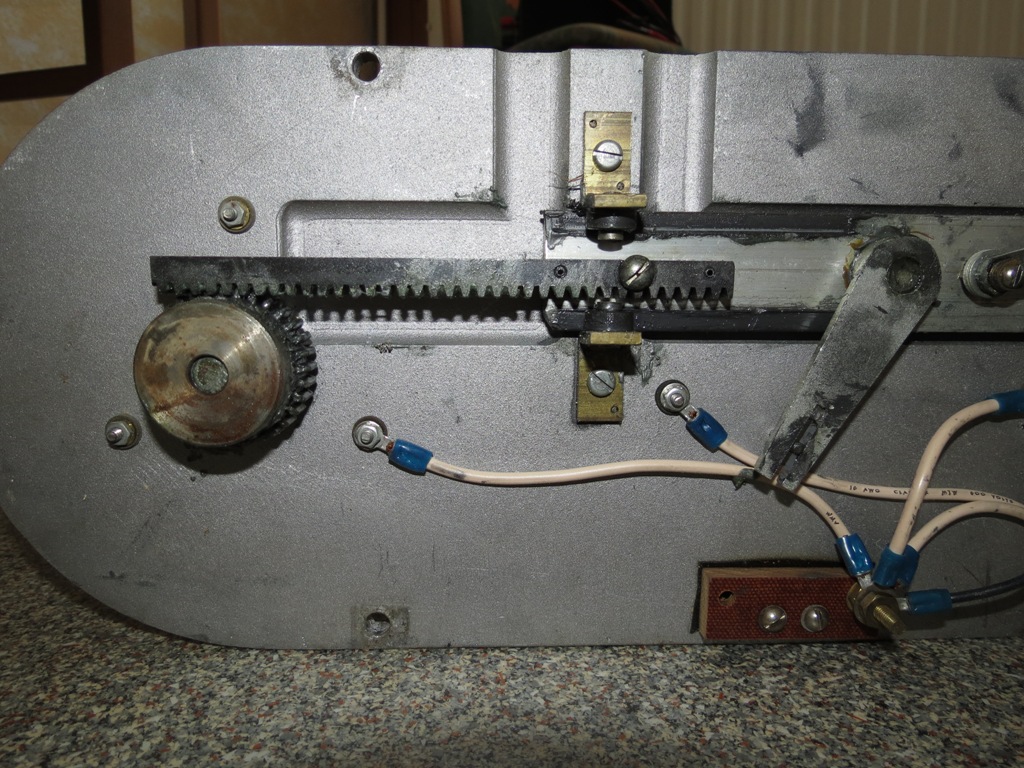 Das es mitunter Eng zugeht, ist Timing alles! Zustand bei Erhalt: Die Haube wurde mal teilweise von innen lackiert und hat zwei Sprünge. Ist zwar ärgerlich aber zumindest ist die Haube da und die Schadstellen sind oberhalb der Leuchten, sodaß man sie durch lackieren der Oberseite (wäre ja nicht unüblich) etwas kaschieren könnte (wenn man denn wollte). Da der allgemeine Zustand für das Alter doch noch recht gut ist (abgesehen von der Haube), werde ich den Zustand wohl lediglich bewahren. Außer den beiden Sprüngen hat die Haube noch einen leichten Hitzeschaden. An einer Stelle (Mitte rechts vorn) ist sie etwas verformt und an zwei anderen ist eine leichte Blasenbildung zu sehen. Von der eigentlich 4-teiligen Haubedichtung fehlt ein gerades Stück. Da die vorhandenen Teile etwas geschrumpft sind (Schraubenlöcher passen nicht mehr) ist das nicht weiter schlimm. Müßten eh neue angefertigt werden. Was bisher geschah: Nachdem der erste Probelauf nicht sehr erfolgreich verlief (der Motor zuckte kurz und die Lampen gingen an), hab ich mir das ganze mal etwas genauer angeschaut. Die gute Nachricht ist: Der Motor ist i.O. (lief Solo problemlos) Durch das alte zähe/klumpige Graphitfett war ein zerlegen der Mechanik unumgänglich. Alle Einzelteile wurden zunächst vom alten Fett befreit und auch ansonsten nur gereinigt. Die Lagerbuchsen weisen zwar etwas Spiel auf, da sie aber eingekörnt und geklebt sind habe ich von einem erneuern erst einmal abgesehen. Da einige Kabel mal zwischen Grundplatte und Gehäuse eingequetscht waren, hab ich die Verkabelung erneuert. Nach den Kleben der Brüche/Sprünge ging es ans schleifen und polieren der Haube. Und zwar von außen und innen. (das durchgehärtete Gewebeklebeband ließ sich ganz phantastisch schleifen) ![]() Aufbau/Technik: Das Gehäuse (unten offen) besteht aus Alu-Guss. In ihm wird die Grundplatte mit der gesamten Mechanik eingelegt und mit 6 Schrauben befestigt. Die Haube wird zusammen mit dem Zierring am Gehäuse mit 8 Schrauben gesichert. Die Haubendichtung besteht aus 4 Teilen und wird durch Kleber auf dem Gehäuse fixiert. Alle 5 Leuchten werden von einem Motor angetrieben. Die beiden äußeren werden über Zahnstangen und die 3 inner mittels Hebelarmen bewegt, wobei zwei der mittleren Leuchten ihren Drehpunkt direkt in der Zahn-/Schubstange haben. |