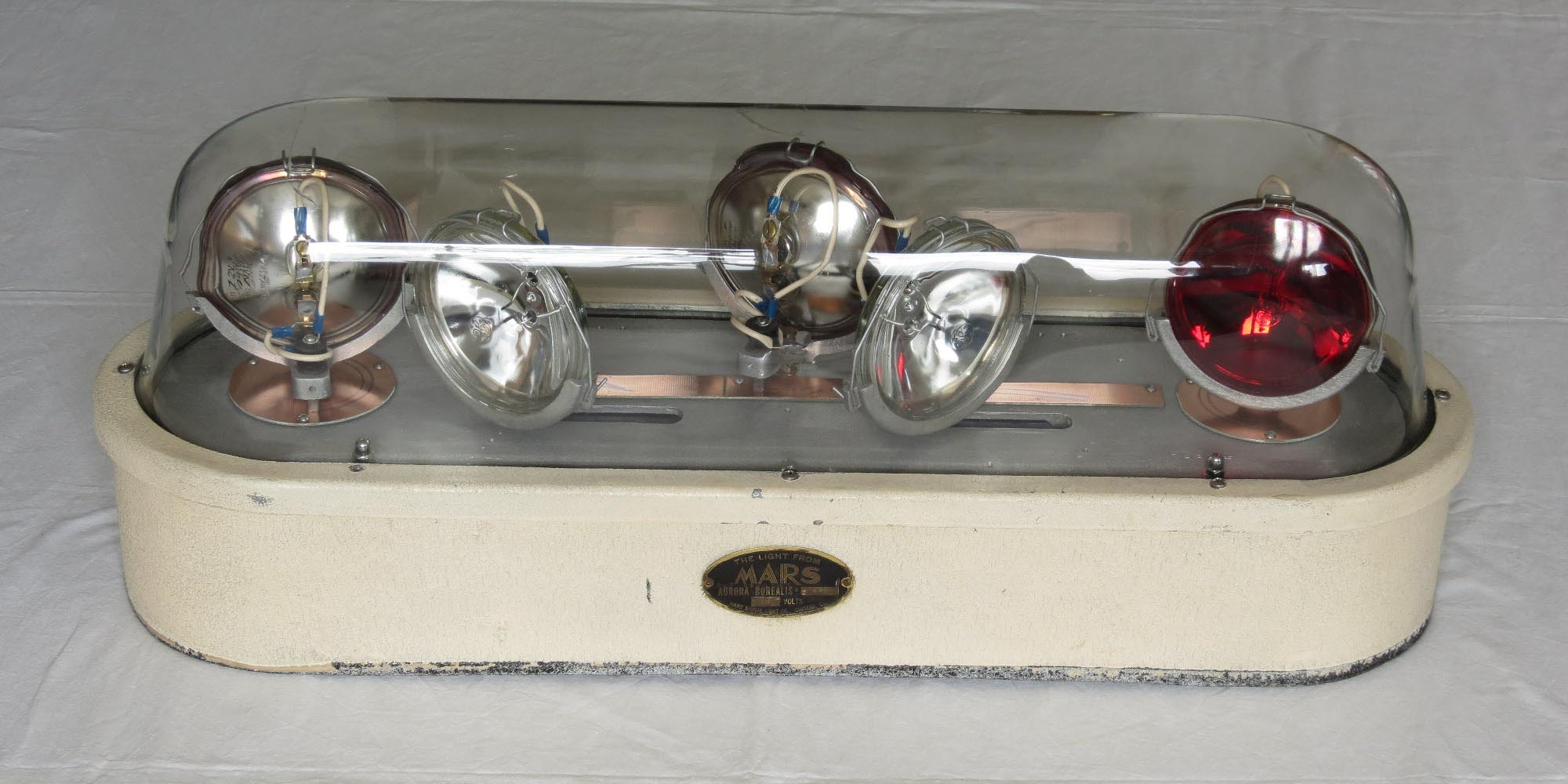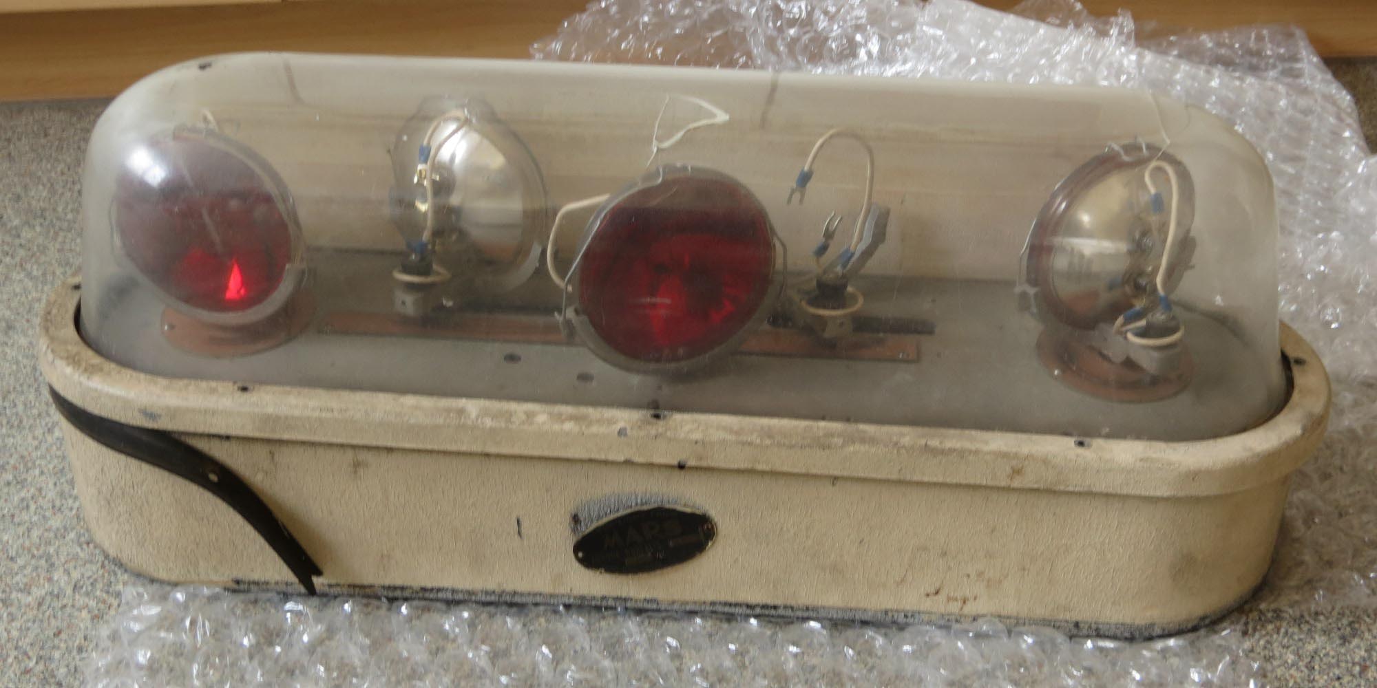 ![]() MARS SIGNAL LIGHT COMPANY - Aurora Borealis Model 500, 12V, Serial No. 438 Anhand des schwarzen Typenschildes und der rauen Gehäuseoberfläche (die späteren waren poliert) kann man erkennen, das es sich um eines der frühen Modelle handelt (zumindest was den Sockel betrifft). Die ersten AB hatten noch federbelastete Blechstreifen (anstelle der Drahtbügel), die mittels kleiner Stift gesichert waren. Die Nummer auf der Grundplatte müßte eigentlich mit der Serien-Nr. übereinstimmen, was sie aber leider nicht tut. Das, die neueren Drahtbügel und ein nachträglich vor der Serien-Nr. eingeschlagenes R lassen mich daran zweifeln, dass die AB so Erstausgeliefert wurde. (was mir aber ehrlich gesagt völlig egal ist) Meine Vermutung: Entweder wurde die AB mal Überholt und im Zuge dessen Teile durch neuere ersetzt, oder es wurde einfach aus mehreren Leuchten eine relativ gute zusammengesucht. Die AB kann in zwei Stufen angesteuert werden: Mit der Stufe eins werden die beiden äußeren (roten) Leuchten zusammen mit der nach hinten gerichtetet (ebenfalls roten) Leuchte eingeschaltet. Natürlich incl. Motor. In der zweiten Stufe folgen dann die beiden nach vorn gerichteten (weißen) Leuchten. Maße (circa):