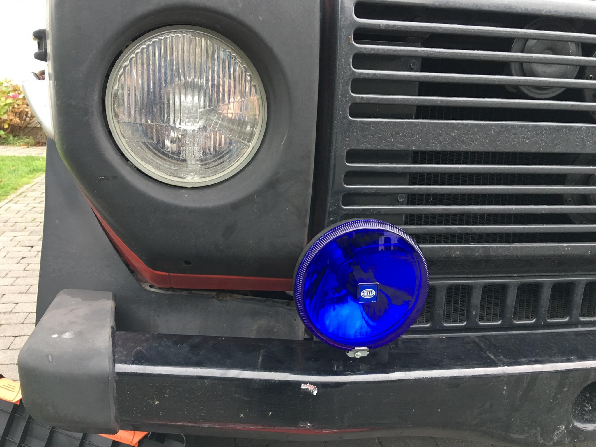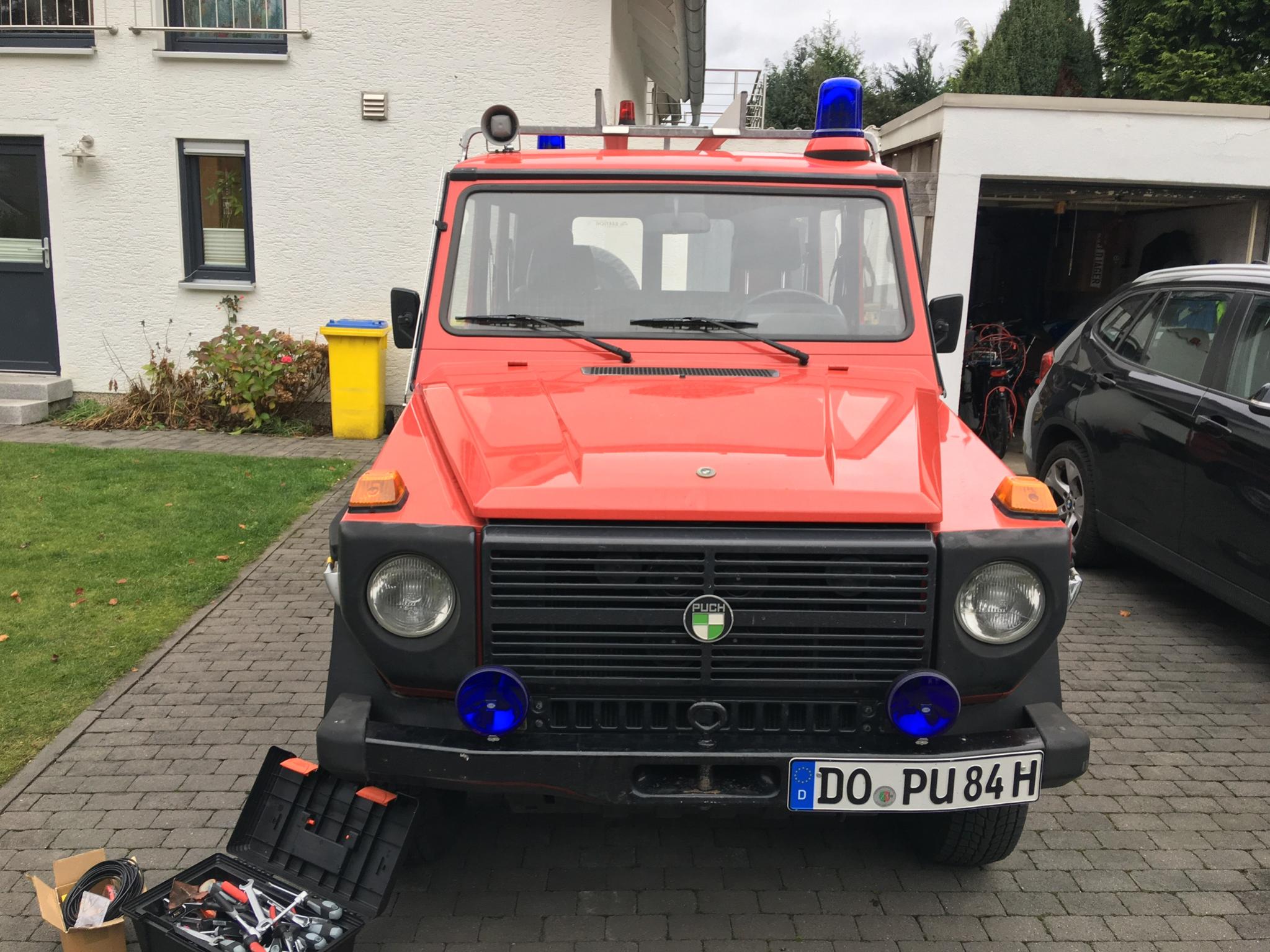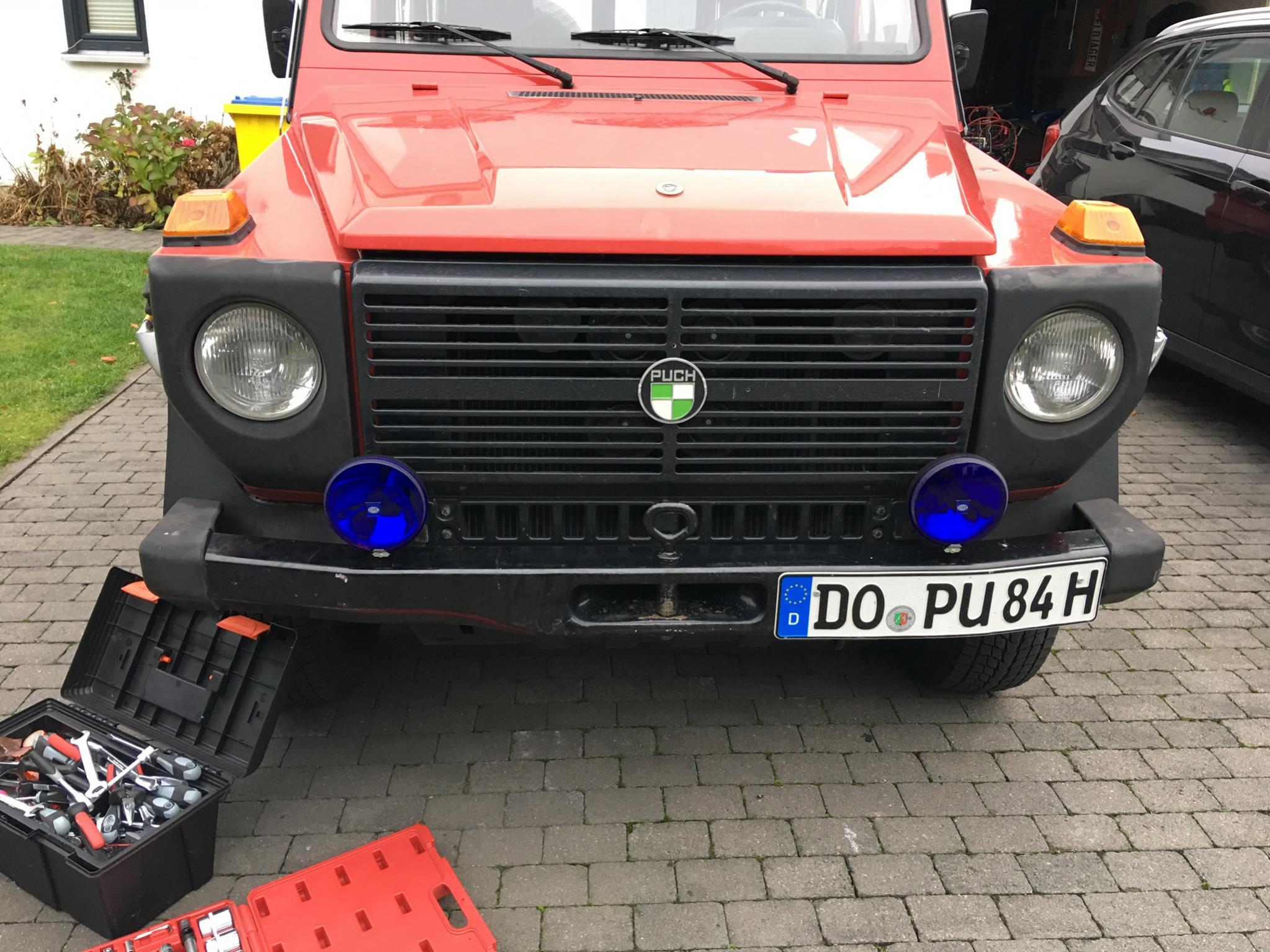 Einserseits zu schade, richtig, andererseits sinddie Frontblinker ja exakt im Gehäuse der Hella Comet 500 Nebelscheinwerfer, die z.T. auch von Mercedes/Puch als Erstaurüstung am G verbaut wurden. Heißt, ich nutze die originalen NES-Halter und habe dennoch die äußerst coole, "quasi-originale" Optik des Oldtimers Außerdem sitzen hinterm Kühlergrill schon 2 normale Hupen plus die 4 Starktonhörner. Ein bisschen Luft muss ja auch noch durchkommen