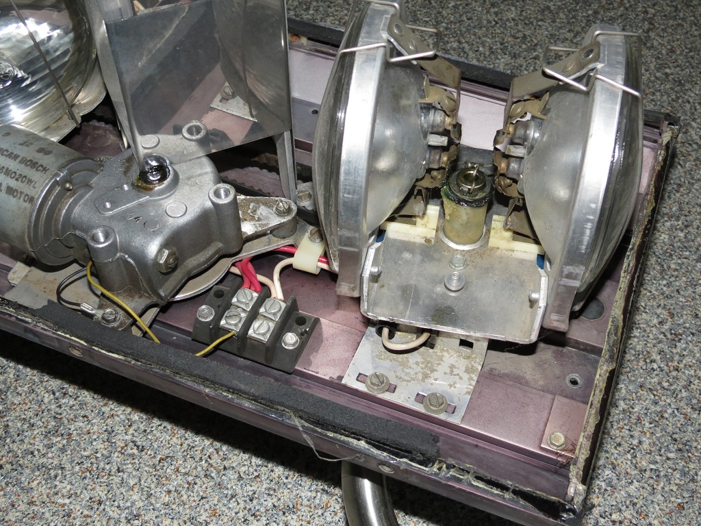 Zustand bei Erhalt: Der Balken war komplett und befand sich, als ich ihn bekam, in einem relativ guten Zustand. Anscheinend wurde aber mal eine Haube gegen eine rote Standard-Haube (ohne den großen cutout) ersetzt. Was bisher geschah: Die Standard-Haube ohne cutout konnte ich glücklicherweise schon durch eine mit cutout (an der richtigen Stelle) ersetzen. Ansonsten benötigt das Alu-Grundprofil eine klein farbliche Auffrischung und ein großer Service ist auch mal fällig. Fortsetzung folgt ... Aufbau/Technik: Die Basis bildet ein Alu-Profil welches auf der Unterseite mit zwei (der Länge nach verlaufenden) Nuten zur variablen Befestigung der Montagefüße versehen ist. Die einzelnen Komponenten werden direkt auf dem Alu-Profil befestigt. Die Hauben werden, genauso wie die LSP-Abdeckung, von außen mittels Schrauben am Alu-Profil befestigt. Die beiden linken und rechten Lampenhalter werden jeweils über einen Antriebsriemen von einem Motor angetrieben und sind somit miteinander synchronisiert. Zwischen der rechte und der linken Seite besteht keine Verbinndung. Bei den äußeren Lampenhaltern sind die Leuchten im Abstand von 180° und bei den inneren von 120° (240) montiert, wodurch sich unterschiedliche Blinkmuster ergeben. Außerdem erfolgt die Spannungsversorgung zu den sich drehenden Leuchtmitteln ausschließlich über die (Dreh-)Achse (außen - / innen +) und nicht mittels einer Kohlebürste. Je nach verbauter Zusatz-Option können je Doppeldreher zusätzlich bis zu 2 Kohlebürsten pro Lampenhalter verbaut sein. |