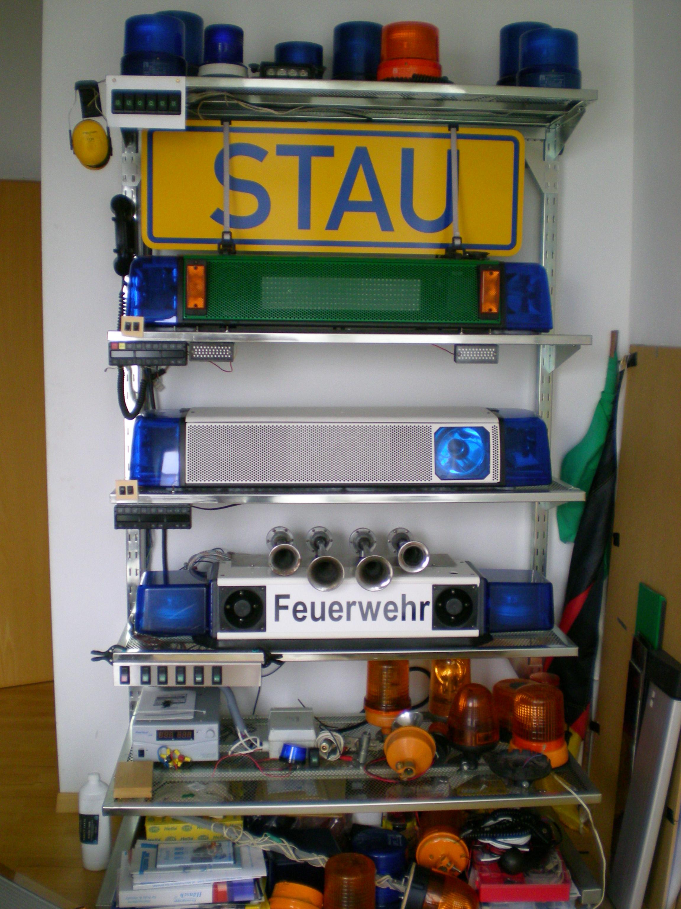 Vor ab, bitte entschuldigt das leichte Chaos in meine Ersatzteilabteilung, aber demnächst soll noch ein Regal dazu kommen ![]() Zuerst meine Übersicht. Ich werde die Leuchten immer Regalbrettweise vorstellen. Alle Leuchten die ihr in meiner Sammlung seht sind funktionstüchtig und auch alle angeschlossen. Auf dem obersten Boden befinden sich nur Leuchten von Hänsch. Die folgenden Leuchten haben alle 12V und können über die Schalter geschaltet werden. Ich denke jedem dürfte diese Leuchten bekannt sein ![]() 2x Hänsch Comet 3X Hänsch Saturn 1x Hänsch Typ 08 ? 1x Typ 09 mit Sputnik Nano Mobil 1x Comet-M Gelb 9-32V Und die Schalter Als nächste kommt eine RTK 6SL POL die Anlage ist ausgestattet mit: KL-XR LED-ASG vorne und hinten LSP-V LSP-H HWL-GL Stauschild KL-A sowie eine BE Meine RTK 6 SL NA Ausstattung: KL-XR BSX-F NA-ASG vorne und hinten LSP-V HWL-LED angeschlossen sowie eine BE Mein DBS 3000 (Lieblingsbalken ) Ehemals POL DBS, habe ihn umgebaut, die ASG´s rausgeschmissen und neu Pulverbeschichten lassen. http://sosi.myds.me/forum/showthread...light=DBS+3000 Zur Ausstattung: Doppelblitzer Sosi Typ 400 Martinhorn GM 2297 aufgebaut. Gesteuert wird der DBS über Einzelschalter. Die Martin ist natürlich auch angeklemmt Als letzter Balken kommt meine Whelen Mini-Edge, der hat momentan leider kein Platz im Regal, wenn das neue Regal da ist aber schon. Der Mini-Edge hat 4 Cornerstrobes mit Trippelblitz Meine Gelblicht-Ecke Die soll auch umgelagert werden, bisher nur einfach hingestellt ![]() Zu guter Letzt mein Ersatzteil- und Kataloglager. Da liegt alles was sich so ansammelt, was man vielleicht mal brauchen kann, Ersatz- sowie Reparaturteile. Davon gibts jetzt aber kein Bild, das ist wirklich zu unordentlich.