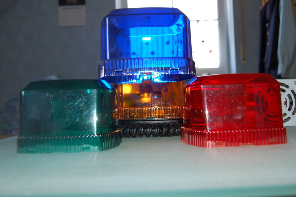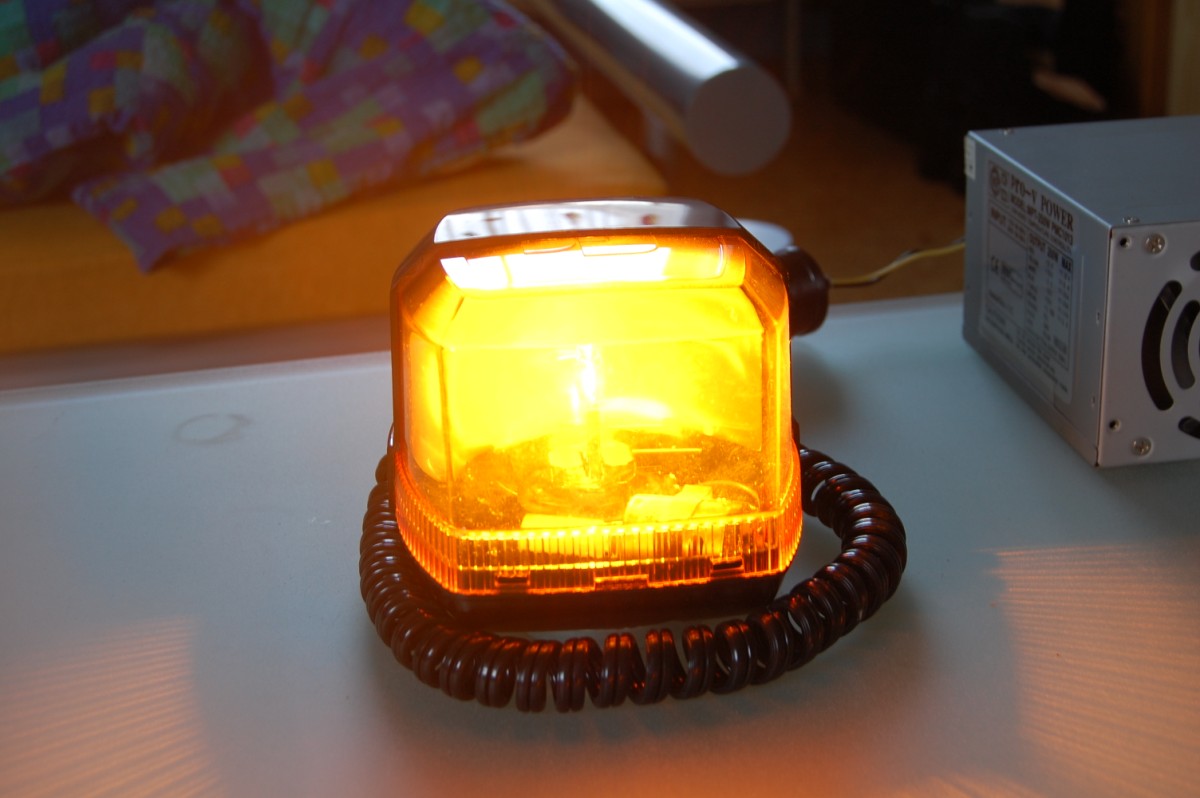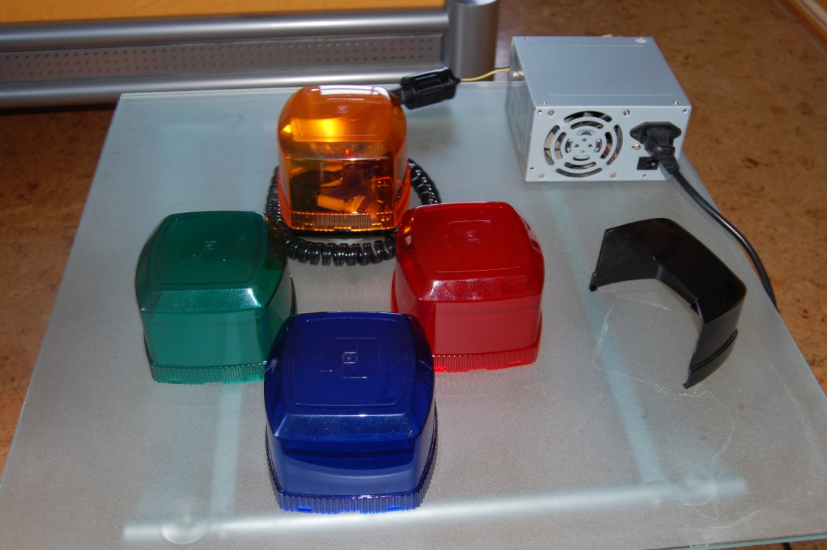 Kommen wir nun zu der vielfältigsten Leuchte, die ich habe. Eine Federal Signal Firebeam. Die Leuchte ist ohne schaltbare Geschwindigkeitsstufen. Zu dieser Leuchte haben ich 4 Hauben: Orange, rot, blau und grün. Außerdem habe ich dieses Schwarze Ding, das die Leuchte nicht blendet wenn sie auf dem Amaturenbrett steht.
