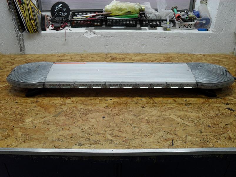 Er ist rot/blau vorne und rot/orange/blau hinten, dazu noch alley-lights und takedown-lights. Einstellbar sind 38! verschiedene Blitz-, Blink- und Leuchtmuster dazu diverse Traffic-Advisor Muster wie "Aufbaulicht" "Lauflicht" usw., sowie 3 verschiedene Leuchteinstellungen der alley-lights zum jeweiligen Warnmuster. Die vielen "LED-Gezappel-Muster" sowie die Helligkeit und Farbintensität zaubern beim Spielen ein dickes Grinsen ins Gesicht .Da sich der Lack auf den "Endkappen" löst, werden diese komplett entlackt und neu lackiert. Dass das auf mich zu kommt wusste ich aber schon beim Kauf. Dafür ist er technisch in einem Top Zustand, alle LEDs funktionieren einwandfrei. Hier mal ein paar erste Bilder bevor ich den Balken komplett zerlege und aufarbeite: |