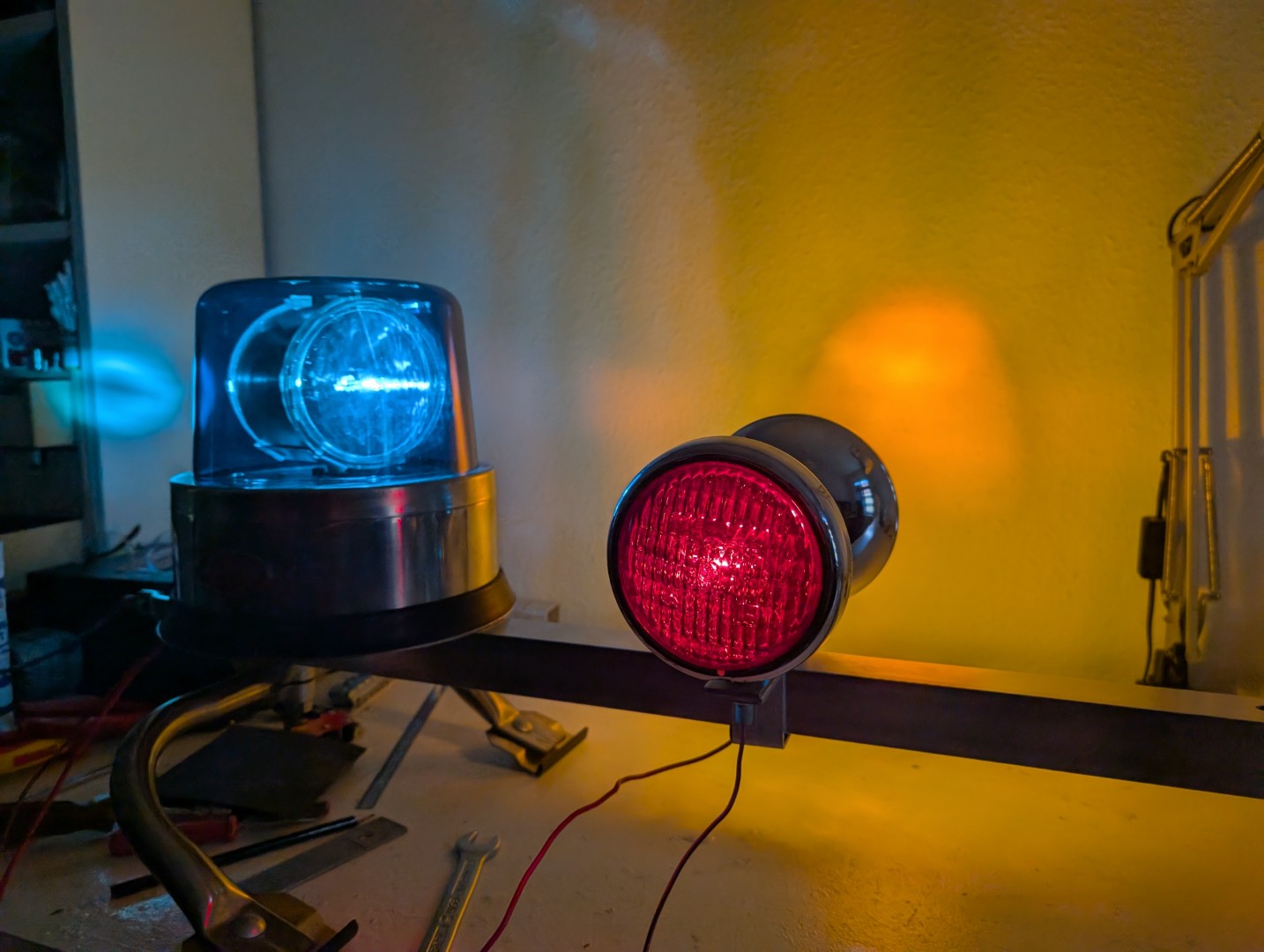 Hier die Bilder des North American Signal lightbar rack 60AAB-153C mit 2 Leuchten vom Typ 250, einer Leuchte Typ 300 und zwei roten steady burn und zwei amber rear flasher.