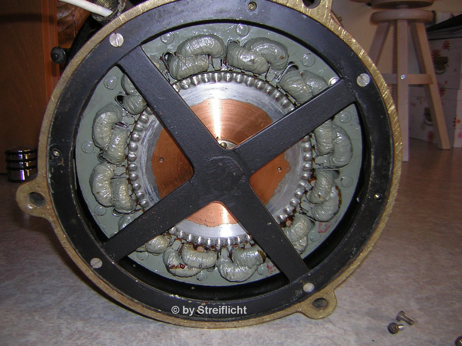 Der Rotor dreht wenn die Riemen ausgehängt sind einwandfrei, es ist in der Tat der Motor der etwas träge ist. Die Riemen sind schmiermittelfrei. Ich wollte es bisher vermeiden die kleinen Blechfähnchen aufzubiegen, die das Motorgehäuse zusammenhalten, habe die Befürchtung ,daß man das nachher sieht. WD 40, mit Spritze ins Wellenlager eingebracht, brachte nur wenig spürbaren Erfolg. Aber wahrscheinlich hast Du recht und ich muss die ungeliebten Blechfahnen aufbiegen. Bei der Gelegenheit könnte ich auch den Kollektor reinigen, bringt auch oft etwas.