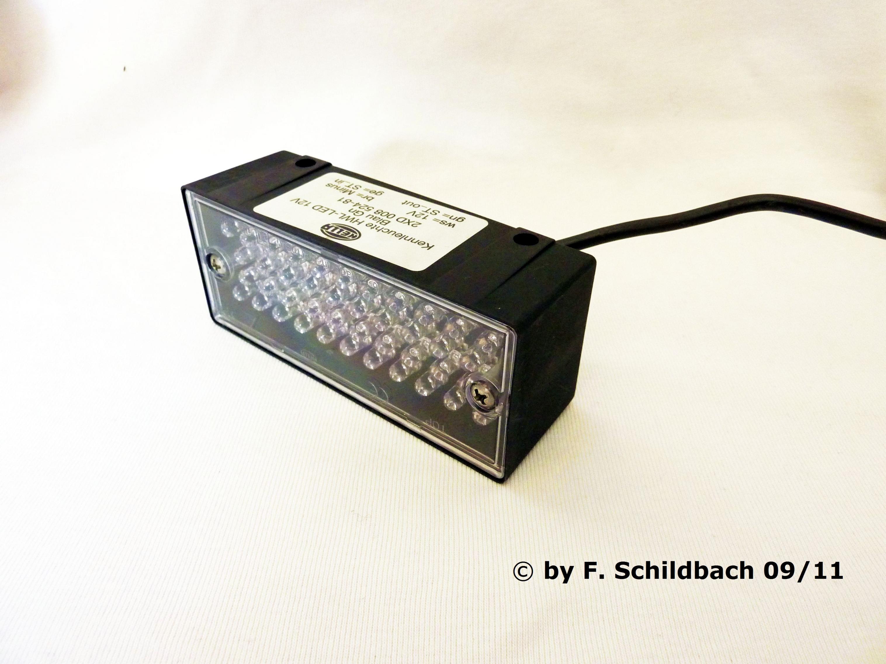 Die Hella K-LED FO ist sicher nicht die beste RKL die Hella fabriziert hat. Die Lichtleistung ist nicht mit den LED Leuchten von Hänsch vergleichbar. Optisch ist sie aber eine wirklich gelungene Leuchte. Gefertigt wurde sie im Mai 2011. Gehalten wird die K-LED FO über 3 kleine Magnete an der Leuchtenunterseite.