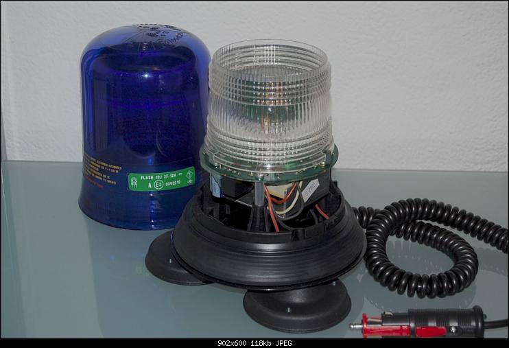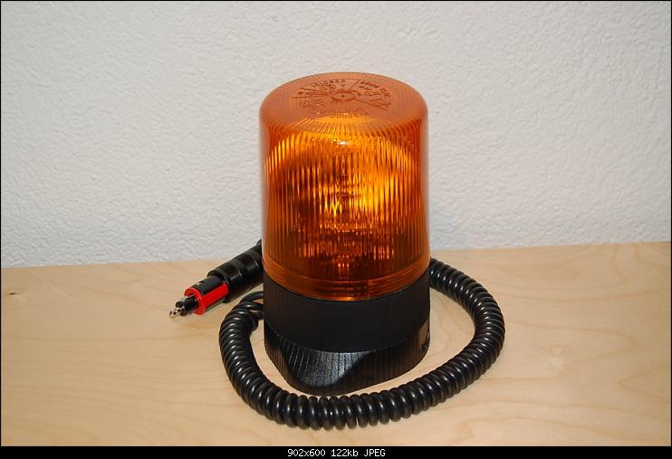 Die aerodynamische Lichthaube ist mit 4 Imbusschrauben mit dem Sockel der Leuchte verschraubt und da sich im inneren der Kennleuchte auch praktischerweise eine Ersatzglühleuchte befindet, ist im Fuß noch zusätzlich ein Imbusschlüssel verstaut. So kann man auch ohne größere Umstände innerhalb wenigen Minuten ein defektes Leuchtmittel tauschen.
