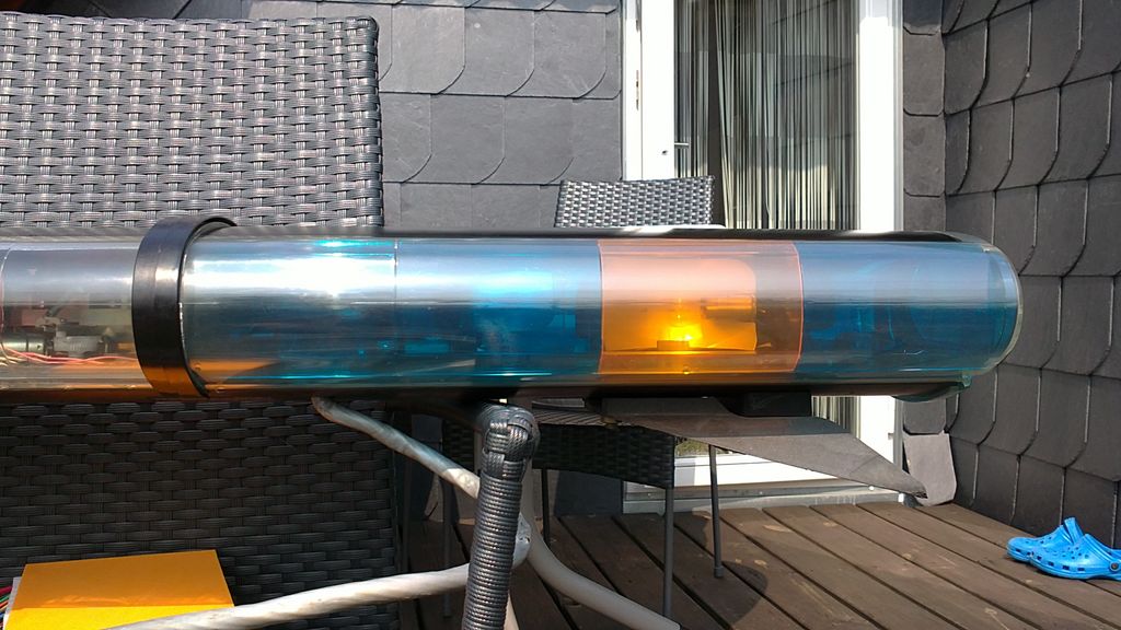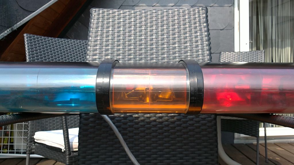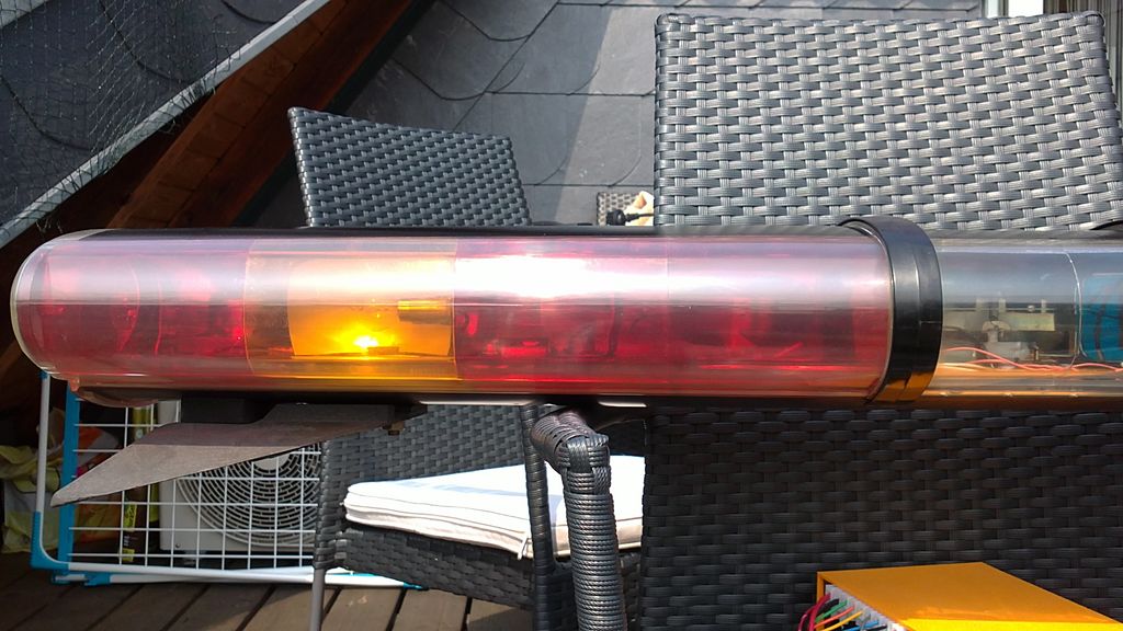 Model: JSL Series: A 12 Volt Ausstattung: - 1 Traffic Clearing Light - 2 fast rotator - 2 standard rotator - 2 alley lights - 2 rear flasher - 2 front flasher - 2 Takedown/ staedy burn Bei der Ausstattung bleibt nicht viel Platz im Balken. Aufgrund der leicht zu wechselnden Farbfilter kann man sehr schnell ein völlig anderes Farbspiel zusammenstellen. Die Hauben werde ich bei Gelegenheit durch neue ersetzen. Diese sind aufgearbeitet, aber meinen Ansprüchen gefallen sie nicht so. Betrieben wird er mit einem selbstgebauten Controller. Die Teile bekommt man für ca. 30- 40 Euro bei Conrad o.ä. |