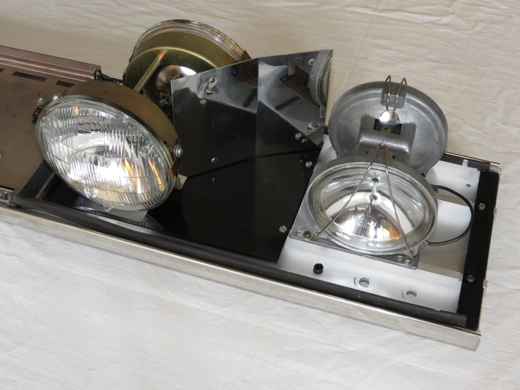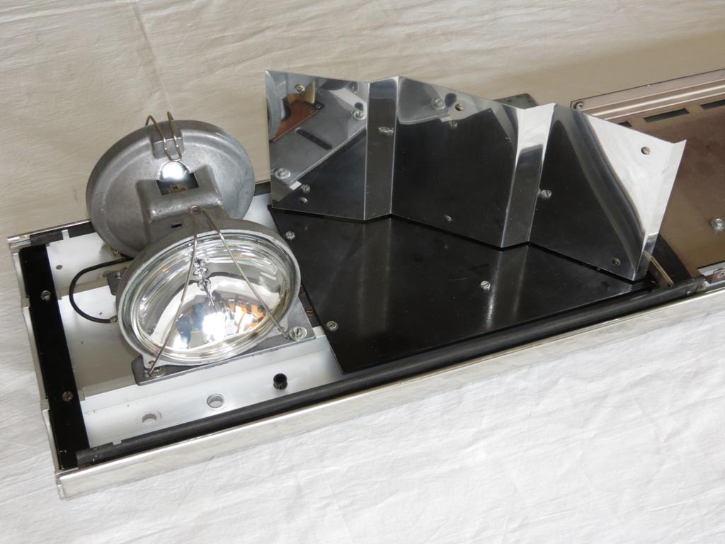 Die Jahre sind an dem Balken natürlich nicht spurlos vorrübergegangen, so hat z.B. die Lautsprecherabdeckung einige kleinere Dellen (und auch Kratzer) abbekommen und der originale Serie1 Motor wurde (vermutlich aufgrund eines Defektes) mal durch einen der Serie 3 ersetzt. Beide Hauben haben Stellenweise feine (Alterungs-)Risse. Die "CTS"-Haube hat zudem einen kleinen Sprung in der Ecke beim Ausschnitt für die Blinkleuchte. Leider wurde die gelbe-Filterscheibe im unteren Beriech mit der Haube verklebt und zwar so, das die Verbinndung nicht zerstörungsfrei zu trennen ist. bei der Ankunft Aber alles in allem hat sich der CTS für seine 35-41 Jahre doch noch recht gut gehalten. Da der verbaute Motor unschöne Geräusche von sich gab habe ich ihn durch einen der ersten Serie ersetzt. Ansonsten habe ich nur die fehlenden Kleinteile (2-fach Klemmblock, Flasher-Halter) ergänzt, die Verkabelung instandgesetzt und alles gereinigt. Aufbau/Technik: Die Basis bildet ein stranggepresstes, eloxiertes Alu-Profil (Frame), auf dem die weiteren Komponenten montiert werden. Die beiden Doppeldreher, die Endkappenhalter sowie die LSP-Montageplatte sind direkt montiert. Die Motor-/Getriebeeinheit, die Spiegel und die Lampenhalter für Blink- und Dauerlicht werden mittels einer Grundplatte auf dem Frame befestigt. Die Hauben werden außen von den (mit den Typenschildern versehenen) Endkappen und innen von der LSP-Abdeckung gehalten. Die beiden Doppeldreher, die sich gegenläufig drehen, werden über Antriebsketten von einem gemeinsamen Motor angetrieben und sind somit miteinander syncronisiert. Die Ketten werden über ein Schneckengetriebe angetrieben und können mittels Langlöcher in den Grundplatten der Doppeldreher gespannt werden. Da sich die Lampenhalter der Doppeldreher (mit je zwei PAR36 Leuchtmitteln) mit drehen sind zur Spannungsversorgung der Leuchtmittel (pro Lampenhalter) ein Schleifring und zwei Kohebürsten notwendig. Hook-on mounting Kit 12H Montagesatz zur Befestigung ohne Dachrinne. noch nicht überarbeitet |
