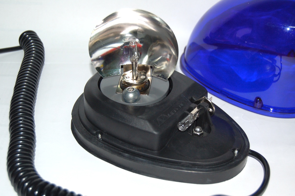 12 Volt Betriebsspannung ca. 150 Umdrehungen/min Lichthaube DIN Blau Zulassung ECE-R65 (E2) Die Halogentropfenleuchte MGD von Mercura war bis zur Einführung der GYRO-LED Leuchten fester Bestandteil des Mercura Programms für Einsatzfahrzeuge und wurde neben der Sirena (Valeo) GDO auf vielen zivilen Polizeifahrzeugen in Frankreich genutzt. In der Zwischenzeit wird die Leuchte aber nicht mehr produziert. Die Leuchte ähnelt von Form und Aufbau stark der GDO und nur die die Lichthaubenform hat weist deutliche Unterschiede auf. Im Inneren kommt ein Drehspiegel mit H1 Leuchtmittel und Schneckenantrieb zum Einsatz. Genau wie bei der GDO ist auch ein Ersatzleuchtmittel in der Leuchte verstaut. Der Boden ist vollkommen mit Gummi überzogen und darunter sorgen 6 kleine Neodym Magnete für Haftung bis 250 km/h. |