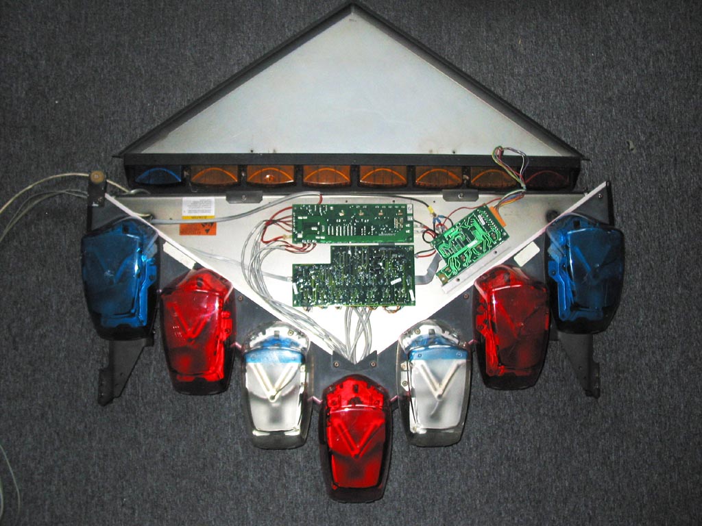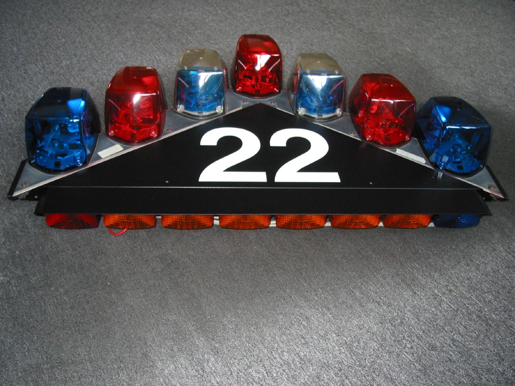 Model V7P44SS -SM -SDS, Serie B, 12 Volt Diesen Balken habe ich von Julius (uniqueUSimports), der ihn direkt aus einem Depot geholt und zusammen mit einem zweiten (identischen) importiert hat, bekommen. Der "Zwilling" von dieser Anlage ist aber mittlerweile "geschlachtet" worden. Laut Julius war der VISION beim Los Angels Police Department, CA im Einsatz. Bei welcher Abteilung und ob regulär oder nur zu Test-Zwecken ist noch nicht endgültig geklärt. Von der Model-Nummer ausgehend, handelt es sich bei dieser VISION um ein "Sondermodel" für das San Diego Sheriffs Department, CA und hatte "ab Werk" eine etwas anderes Farbschema. Da die Unterschiede minimal sind, könnte man nun natürlich vermuten, das dieses Setup als Ausgangsbasis heran gezogen wurde. Es sind lediglich die Positionen der Hauben von Pod 6+7 getauscht und in Pod 3+5 sind anstelle von blauen Filter-Einsätzen orangefarbene verbaut. Maße (in etwa):