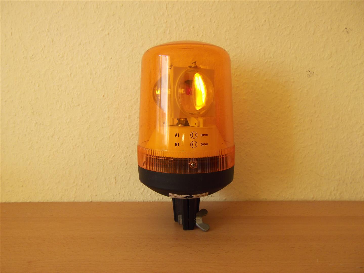 Weitaus weniger bekannt sind die Leuchten des Typs 550. Wie man sieht, handelt es sich hierbei nicht um eine Kennleuchte mit Facettenreflektor. Es drehen sich drei Linsen um die stehende H1 Halogenlampe. Der Linsenträger wird über zwei Riemen von einem Schrittmotor angetrieben. Die Leuchte ist daher im Betrieb akustisch eigentlich nicht wahrnehmbar. Ein Vergleichsbild zwischen der A.E.B. 550 und der 595: Die Haube wird mittels einer kleinen Schraube gesichert. Nachdem man diese entfernt hat, kann man die Haube nach rechts drehen und abnehmen. Es handelt sich hierbei um Glaslinsen. Plastiklinsen werden u. a. bei Pintsch Bamag und Sirena verwendet. Die Linsen etwas näher betrachtet: Kommen wir nun zum Typenschild. Wer ein Typenschild von A.E.B. erwartet hat, wird enttäuscht sein. Diese Leuchte wurde nämlich von der deutschen Firma LSFF zusammengebaut und gelabelt. A.E.B. liefert nämlich keine kompletten Kennleuchten nach Deutschland, sondern nur Einzelteile, die anschließend zu einer Leuchte zusammengefügt werden. Außerdem war die Firma LSFF maßgeblich an der Entwicklung der A.E.B. 550 sowie 555 beteildigt. Abschließend noch ein Bild während des Betriebes.