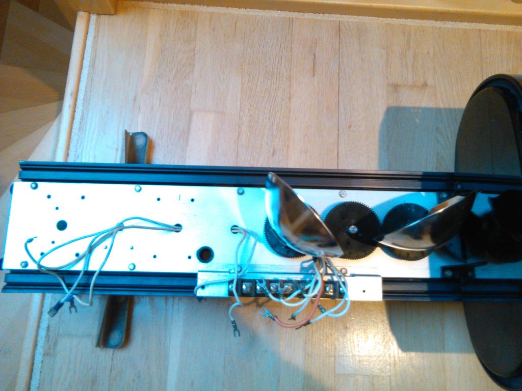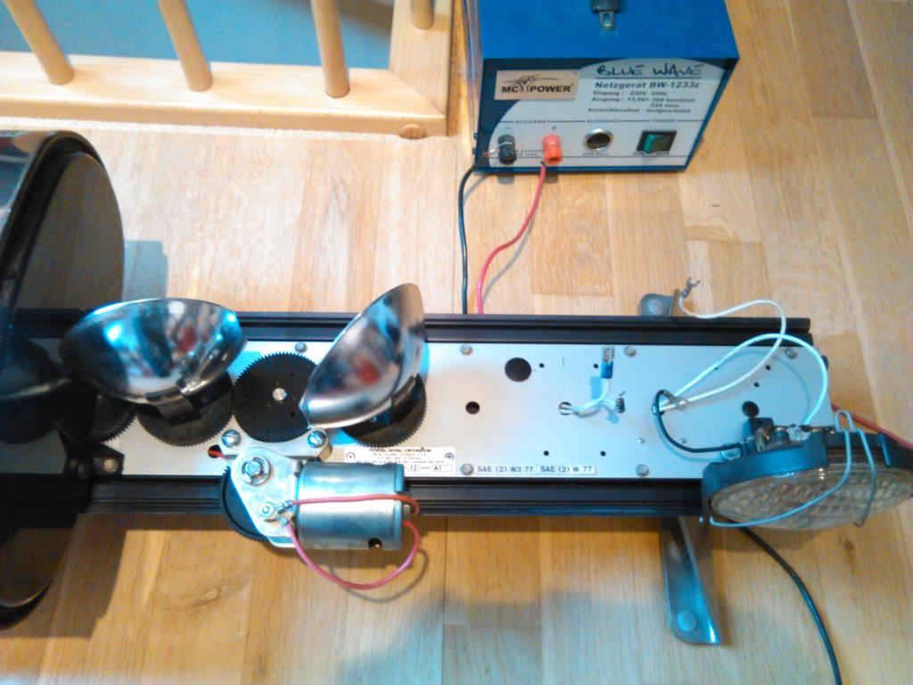 Bild 1: so sieht das ab Werk aus. Alle Pluskabel der Drehspiegel landen an einem Punkt bzw. werden dort mit Saft versorgt. Alles ist gelötet.
