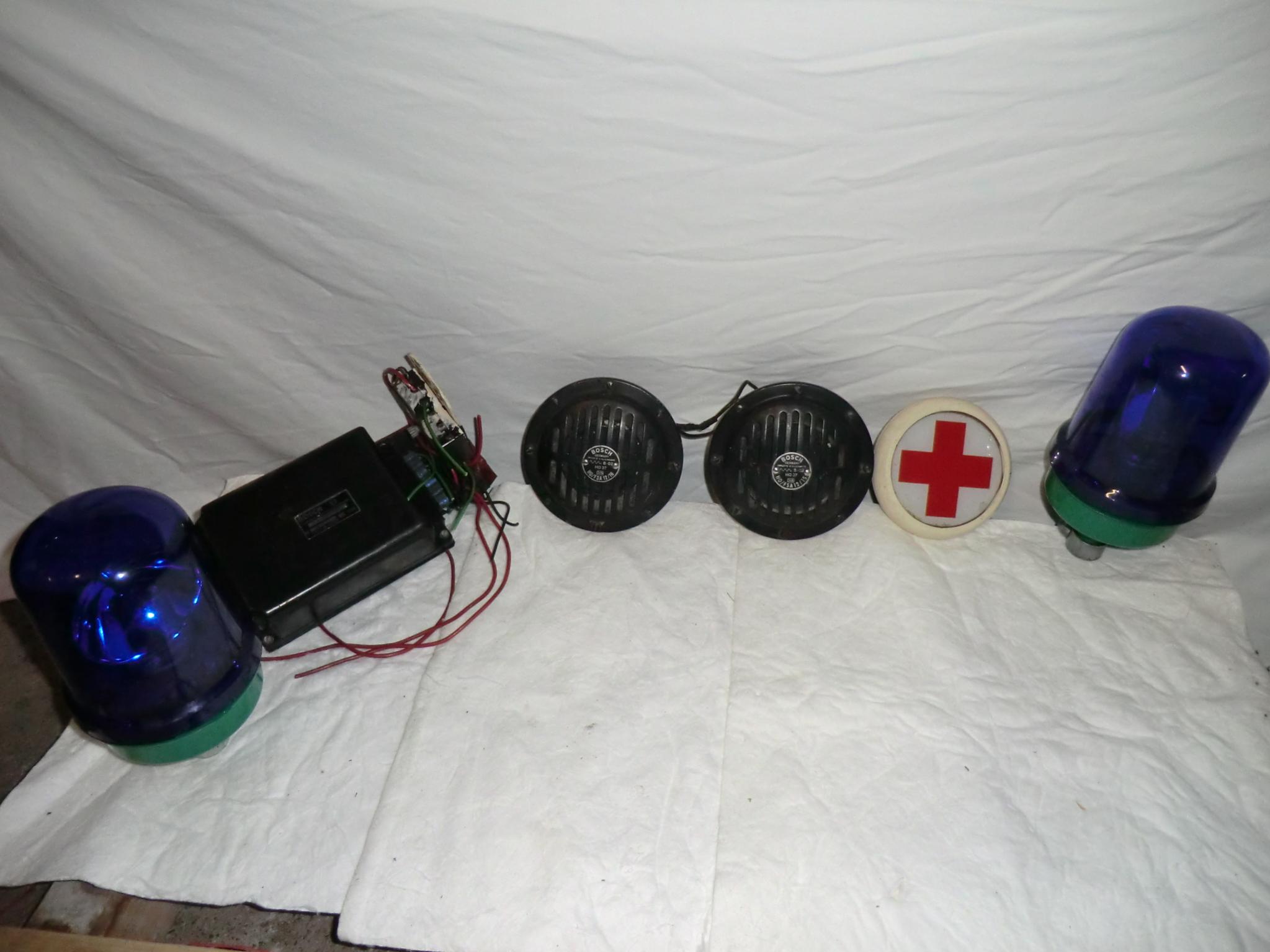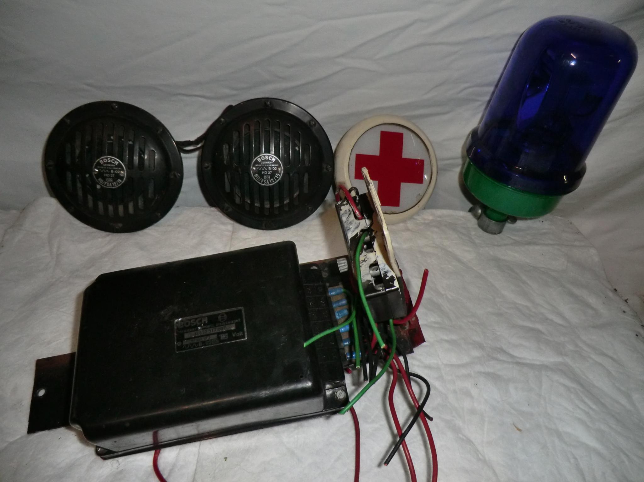 Von den Bosch Hupen sind ca. 10 Stück vorhanden, ca. 50/50 12 und 24 Volt. Anlage stammt samt dem Rot Kreuz Schild von einem VW LT MTW, war irgendwo am Bodensee stationiert. Blaulichter habe ich hier übers Forum gekauft. Wenn alles glatt geht, kann ich in den nächsten Wochen noch eine Uralt Martin Horn Anlage vorstellen,Baujahr meine ich 1957, Kompressor groß wie der Kompressor der 2097 2fach Anlage, aber mit 4 Schallbechern, die ähnlich der DDR Preßluftanlage direkt auf dem Kompressor befestigt sind. Anlage ist zur Zeit bei Wolfgang Brossard zur Reparatur. |