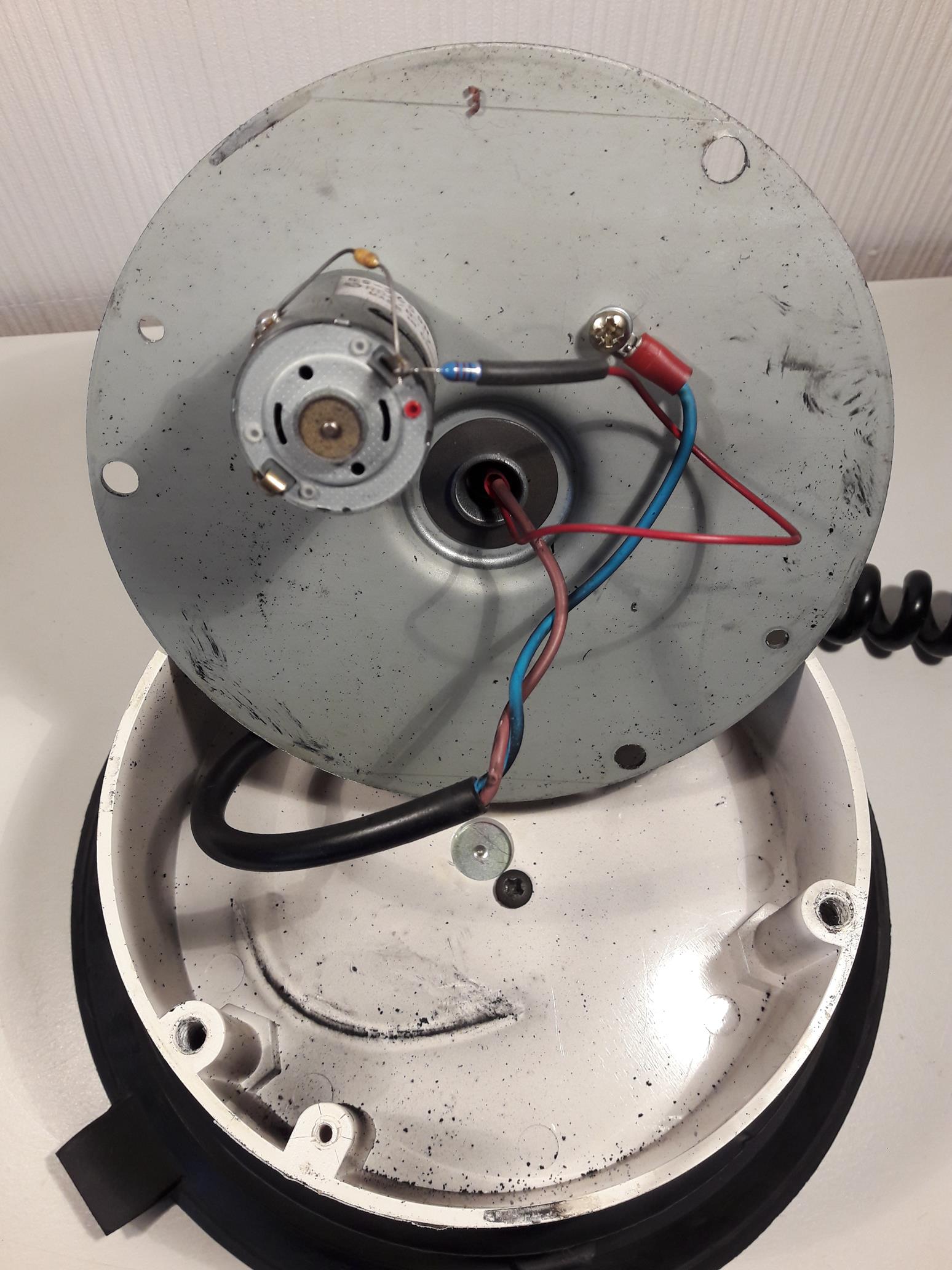 Ich habe sie vor ein paar Jahren gebraucht gekauft. Die Leuchte hat eine selten anzutreffende Haubenform und hält noch andere Überraschungen bereit, auf die ich im Rahmen dieser Vorstellung noch eingehen werde. Die TrafiBEACON ist knapp 18 cm hoch, hat einen Durchmesser von knapp 16,5 cm (Außendurchmesser der Lichthaube). Die Stromversorung erfolgt über ein ausreichend langes Spiralkabel mit Universalstecker (entspricht nicht dem originalen Auslieferungszustand). Befestigt wird die TrafiBEACON mit einem Magnetsauger. Die Lichthaube deckt nahezu die komplette Höhe der Leuchte ab und ist außen glatt. Oben auf der Lichthaube sind die Angaben zum Hersteller lesbar. Der obere Teil ist von innen horizontal geriffelt. Unter dem unteren Teil der Haube ist das Typenschild gut lesbar auf dem Gehäuse angebracht. Drei Schrauben mit Dichtring verbinden die Lichthaube mit dem Gehäuse. Die drei Schrauben sind sehr großzügig dimensioniert. Nach dem Entfernen der Lichthaube ist der Aufbau der Leuchte deutlich erkennbar: Doppelte Dichtlippe aus schwarzem Kunststoff (Teil des Magnetsaugers), weißes Kunststoffgehäuse (mit Typenschild), Grundplatte (1 mm dickes Metall), weiße Kunstsoffbasis der Reflektors (dreht mit und verdeckt den Antrieb), Reflektor (aus Metall) mit fest stehendem H1-Leuchtmittel. Die Befestigung der Drehspiegelbasis / das Lager hat merkliches Spiel (unklar ob Abnutzung oder Montagefehler). Die schwarzen Krümel sind augenscheinlich Abrieb/Verschleiß des Antriebsystems (vermutlich ein Reibrad), der sich im Leuchteninneren sammelt. Leider lässt sich die Leuchte nicht soweit zerlegen, um den Antrieb erkennen und fotografieren zu können. Nach dem Lösen von zwei Schrauben, lässt sich die Grundplatte vom Gehäuse trennen und der Blick auf die Unterseite ist frei. Auch hier sind schwarze Krümel vorhanden. Auf der Motoraufnahme befindet sich ein Aufkleber mit Angaben zum Motor. Interessant ist, neben dem Mix an verbauten Materialien, die Drehrichtung des Reflektors: (von oben gesehen) gegen den Uhrzeigersinn. Im Betrieb ist die TrafiBEACON relativ leise, jedoch macht sich das Lagerspiel deutlich bemerkbar. Video: |