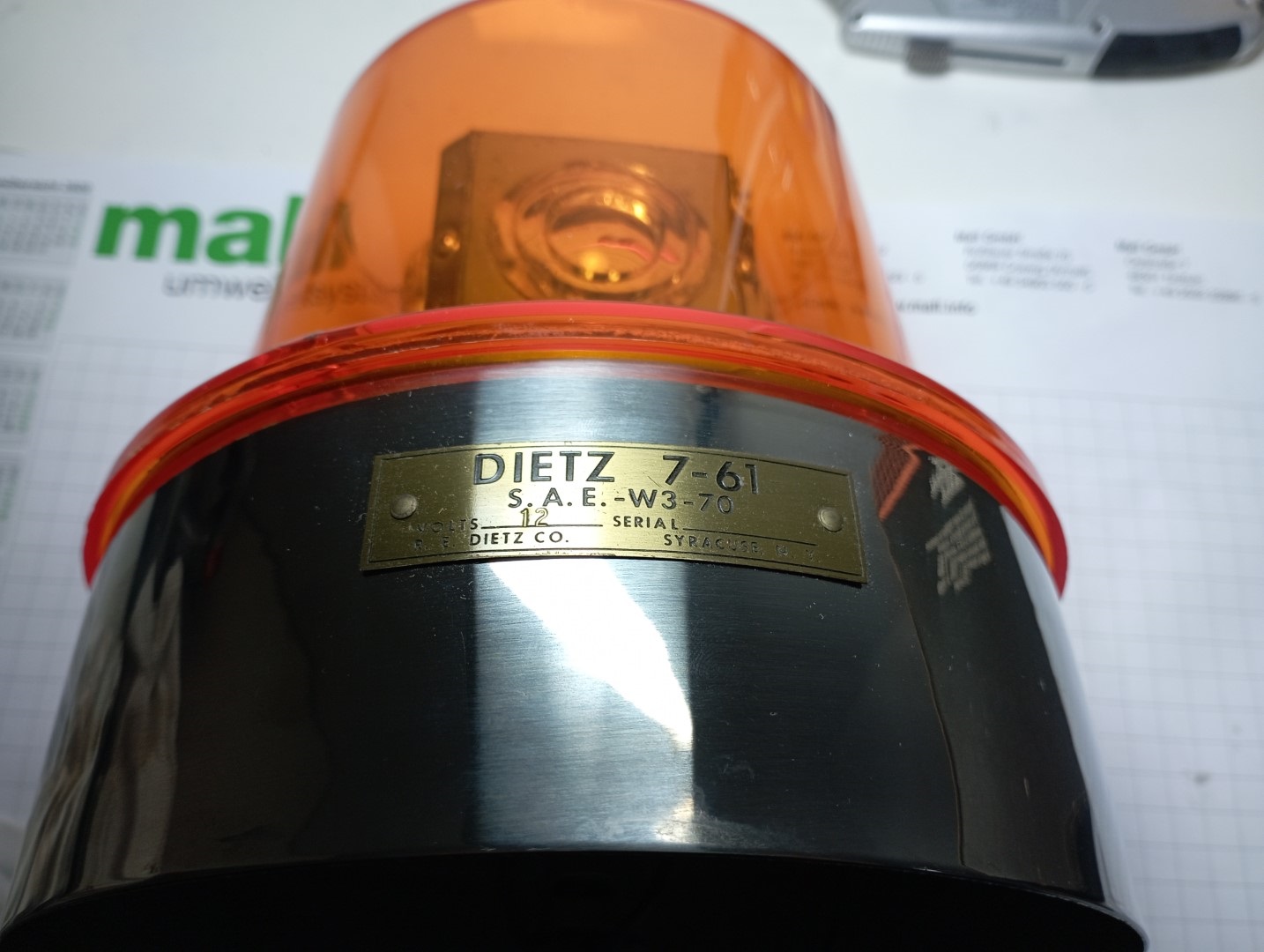 Model: 7-61 Volt: 12V Leuchtmittel: #1195 bulb Produktionsjahr: 1990 (vermutlich) Hier möchte ich nun den zweiten Neuzugang vorstellen. Eine Dietz 7-61 Leuchte, bekannt auch als "Junior" (aufgrund der Ähnlichkeit im Aufbau zur FedSig Beacon Ray Mod.15). Funktion ist recht simpel: feststehendes Leuchtmittel und darum drehen sich 4 Fresnel-Linsen. Dietz hat die Leuchte als Modell 261 1962 auf den Markt gebracht. 1970 änderte Dietz sämtliche Bezeichnungen seiner Leuchten von 2xx auf 7-xx. Somit wurde dieses Modell nun unter 7-61 vertrieben. Dietz wurde 1990 von Signal Stat gekauft. Signal Stat brachte diese Leuchte unter der Bezeichnung 378 (Haube war #376) ohne große Veränderungen auf den Markt. Btw: NAPA Bezeichnung ist 486. Daher gehe ich davon aus, dass meine Leuchte mit Dietz Bezeichnung aber bereits mit Signal Stat Karton (da steht 7-61 drauf) Ende der 80er, maximal 1990 gebaut wurde. Mittlerweile aber auch schon 34 Jahre alt... Nun aber zu dem Objekt: Lieferzustand inkl. Karton, Anleitungen, Montageskizze, Dichtungen, Befestigungsmaterial usw. Die Haube hat leider oben einen Riss, Ersatz ist bereits unterwegs. etwas Flugrost hat das gute Stück, aber nichts wildes hier sieht man schön den Aufbau Die Anleitungen sind sicherlich noch aus den 60ern oder 70ern. Komplette Tüte mit Schrauben, Dichtungen (fehlen bei fast allen Dietz Leuchten), Kabel und Befestigungsmaterial Wenn die Ersatzhaube da ist, mache ich Fotos in Aktion. |