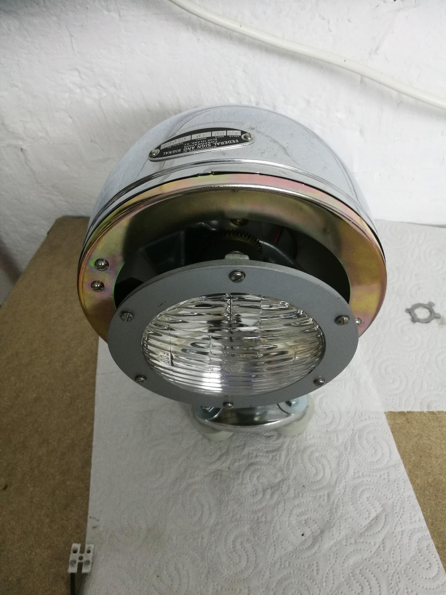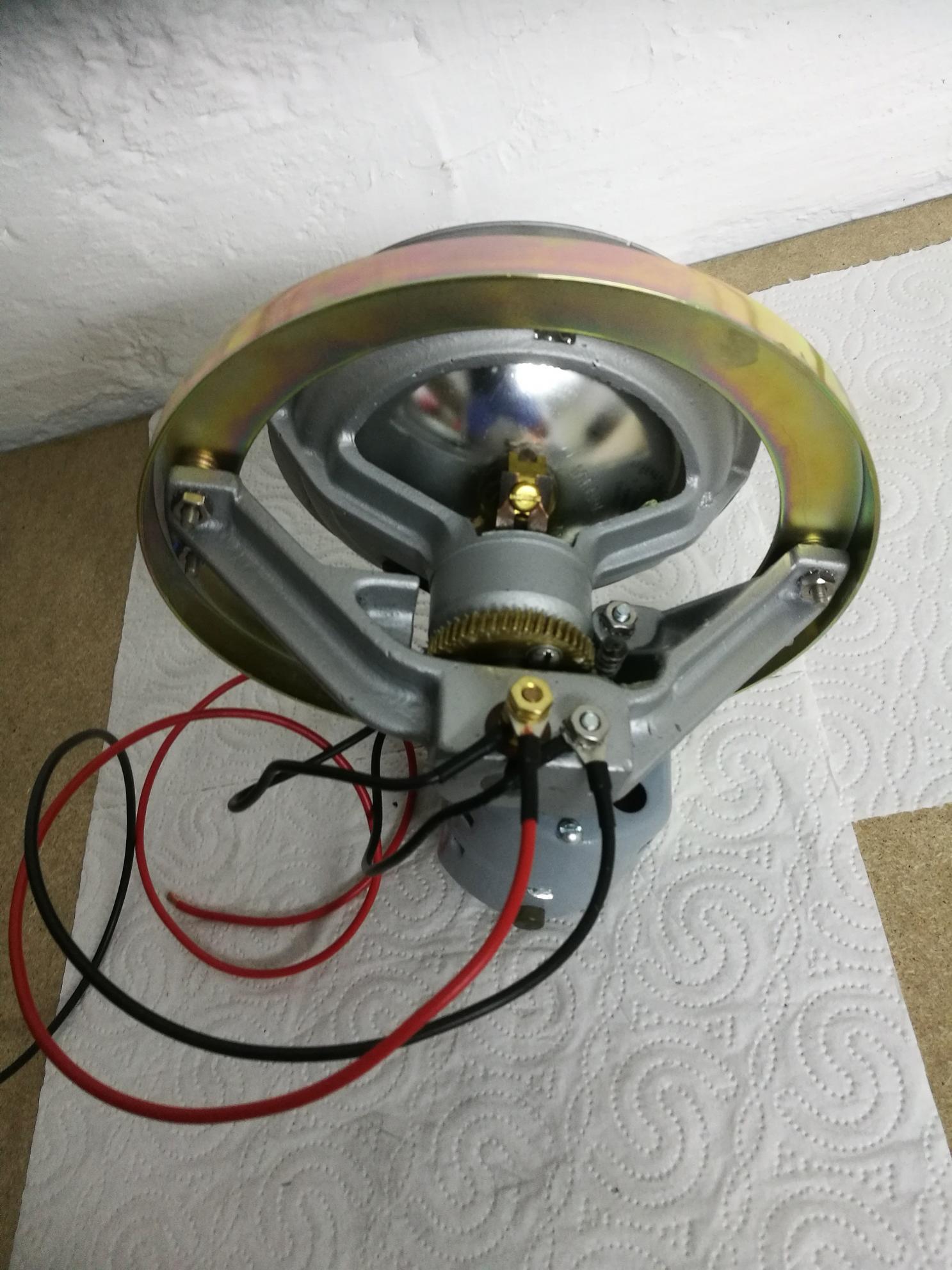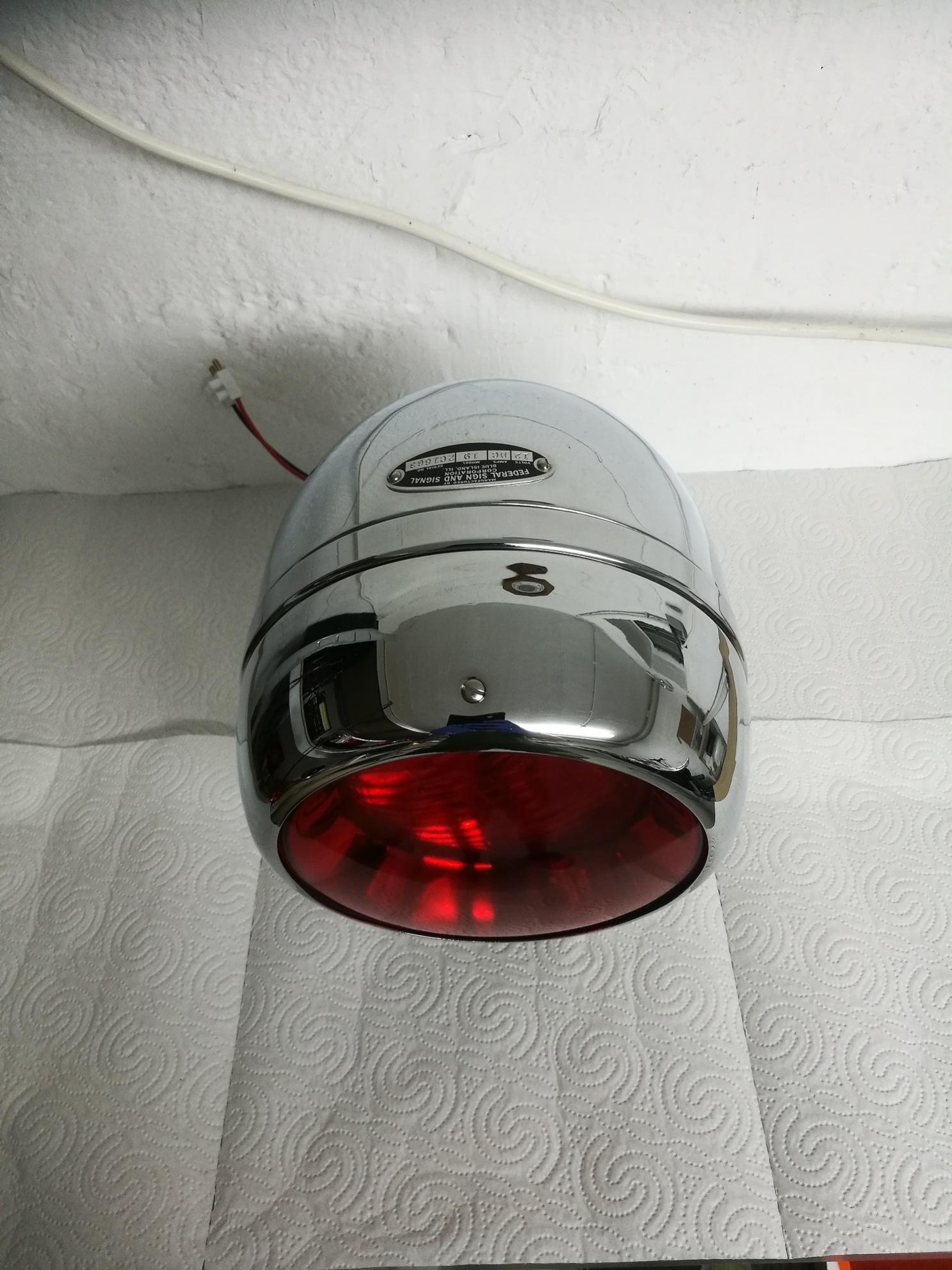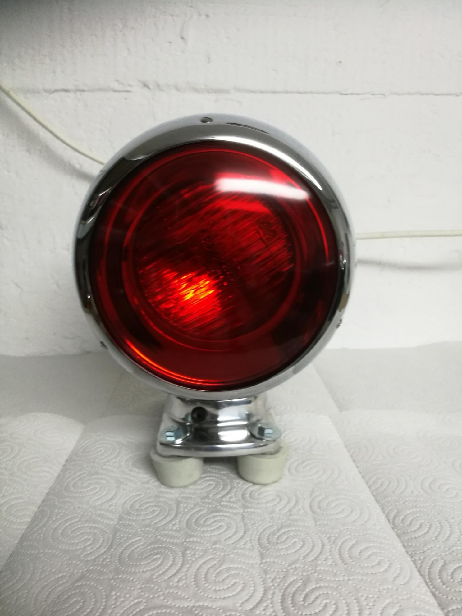 Das Besondere ist, dass diese Leuchte nach vorne gerichtet ist, sich aber trotzdem im Kreis dreht. Somit wird durch einen Spiegel ein Rotationseffekt erzeugt.