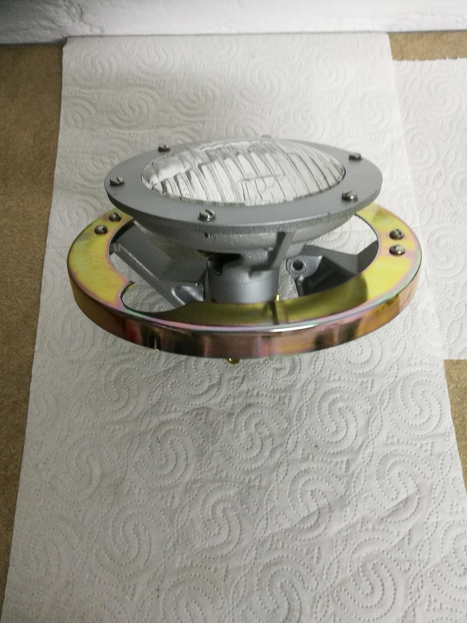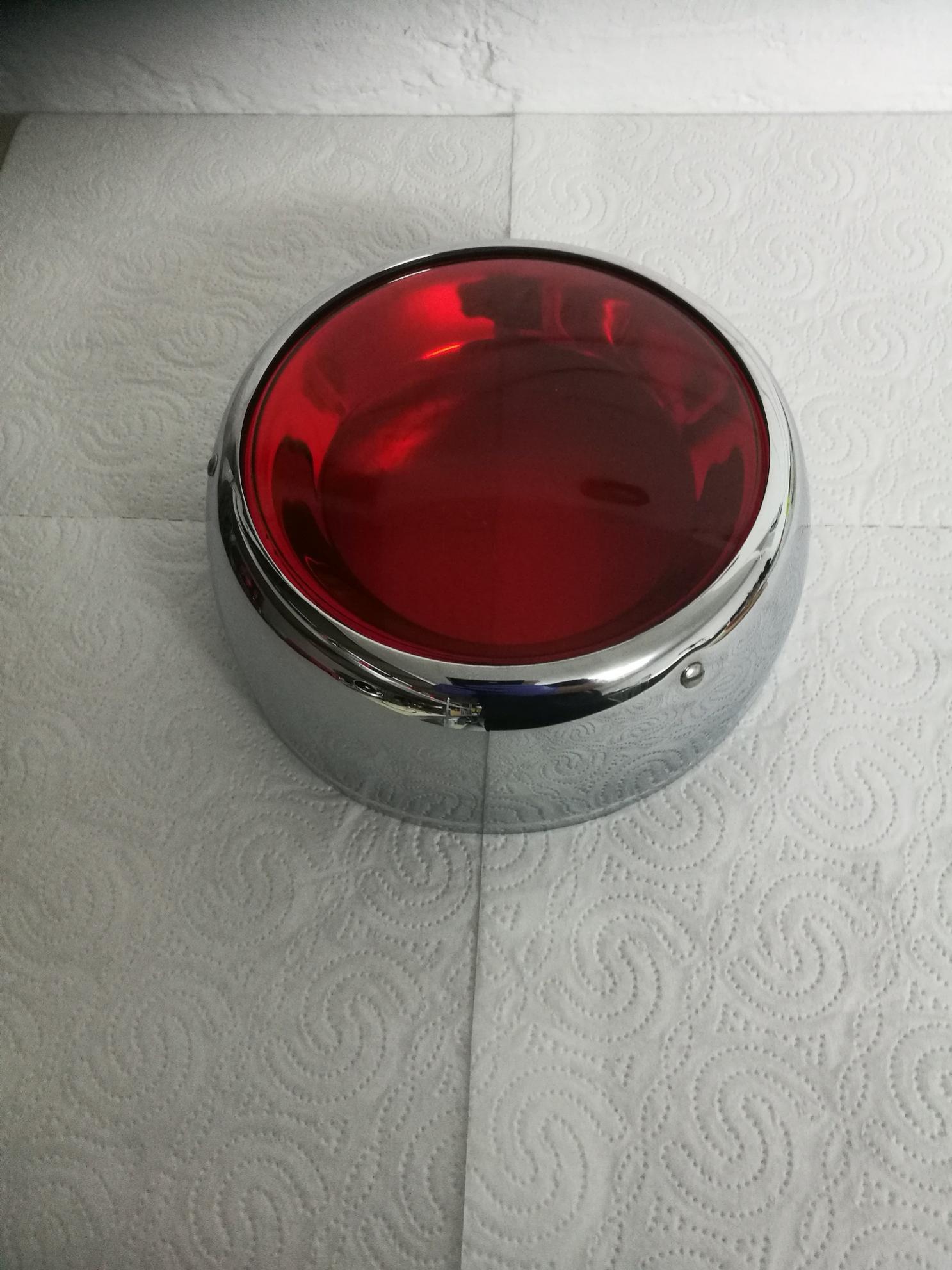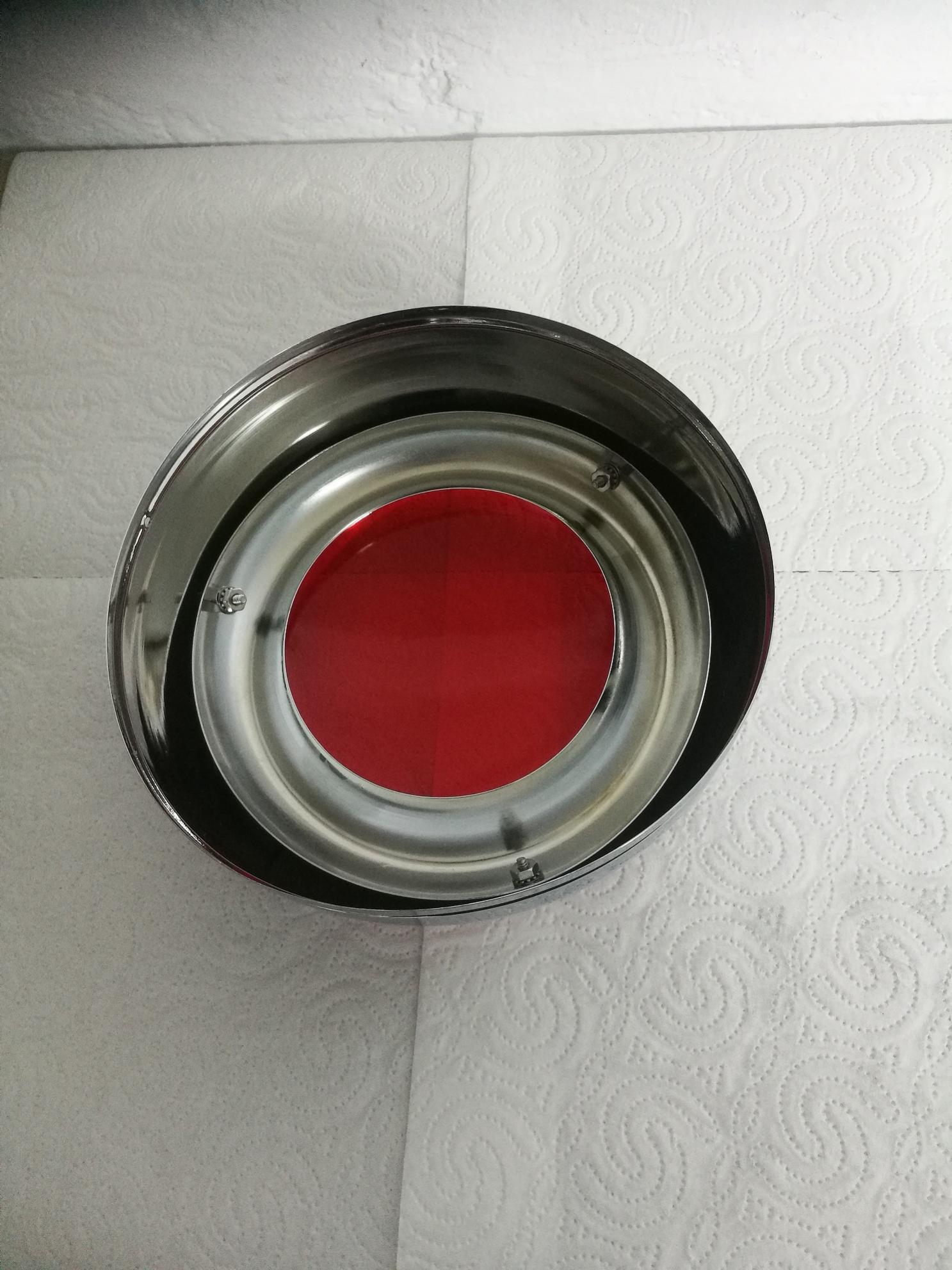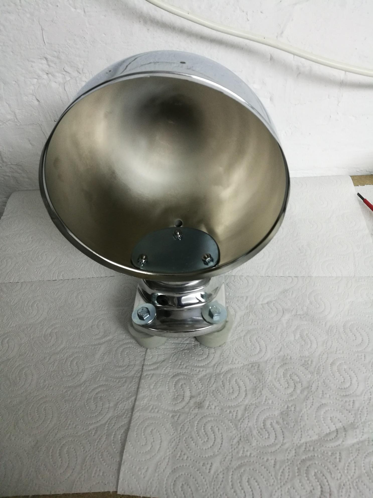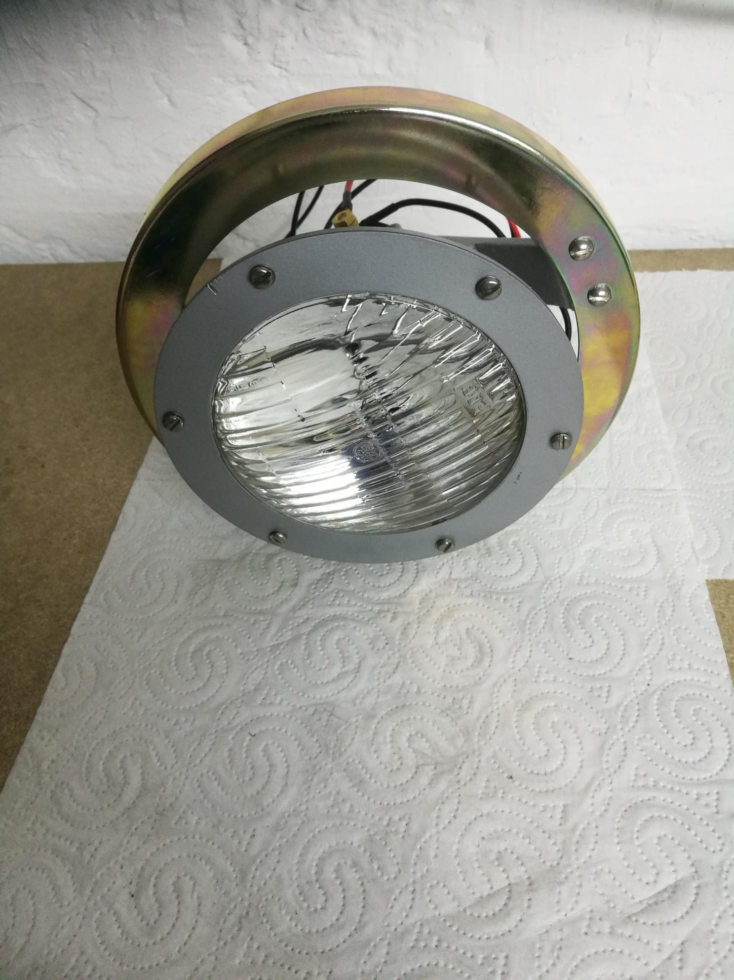 Das Besondere ist, dass diese Leuchte nach vorne gerichtet ist, sich aber trotzdem im Kreis dreht. Somit wird durch einen Spiegel ein Rotationseffekt erzeugt.