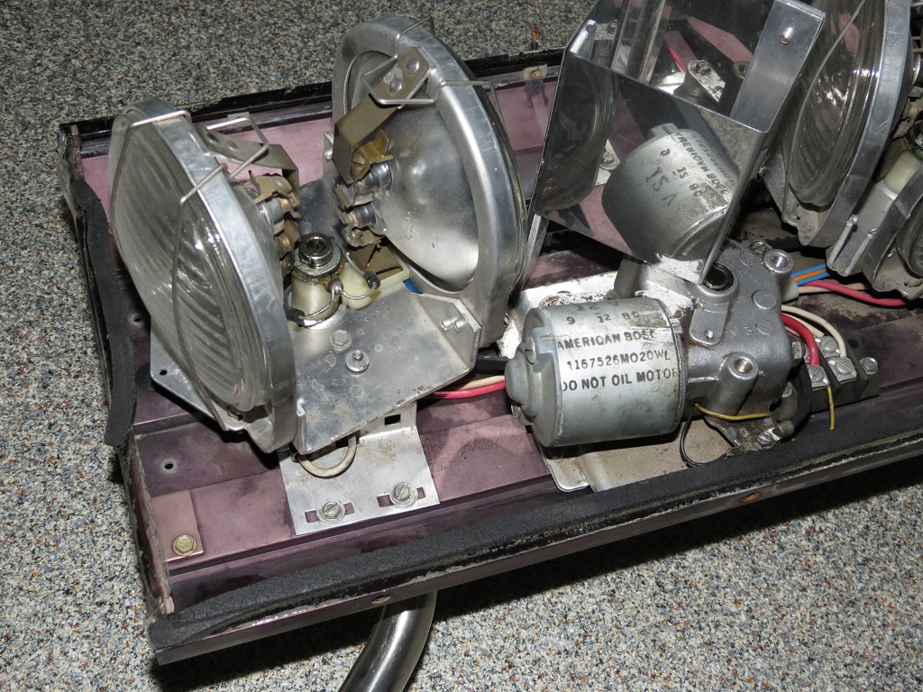 Zustand bei Erhalt: Der Balken war komplett und befand sich, als ich ihn bekam, in einem relativ guten Zustand. Anscheinend wurde aber mal eine Haube gegen eine rote Standard-Haube (ohne den großen cutout) ersetzt. Was bisher geschah: Die Standard-Haube ohne cutout konnte ich glücklicherweise schon durch eine mit cutout (an der richtigen Stelle) ersetzen. Ansonsten benötigt das Alu-Grundprofil eine klein farbliche Auffrischung und ein großer Service ist auch mal fällig. Fortsetzung folgt ... Aufbau/Technik: Die Basis bildet ein Alu-Profil welches auf der Unterseite mit zwei (der Länge nach verlaufenden) Nuten zur variablen Befestigung der Montagefüße versehen ist. Die einzelnen Komponenten werden direkt auf dem Alu-Profil befestigt. Die Hauben werden, genauso wie die LSP-Abdeckung, von außen mittels Schrauben am Alu-Profil befestigt. Die beiden linken und rechten Lampenhalter werden jeweils über einen Antriebsriemen von einem Motor angetrieben und sind somit miteinander synchronisiert. Zwischen der rechte und der linken Seite besteht keine Verbinndung. Bei den äußeren Lampenhaltern sind die Leuchten im Abstand von 180° und bei den inneren von 120° (240) montiert, wodurch sich unterschiedliche Blinkmuster ergeben. Außerdem erfolgt die Spannungsversorgung zu den sich drehenden Leuchtmitteln ausschließlich über die (Dreh-)Achse (außen - / innen +) und nicht mittels einer Kohlebürste. Je nach verbauter Zusatz-Option können je Doppeldreher zusätzlich bis zu 2 Kohlebürsten pro Lampenhalter verbaut sein. |