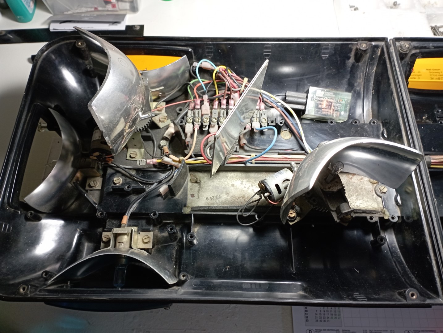 Typ: Streethawk Model: SHL4800 Series: B Volt: 12V Produktionsjahr: 1992/93 gemäß der Motoren Hab gestern einen Ausflug in die Nähe von Hanau gemacht und mein aktuelles Projekt abgeholt. Gut das ich den Preis noch etwas verhandelt habe, "Projekt" trifft es ganz gut. Aber aufgrund der beiden Dynaray in der Mitte war die Streethawk ganz interessant. Es handelt sich um eine Streethawk SHL4800 mit der Besonderheit von zwei Dynaray Bestellcode: SCICLFK Leider ist der Center Bereich ansonsten komplett leer. Und das Gehäuse ist auch in relevanten Bereichen gebrochen und nicht zu reparieren. |