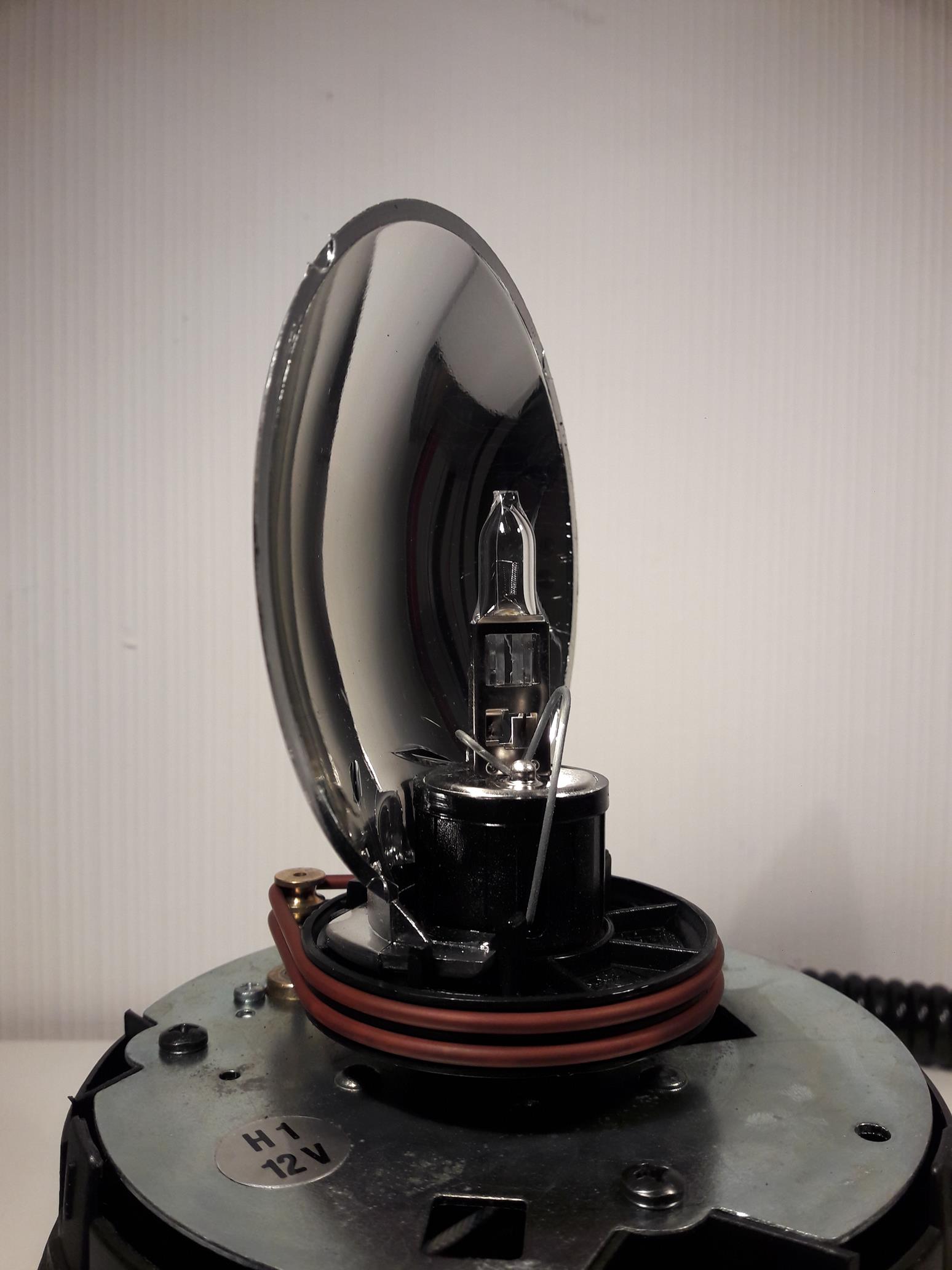 Im Inneren der Leuchte dreht sich ein Kunststoffdrehspiegel um eine stehende H1-Glühlampe.