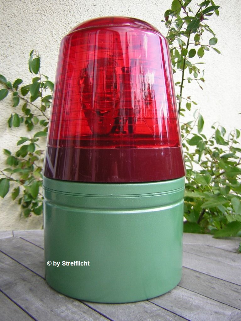 Der Gedanke lag nahe, dabei an Pintsch Bamag zu denken. Nun kam ich ganz zufällig zu so einer Pintsch Bamag. Das Modell nennt sich "RS1" Wie beim Auer EBL hängt auch hier die 12V/45W-Birne von Oben herunter. Der seltsame "Knubbel" auf der Haube ist kein Gussrest aus der Spritzform, sondern quasi ein Regenschutzdach - denn darunter ist ein Loch zur Wärmeabfuhr. Der Motor stammt vom Autozulieferer SWF - eine Valeotochter Der Braune Ring unter der blauen Haube ist eine Gummidichtung. Die Leuchte ist komplett aus Aluminium. Deshalb kein Rost. Allerdings zersetzt sich der Lack. Es handelt sich um den typischen grünen Hammerschlaglack, den auch die Pintsch Bamag RSW 24G auf den grünen Notrufmeldern besitzen. Weiss jemand zufällig die RAL-Nummer für den Lack ? Zum Grössenvergleich habe ich auf einem Bild eine Eisemann RKL90 dazugestellt Die RS1 dürfte gut 50 Jahre alt sein |