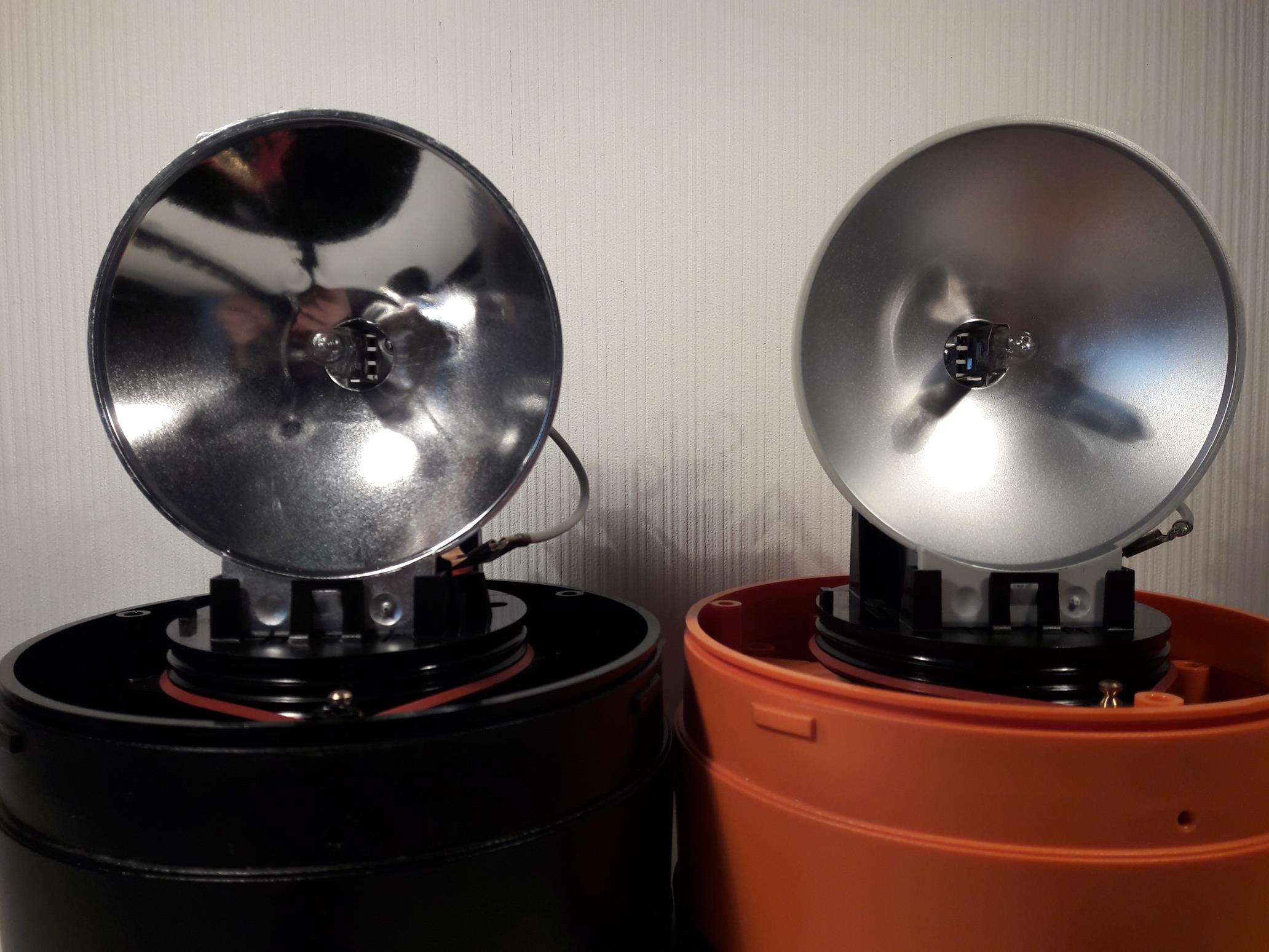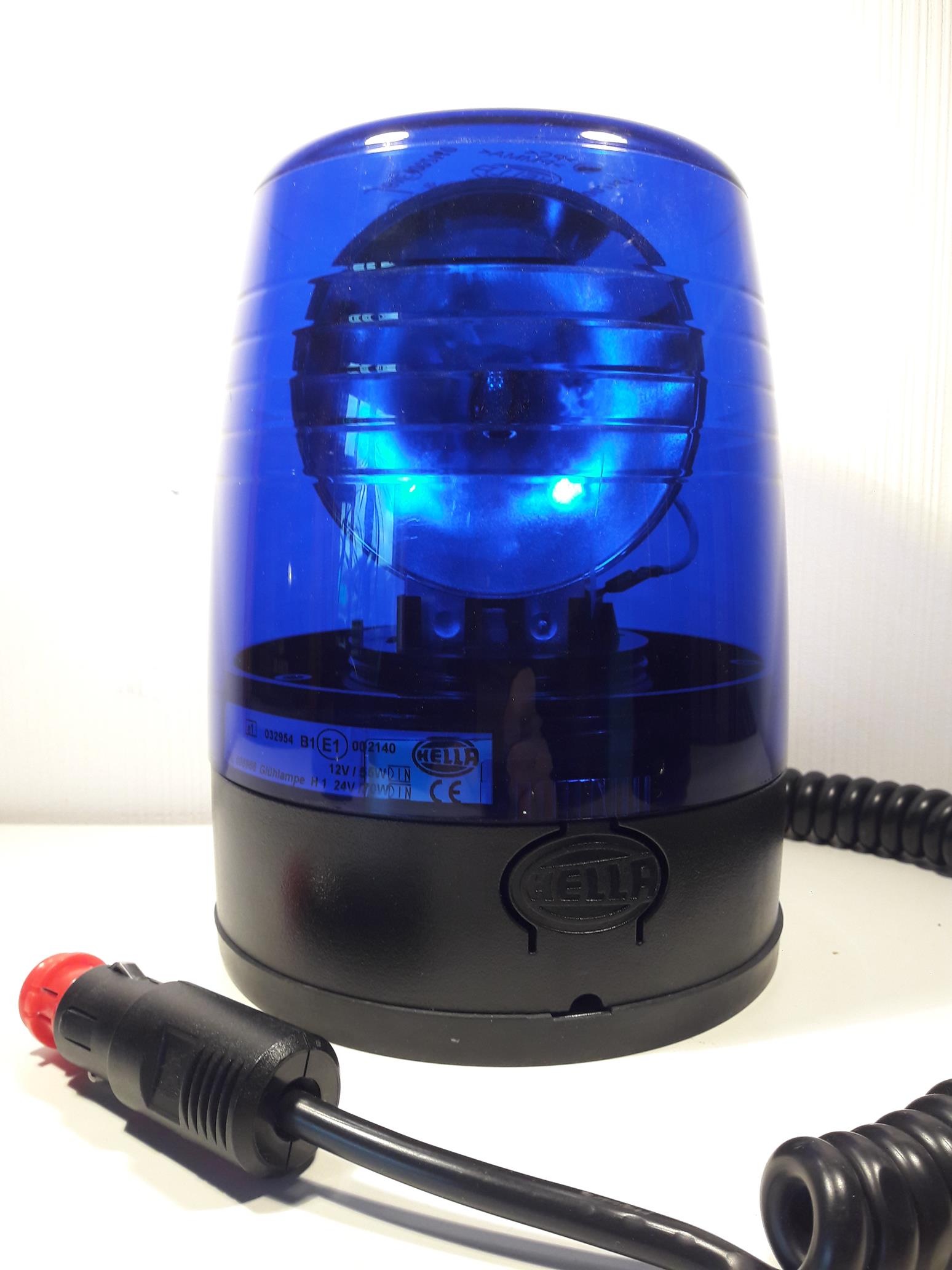 Das schwarze Gehäuse passt sehr gut zu der Leuchte. Innen fällt der verspiegelte Reflektor auf, während der der orangen Junior Plus matt ist. Sonst ist das Innenleben identisch. Das Typenschild zeigt an, dass diese Junior Plus mit einem 24 Volt Leuchtmittel ausgeliefert wurde. Meiner Meinung nach hat die blaue KL Junior Plus auf einem Einsatzfahrzeug nichts zu suchen, da mit wachsender Entfernung die Leuchtkraft und Warnwirkung stark nachlassen. Hier noch zwei Videos: |