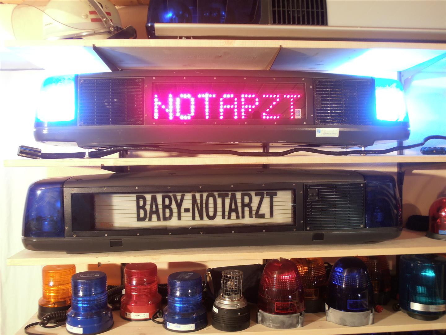Es handelt sich zum einen um einen Sinfo der Firma Autoradio Becker in der Notarzt-Ausführung. Die Anlage ist ausgerüstet mit zwei Drehspiegelleuchten, zwei Lautsprechern in Fahrtrichtung sowie einer hinterleuchteten Mittelbeschriftung. Die Hinterleuchtung ist durch Sofitten realisiert. Der Schriftzug zeigt vorder- wie rückseitig die Schrift BABY-NOTARZT in schwarzer Normalschrift auf milchweissen Blenden. Sowohl die Sicherheitsglasscheiben wie auch die Lautsprechergitter der Anlage sind beheizbar, dazu jedoch später mehr. Der Balken kam in hervorragendem Zustand zu mir. Die zweite Anlage ist der jüngere Bruder, die von UKE Kranefeld weitergeführte Reihe in Form des DBS 826, ebenfalls in der Notarzt-Ausführung. Diese Anlage besitzt beidseitig Doppelblitz-Xenon-Module, wie man sie aus zeitgerechten Hänsch-Leuchten kennt. Hier ist mittig nach vorne ein Informationsgeber aus roten LED installiert, welcher in Normalschrift dauerhaft leuchtend NOTARZT anzeigt. Nach hinten ist nur eine schwarze Kunststoffplatte ohne Beschriftung installiert. Auch hier sind Sicherheitsglasscheiben und Lautsprechergitter beheizbar. Dieser Balken kam in annehmbaren Zustand zu mir. Besonders schade ist, dass die Lichthauben sehr versprödet sind. Leider kosten die Ersatzhauben, wenn überhaupt noch verfügbar, ein kleines Vermögen. Also in etwa soviel, wie Hella für die Ersatzhauben seiner neuesten Balken verlangt. Während seitlich auf den Becker-Hauben der SINFO-Schriftzug eingeprägt war, zeigen die DBS-Hauben das UKE-Logo. Beide Anlagen benötigen zum Betrieb den Verstärkerbaustein 322 U 1000. Dieser ist nicht nur für die Tonerzeugung verantwortlich, sondern übernimmt auch Teile der Kennleuchtensteuerung und -kontrolle. Praktischerweise besitze ich jetzt auch zwei Verstärker. Die Zulassungsnummer ~~~M25003 zeigt das Alter der Anlage und ihren wichtigen Platz in der SoSi-Geschichte Deutschlands! Die diversen Anschlüsse und der abgesetzte Baustein sind etwas gewöhnungsbedürftig beim Verkabeln der Anlage. Ebenso die Tatsache, dass der Verstärkerbaustein auch für den Einsatz mit einem (ggf. drehbaren) Lautsprecher sowie zwei Einzel-Kennleuchten konzipiert wurde. Mit den Schaltplänen sowie dem originalen Kabelbaum und dem nötigen technischen Verständnis in Verbindung mit etwas Geduld gelingt es jedoch problemlos. Als Bedieneinheit nutze ich das original zur UKE-Anlage gehörige Bedienteil (unter dem UKE-Aufkleber sitzt der Becker-Schriftzug). Dieses habe ich in ein Gehäuse eingebaut, auf welchem ich den Verstärkerbaustein montiert habe. Das BT besteht aus einem AZD in Feuerwehrschaltung (dem einzigen in meiner Sammlung), diversen Kontrollleuchten sowie einem Taster zur Testauslösung des Signals und einem Schalter zur Aktivierung der Hinterleuchtung bzw. des Infogebers (mit Funktionsbeleuchtung). Ich habe das ganze ergänzt um einen Schalter zur Spannungsversorgung des Heiz-Stromkreislaufs sowie einen Schalter mit Kontrollleuchte zur Zündungssimulation. Ich habe mich aufgrund der Vergleichbarkeit der Anlagen entschlossen, beide alternativ an einem gemeinsamen Bedienteil zu betreiben. Durch die lange Anschlussleitung und den Daimler Benz-Stecker ist der Wechsel sehr einfach. Der AZD ist bei Hänsch-/Becker-Anlagen etwas modifiziert zu dem allgemein bekannten. Zum einen fehlt im Inneren der Einsatz, der beim Betrieb das Kennleuchten-Symbol erscheinen lässt. Dies ist der Tatsache geschuldet, dass die leuchtenden Kontrolllampe im AZD nicht die Kennleuchtenfunktion anzeigt oder der Auffindbeleuchtung dient. Vielmehr zeigt die Kontrollleuchte an, wenn Klangfolgebereitschaft vorliegt. Sprich: Zündung ein, LSP (falls drehbar) in Fahrtrichtung und AZD in entsprechender Stellung. Die Kontrollleuchten über dem AZD dienen zum einen der Kennleuchten-Kontrolle (zwei rote Vierecke links und rechts) sowie der Kontrolle der Ausrichtung des drehbaren LSP (grünes Dreieck: nach vorne, orangefarbener Kreis: nicht nach vorne). Im Fuß des drehbaren LSP ist dazu ein Kontakt verbaut, der geschlossen ist, sobald der LSP in Fahrtrichtung zeigt. Die beiden Leitungen werden dann zur weißen Buchse am Verstärkerbaustein geführt. Ist der Kontakt geschlossen, leuchtet das grüne Dreieck und die Klangfolge kann geschaltet werden. Beim Sinfo/DBS ist mangels drehbarem LSP an der Stelle eine Brücke gesetzt. Den Sinfo gibt es ausschließlich mit Drehspiegelleuchten. Die BOSCH-Reflektoren kennt man aus der RKLE 110 oder auch der TOP-Reihe von Wandel & Goltermann. Das Lichtbild ist als bekannt gut zu bezeichnen. UKE ersetzte die Drehspiegelleuchten dann durch seine Doppelblitzleuchten. Die Elektroniken sitzen ebenfalls unter den Hauben. Zur Balkenmitte hin wurden zusätzliche Reflektoren angebracht, um möglichst wenig Licht zu vergeuden. Insgesamt kann man von Maßarbeit sprechen, die Doppelblitzleuchtmodule in den Balken zu intergrieren. Während seitlich auf den Becker-Hauben der SINFO-Schriftzug eingeprägt war, zeigen die DBS-Hauben dort einen Aufkleber mit dem UKE-Logo, der SINFO-Schriftzug wurde bereits aus den Spritzguss-Formen entfernt. Wie beschrieben, sind bei meinen beiden Anlagen sowohl die Sicherheitsglasscheiben beheizt (wie man es von der Heckscheibe des PKW kennt), als auch die Lautsprecher-Gitter. Im Inneren der Anlage sitzt ein Temperaturfühler, welcher die Heizungen bei entsprechend niedriger Temperatur einschaltet. Um aber nicht bei stehendem Fahrzeug uns somit niedriger Lichtmaschinen-Leistung die Starter-Batterie leer zu ziehen, ist die Spannungsversorgung des Heizkreises im Originalzustand über eine Drehzahlüberwachung geschaltet, welche erst ab einer gewissen Drehzahl die Spannung für den Heizkreis freigibt. Diese Funktion übernimmt bei mir der Hella-Einbauschalter. Im Winter möchte ich das ganze mal in’s Freie verlegen, um die Stromaufnahme mit Heizung festzustellen. Als weitere Eigenart besitzt der Balken einen eingebauten Lüfter, welcher bei eingeschalteter Zündung die Luft im Innere