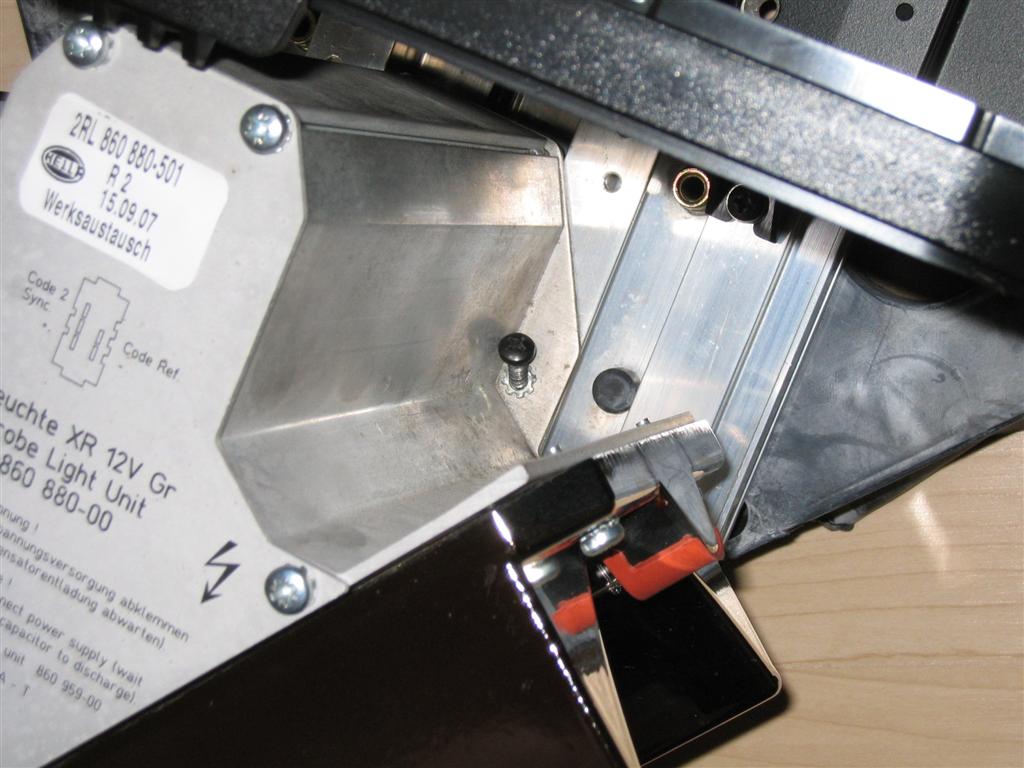 Jeder, der schonmal ein KL-XR Modul in eine RTK 6 eingebaut hat kennt das Problem: "Wie zum Geier bekomme ich die hinteren beiden Schrauben incl. Zahnscheiben reingedreht?!?!" Ich habe da eine gute Methode, die ich kurz vorstellen möchte: Zuerst braucht man einen langen Schraubenzieher: Das KL-XR Modul ganz vorne an der Schiene aufsetzen. Dann die Zahnscheibe auf das Loch legen und die Schraube schräg nach hinten in das Loch legen, sodass sie angewickelt steht: Nun das Module mit beiden eingelegten Scharuben gaaaanz behutsam nach hinten schieben, bis man über dem Loch ist: Zum Schluß vorsichtig mit dem Schraubenzieher und einer Taschenlampe die jeweilige Schraube ins Loch schubsen und festziehen. Man braucht zwar fast immer mehrere Versuche aber ab Schluß klappts immer. |