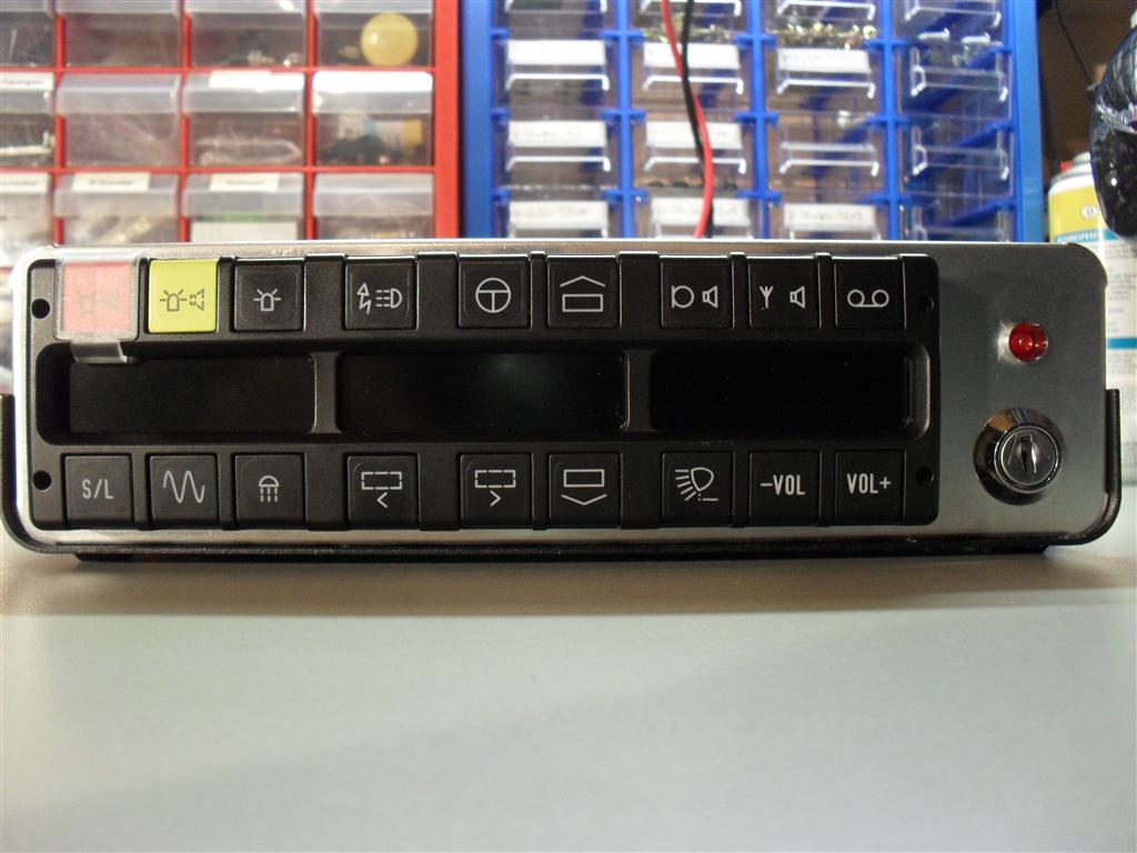 Von vorne findet man bei meinen Bedienteilen nur das eigentliche Bedienelement sowie ggf. einen Schalter zur Simulation der Zündung oder Kontrollleuchten zur Anzeige wichtiger Funktionen („Zündung ein“, TEST-Lautstärke-Absenkung).