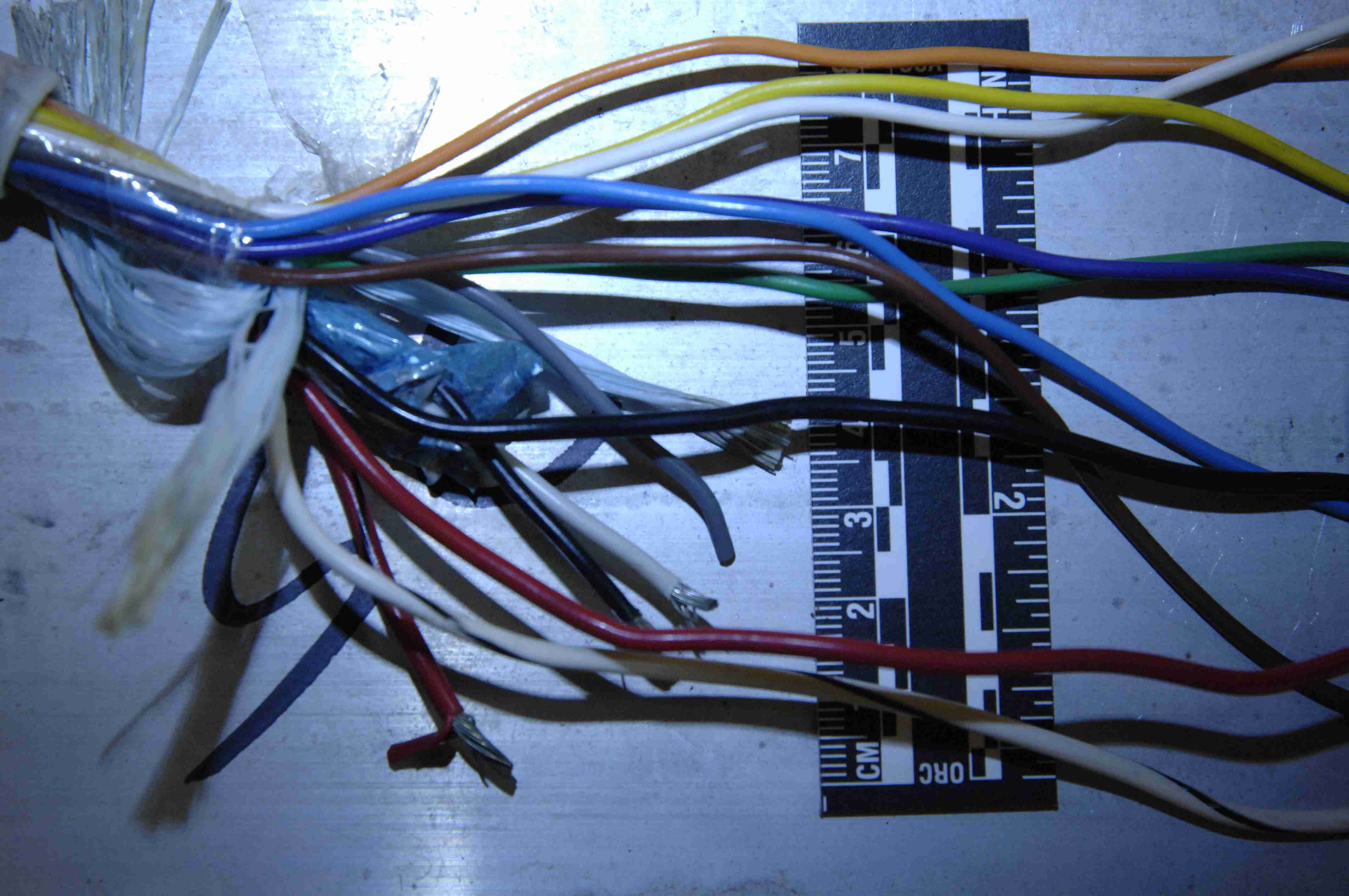 Schwarz, Rot, Rot-Schwaz, Weiß, Weiß-Schwarz, Braun, Violett, Orange, Gelb, Grün und Grau. Aus einer isolierten Ader im Kabelbaum kommen nochmal Schwarz und Weiß, allerdings dünner. |