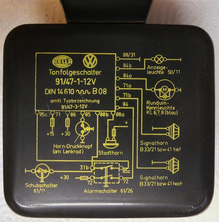 Wie man sieht, zeigt er neben dem Hella- auch das VW-Logo. Als Kennleuchte ist die KL 6/7/8 genannt. Ist der genannte "Alarmschalter 61/26" der Knebelschalter mit der ALARM-Aufschrift? Weiß jemand, wie der originalgetreue "Schubschalter 61/11" aussieht? Sehe ich das richtig: das Horn wird über diesen Schubschalter ausgelöst und die Klangfolgeverriegelung wird durch die zusätzliche Schaltung des Horns über den Alarmschalter erreicht? |