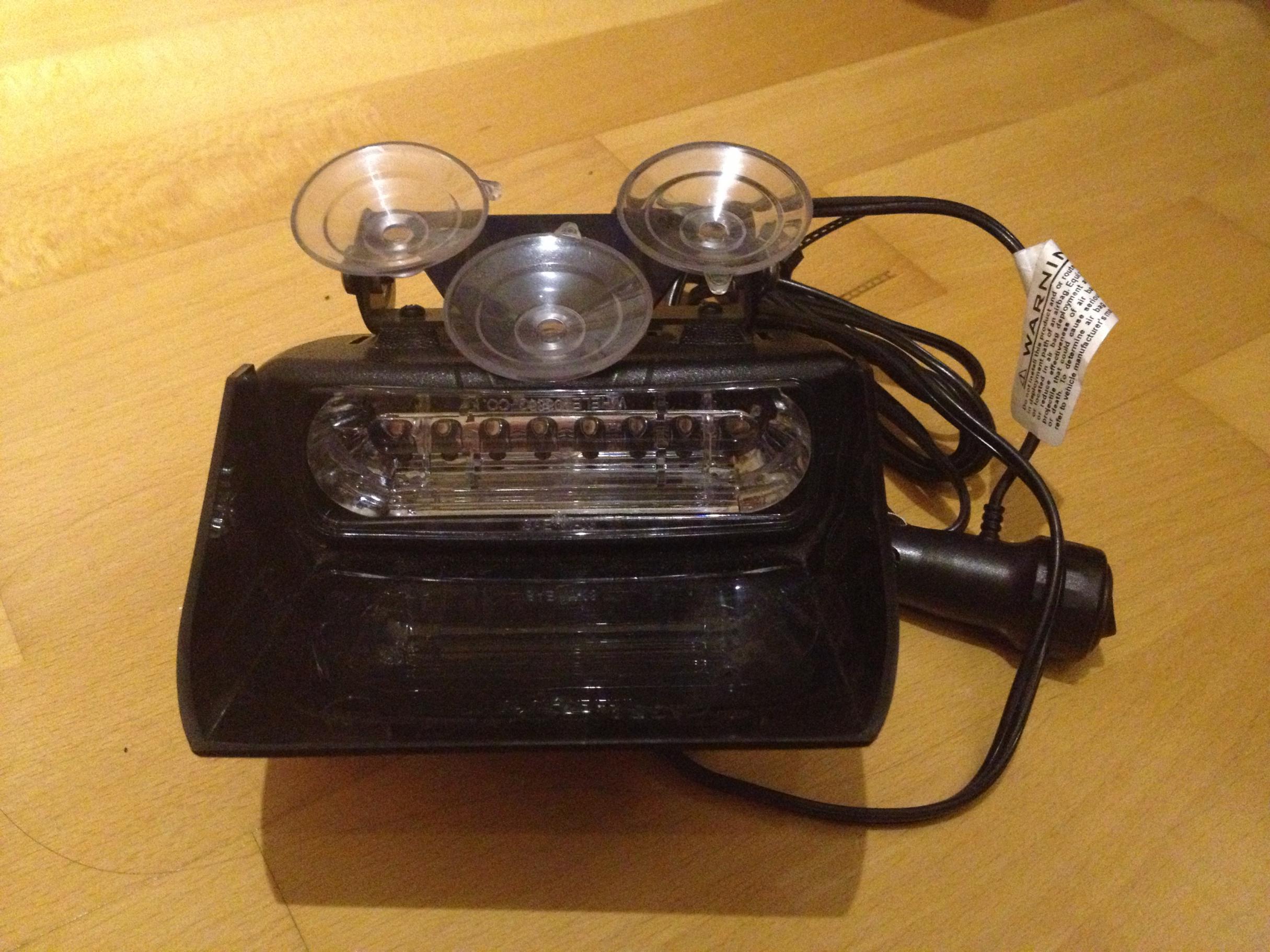 Zwei große Saugnäpfe hinten, ein kleinerer vorne. Blitzmuster werden am Stecker umgeschaltet.