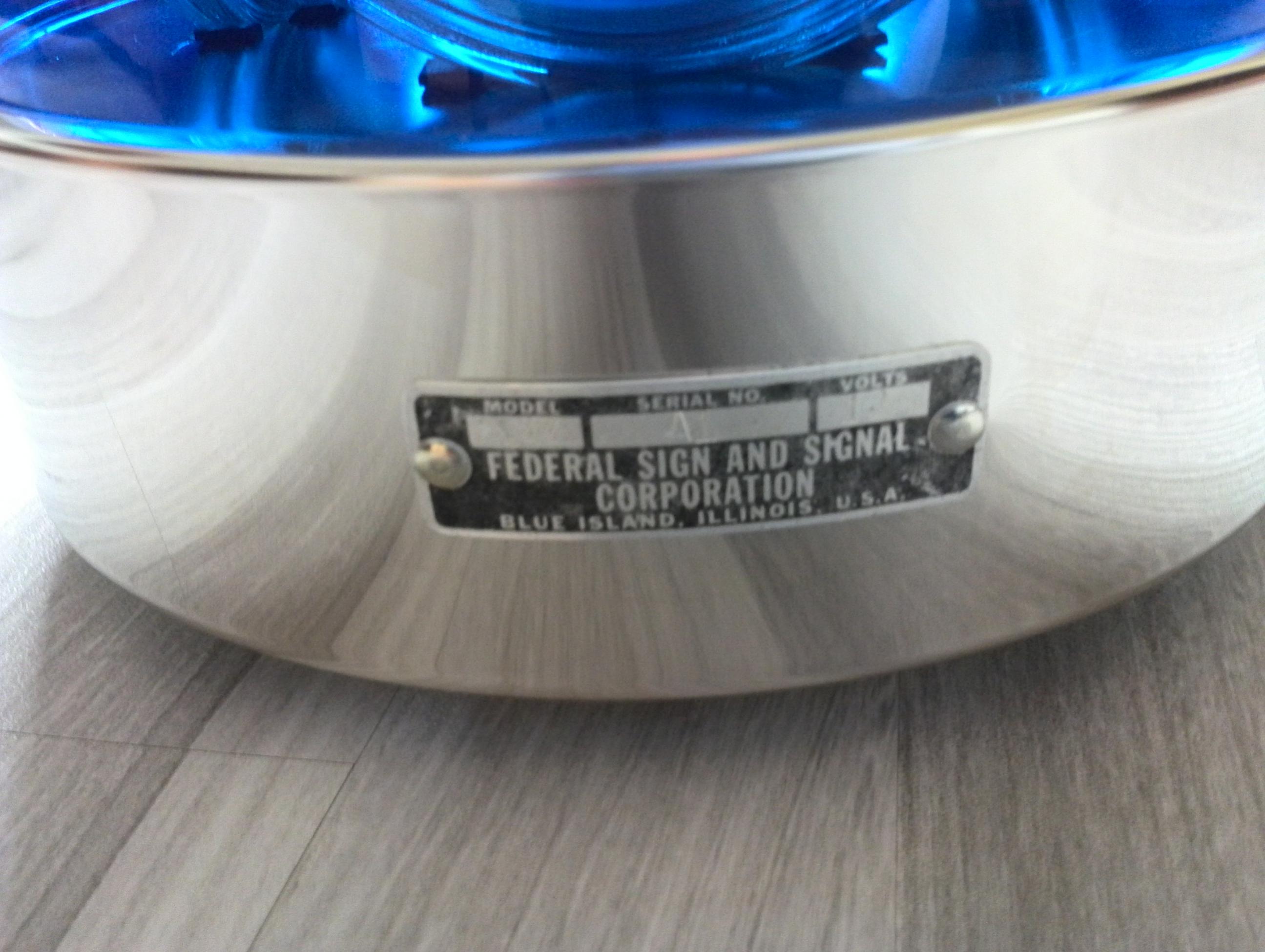 Eine Federal Signal Model 044. Es ist quasie die selbe Leuchte wie die Model 14 aber mit anderem Innenleben. Es sind 4 Sealed Beam Leuchten fest verbaut die im Wechsel blinken. Hier ein paar Bilder der Leuchte vor und nach der Restauration. Und hier noch ein Video: https://www.youtube.com/watch?v=Mj_izXHpEIg |