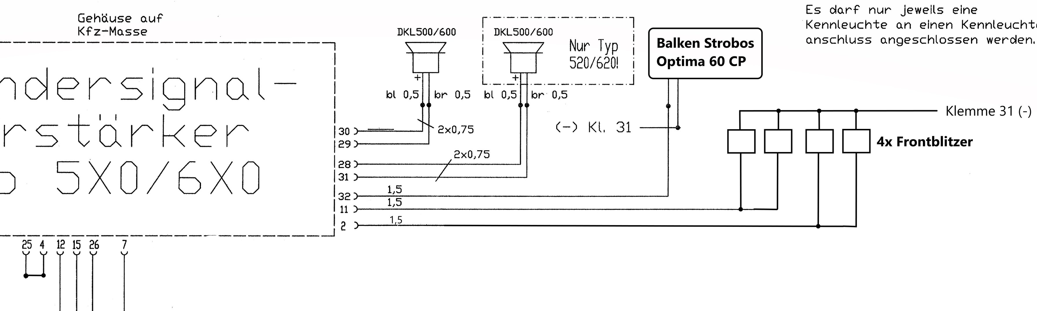 Theoretisch müsste ich doch auch hieran zwei Frontblitzer und an den Kennleuchtenausgang für die rechte Kennleuchte die anderen zwei anschließen können, sofern ich den "Einschaltpin" (4) für die Hinterleuchtung auf das Signal des Kennleuchtenkontrollausgang von links lege, oder? Hänsch sagt zwar, dass pro Kennleuchtenausgang nur eine Kennleuchte angeschlossen werden darf - macht es da ein Problem, eine zweite anzuschließen?