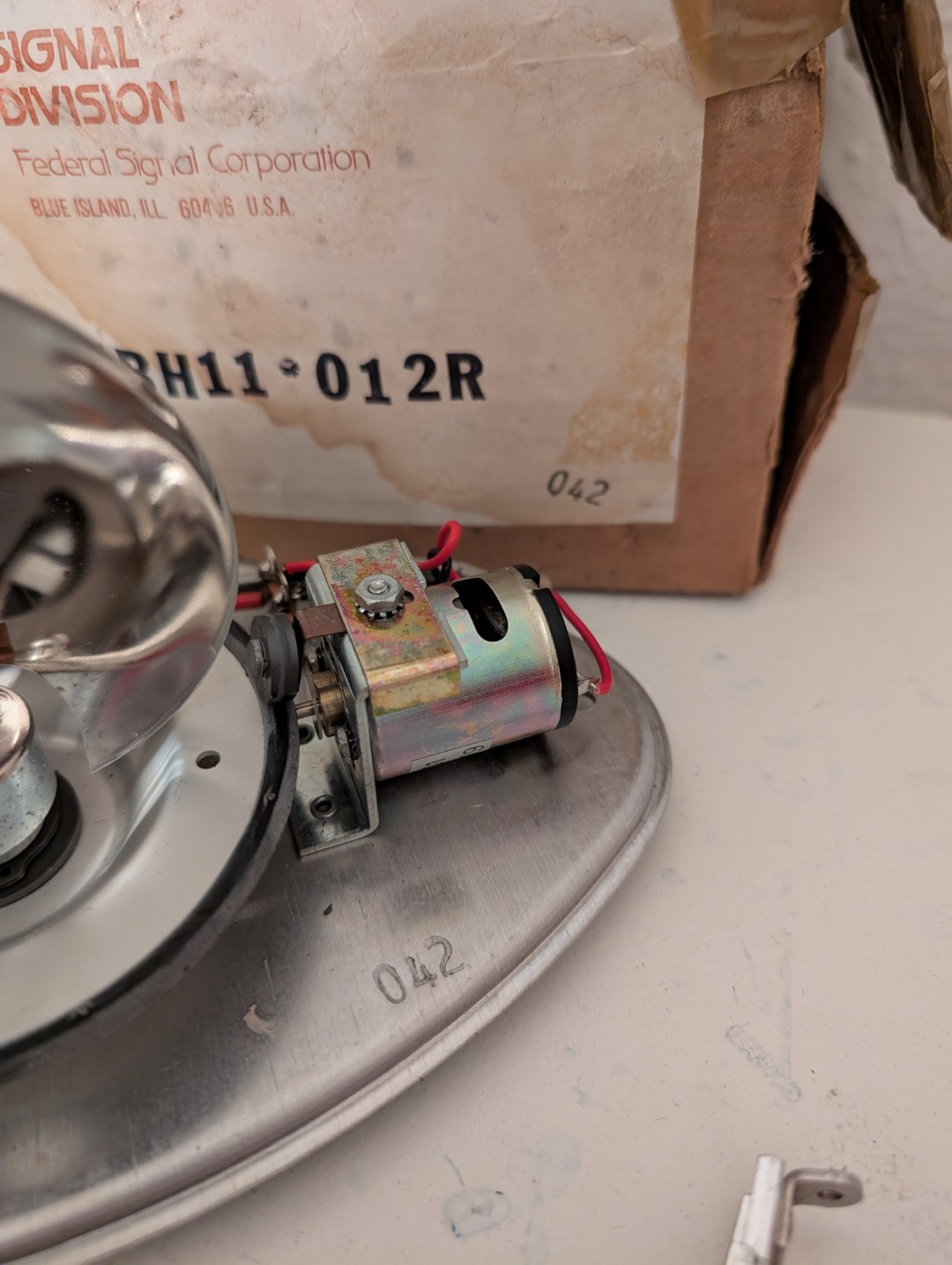 Typ: Fireball Model: FBH11 Series: A2 Volt: 12V Produktionsjahr (laut Motoraufkleber): 1979 Warum in den USA suchen, wenn man hierzulande auch noch US Leuchten in Originalverpackung und mit vollem Zubehör findet... Diese Fireball hat wenig Frischluft gesehen, denn außer etwas Flugrost am Magnet ist sie in tadellosem Zustand. #042 auf Karton und Leuchte, also passend. Label und Haube sind Neuzustand. Im Lieferumfang war neben der Leuchte die Anleitung, der Blendschutz und die Montageplatte. |