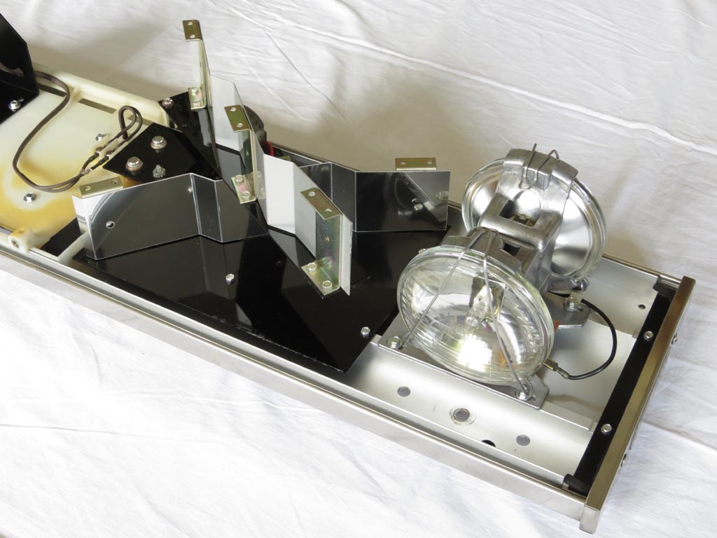Der Balken kam zwar dreckig aber dafür nahezu komplett und in einem brauchbaren Zustand bei mir an. Selbst der Versand konnte ihm keinen weiteren Schaden zufügen. ![]() Da es sich beim Vorbild um einen mit Halogen-Leuchtmitteln bestückten TwinSonic handelt und auch in diesem hier schon PAR36-Leuchten in Halogen Technik verbaut waren, habe ich den ursprünglichen X in ein Q umgelabelt. Ist jetzt also ein 12Q mit DUAL DIRECTIN FLASHING CONVERSION KIT. Da das "Original" (wenn auch nur nachgerüstet) mit X-Spiegeln ausgestattet ist und diese sich noch (incl. der Halter) in einem relativ guten Zustand befanden, sind sie gereinigt und aufpoliert wieder an ihren angestammten Platz gekommen. Der Motor-/Getriebehalter war nicht ganz so gut erhalten, sodass ich mich dafür entschieden habe ihn neu zu lackieren. Hat es so zwar nie gegeben aber in schwarz (passend zu den Blechen) gefällt es mir ganz gut. Außer den üblichen Reinigung- und Polierarbeiten durfte ich zusätzlich noch einige abgerissene Schrauben ausbohren und neue Gewinde schneiden. Wo ich schon dabei war, habe ich alle Gewinde nachgeschnitten und bei der Montage gleich auf neue Schrauben zurückgegriffen. Hier nochmal ein direkter vorher/nachher Vergleich: Aufbau/Technik: Die Basis bildet ein stranggepresstes, eloxiertes Alu-Profil (Frame), auf dem die weiteren Komponenten montiert werden. Die beiden Lampenhalter, die Endkappenhalter sowie die LSP-Abdeckung sind direkt montiert. Die Motor-/Getriebeeinheit und die Spiegel werden mittels einer Grundplatte auf dem Frame montiert. Die Hauben werden außen von den (mit den Typenschildern versehenen) Endkappen und innen von der LSP-Abdeckung gehalten. Die beiden Lampenhalter, die sich gegenläufig drehen, werden über Antriebsketten von einem gemeisamen Motor angetrieben und sind somit miteinander syncronisiert. Die Ketten werden über ein Schneckengetriebe angetrieben und können mittels Langlöcher in den Grundplatten der Lampenhalter gespannt werden. Da sich die Lampenhalter (mit je zwei PAR36 Leuchtmitteln) mit drehen sind zur Spannungsversorgung der Leuchten (pro Lampenhalter) ein Schleifring und zwei Kohlebürsten notwendig. |