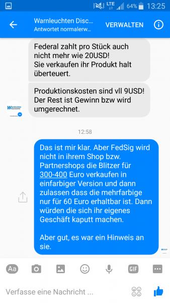 Gestern entdeckt: http://warnleuchten-discounter.de/Da...-S2-MultiColor Wird sich um die Fakes handeln oder? Hab die drauf hingewiesen aber sie probieren sich das gut zu reden und meinen, dass FedSig auch in China baut und man es aldo nicht wissen kann. Aber dass der einfarbige originale 300-400 Euro kostet und der mehrfarbige angeblich-origina nur 60 kosten soll, glaub ich da nicht dran. Da würde sich FedSig ja das eigene Geschäft kaputt machen. Mein Kommentar unterm Facebook Beitrag haben sie leider gelöscht, weil sie es nicht hören wollten und der Öffentlichkeit preisgeben wollten. Im Privatchat auch eher weniger bereit zu schreiben. |