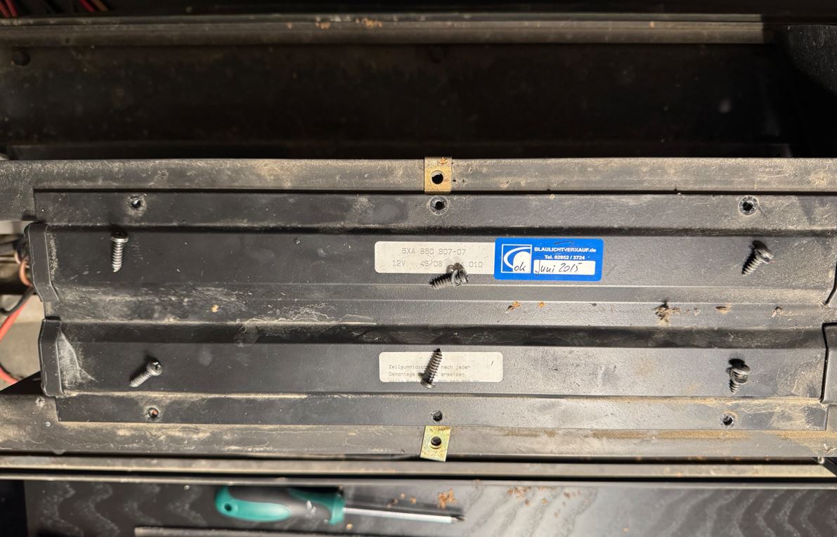 Eine Hella RTK 6-SL LED, der Preis lag im mittleren zweistelligen Bereich. Also bin ich kurzerhand in die niedersächsischen Landeshauptstadt gefahren und habe den Balken (ohne lange Begutachtung) eingesackt! Zuhause dann ein erster vorsichtiger Blick ins innere: Zuerst wusste ich nicht, wozu diese Relais verbaut waren aber die Vermutung lag nahe, dass die für evtl. Frontblitzer montiert wurden ![]() Eine der beiden Hauben hatte ein bisschen viel UV-Strahlung abbekommen, aber ansonsten sind beide in einem tadellosen Zustand! Die Kabel waren leider teilweise durchtrennt aber die wichtigen Anschlüsse waren dran ![]() Da isser nun, dreckig, die Folierung vom Deckel bereits unschön gelöst aber schick isser! Als erstes dann mal den Deckel runter: Keine große Ausstattung, LSP-V der 2. Generation und ZSE (mit blauem Aufkleber )Und ich habe zahlreiche Bewohner gefunden, die mussten aber raus, der Mietrückstand war einfach zu groß! ![]() Die LED Module machen auf den ersten Blick einen guten Zustand! Der ganze Balken war dreckig, das hat auch vor dem Inneren der Hauben nicht halt gemacht, aber zum Glück nix schwerwiegendes! Frage ans Forum, was könnte da mal montiert gewesen sein? Nachdem ich den Balken komplett demontiert habe habe ich alles ordentlich gereinigt. Die schwarzen Seitenbleche sehen von unten absolut neuwertig aus. Ich habe 2 Fertigungsstempel gefunden, die auf eine Produktion im Jahr 2001 hinweisen. Die ersten Sachen sind bereits wieder montiert, demnächst geht es an die Verkabelung. Auf der Blende ist schwach zu erkennen, dass mal "FEUERWEHR" draufstand. Jetzt ist auch der Lautsprecher wieder sauber. Gedämmt habe ich ihn auch direkt, mit Schaumstoff. |