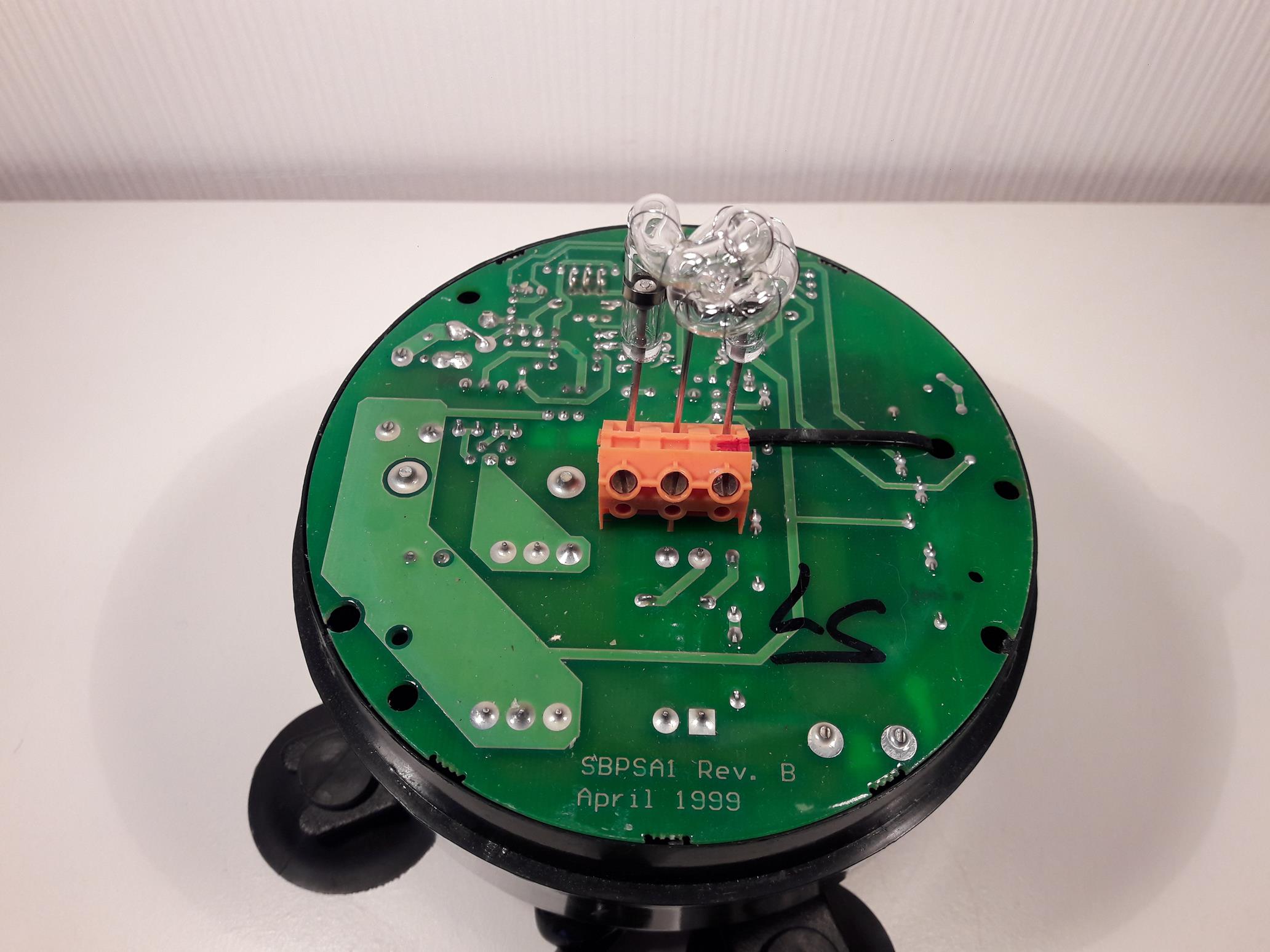 Es handelt sich dabei um eine Magnetkennleuchte mit Doppelblitz-Technik. Befestigt wird die Leuchte mit einem Ringmagneten. Zusätzlich sind vier Saugfüße um den Magneten angeordnet. Sie erhöhen die Rutschfestigkeit der Leuchte. Jedoch machen die Arme die 525 MX sperriger als andre Magnetkennleuchten. Das Bild zeigt die Unterseite einer AEB 525 M - die Gehäuseunterseiten sind jedoch identisch. Auf dem Leuchtengehäuse findet sich ein Warnschild, dass vor der Hochspannung in der Blitzkennleuchte warnt. Denn das Innenleben ist nach dem Lösen von drei Schrauben und dem Entfernen der Lichthaube frei zugänglich. Wie auf der Drehspiegelleuchte der 525er Serie sind auf der Lichthaube die Zulassungsnummern für gelbe und blaue Lichthauben angebracht. Nachdem die Lichthaube von der Leuchte entfernt wird, ist eine Fresnellinse erkennbar. Die Fresnellinse klemmt sich leicht mit dem dünnen, schwarzen Gummiring in die Lichthaube und steht auf einem weiteren Gummiring auf der Platine. Durch die Fresnellinse werden die Blitze gebrochen und sollen das Licht auf die gesamte Haube verteilen. Dieser Effekt verliert sich jedoch, je mehr der Betrachter mit der Leuchte auf Augenhöhe kommt - es ist nur ein heller Streifen (Blitzröhre) aus nahezu jedem Blickwinkel erkennbar. Am besten verteilt sich das Licht wenn man zu der Leuchte auf-, bzw. darauf herunter blickt. Die Fresnellinse kann in eine andere 525er Lichthaube gesteckt werden und aus einer blauen Doppelblitzleuchte wird eine gelbe. Im Inneren der Leuchte ist eine sauber aufgebaute, perfekt in das Gehäuse eingepasste Platine mit der Blitzröhre eingebaut. Die Blitzröhre lässt sich vom Endanwender mit drei Schrauben aus ihrer Fassung lösen. Auf der Unterseite der Paltine sind alle Bauteile für die Blitzelektronik angebracht. Blick in das Leuchtengehäuse. Die Blitzröhre erzeugt eine so große Wärme, dass sich die Lichthaube meiner 525 MX nach knapp einstündigem Betrieb ohne kühlenden Fahrtwind verformte. Die Wärmeableitung der 525 MX ist also nicht ausgereift. Im folgenden Bild ist links die AEB 525 MX und rechts die AEB 525 M zu sehen. Das dünne Kabel wurde zwischenzeitlich gegen ein dickeres und stabileres Kabel ausgetauscht. Im Stecker der MX ist eine 8 Ampere-Sicherung, die rote Hülse ist besser befestigt als bei der M: Die Hülse löst sich erst nach einer 1/8-Drehung vom Stecker. Die AEB 525 MX ist eine interessante Blitzleuchte. Für den Preis von etwa 250,- Euro darf man jedoch erwarten, dass sich die Lichthaube nicht verformt, wenn die Leuchte nicht im Fahrbetrieb benutzt/gekühlt wird. Im Fahrbetrieb ist die 525 MX eine gute Wahl, für die Absicherung im Stand ist sie wegen ihrer thermischen Schwächen nicht geeignet. Die Arme mit den Saugfüßen erhöhen zwar die Standsicherheit, machen die AEB 525 MX jedoch unhandlich. Ich persönlich halte die Leuchte nicht für den Dauer- und Profieinsatz geeignet. |
