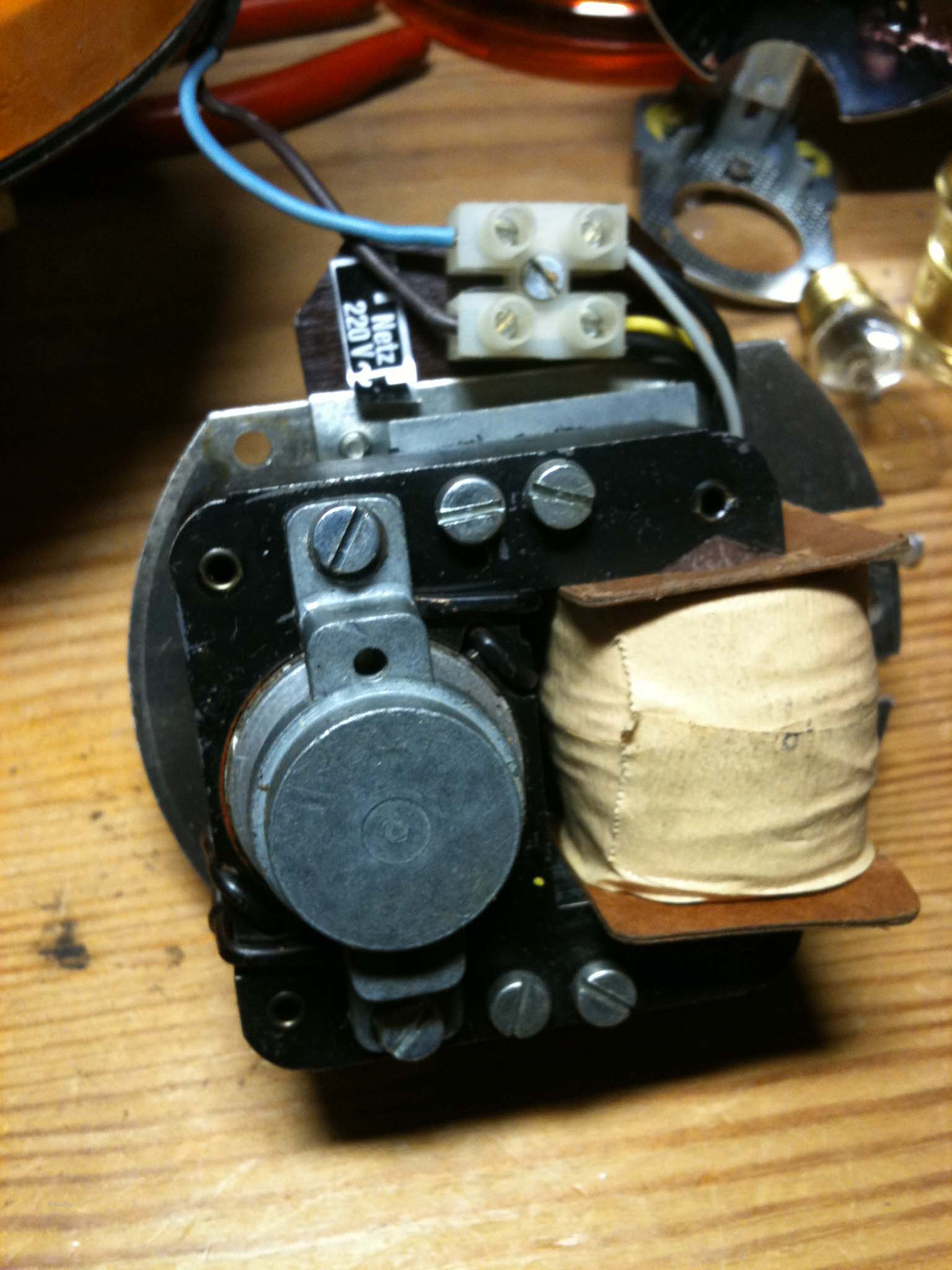 Streiflicht hat mich gerade eben unbewusst auf ein lange bei mir schlummerndes Problem gebracht: Meine Eisemann RWL 90 mit Blechspiegel dreht sich nicht, der Motor läuft aber. Grund: das Ritzel kommt gar nicht ans Zahnrad! Wieso auch immer, die Leuchte ist/ war unbenutzt. Wie kriege ich das Ritzel näher ran? Kennt jemand den Motor? (wieder nur Handyfotos)
