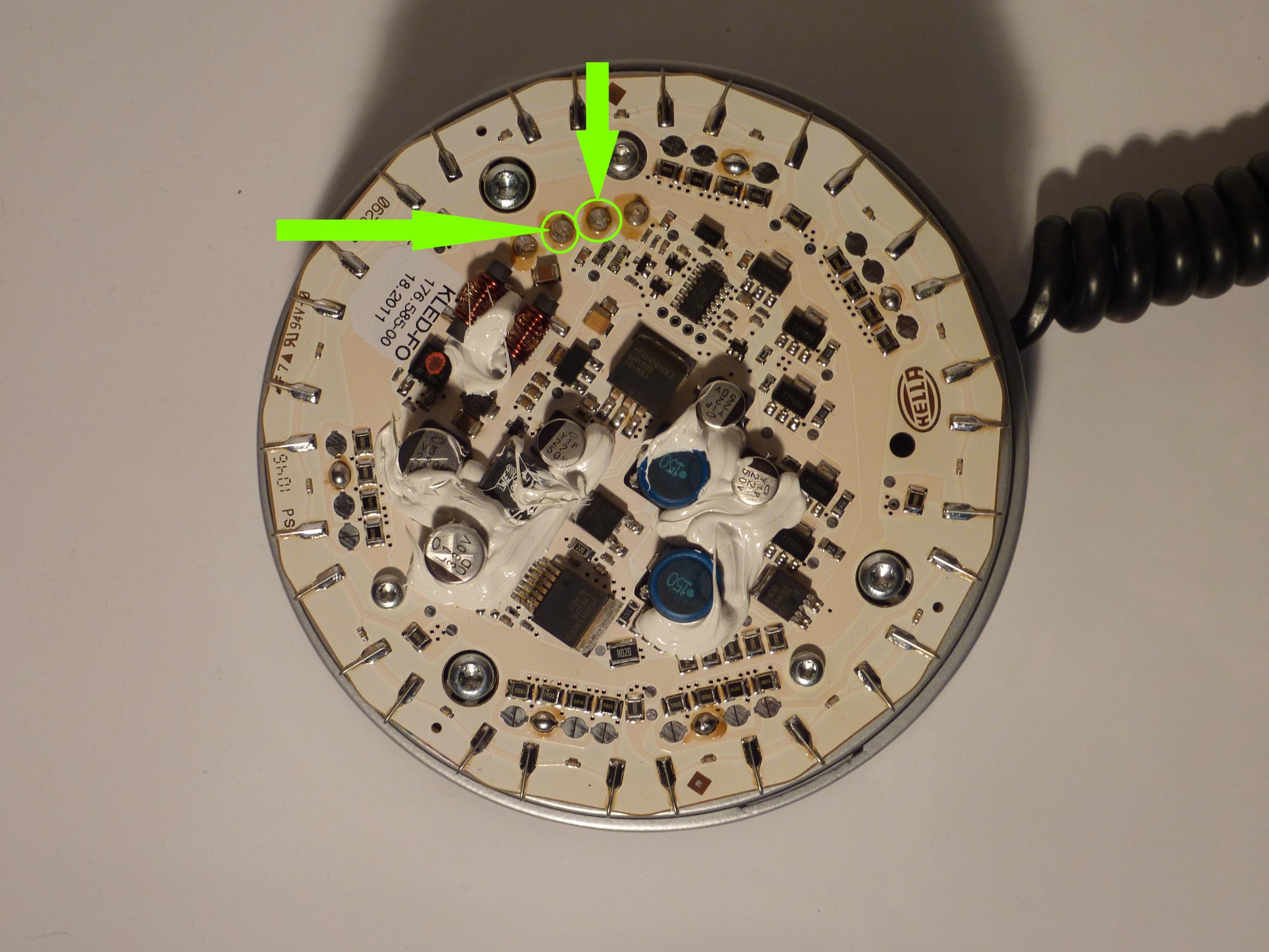 ich bin nun stolzer Besitzter von 2 Hella K-LED FO in Blau. aber.... Bei den "Gelben" kann man ja mit dem grünen Sync Kabel die Blinkfrequenz ändern, bei den Blauen gibt es dieses Sync Kabel nicht. OK, nicht lange gezögert und an der freien Lötstelle wo normalerweise das Sync Kabel liegt ein Kabel dran gelötet (Blau eingekreist auf dem Foto) und siehe da, es passiert nix. :-( Jetzt ist mir aufgefallen das auf der Platine Lötpunkte sind (Rote Keise auf dem Foto) die Teilweise verbunden sind und teilweise nicht. Kann ich damit eventuell die "Lampe" umcodieren so das sie meint sie wäre eine gelbe? Und ich dann die Blinkfrequenz bzw das Blinkmuster ändern und die Lampen Syncronisieren kann? Ich denke mal wenn Hella da komplett anderes Innenleben verbaut hätte wären da nicht 4 Anschlusspunkte für´s Kabel und das grüne Sync Kabel wäre nicht einfach oben und unten abgeschnitten, oder? Hat jemand eventuell eine gelbe K-LED FO von Euch und könnte mir mal ein Foto der "Lampe" machen so in der Art wie ich meine blaue fotografiert habe? Damit ich mal vergelichen kann wie es sich mit den Lötpunkten verhält, einfach so mal dran rum löten an den "Löt-Dipp-Schalten" möchte ich nun auch nicht ;-) Oder hat schon jemand erfahrung mit dem Problem gemacht? Gefunden hab ich leider nicht viel hier im Forum, außer das die Lämpchen zu dunkel wären ;-) Danke euch schon mal :-D |